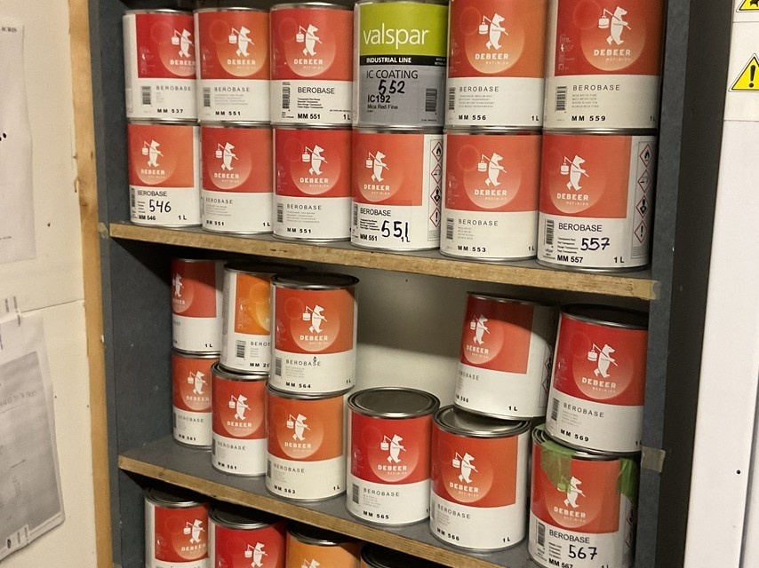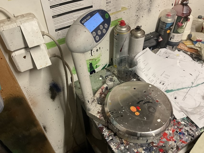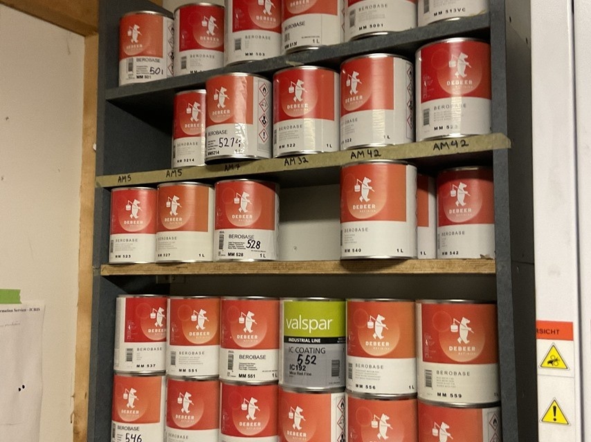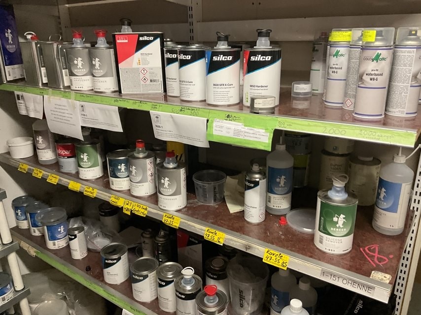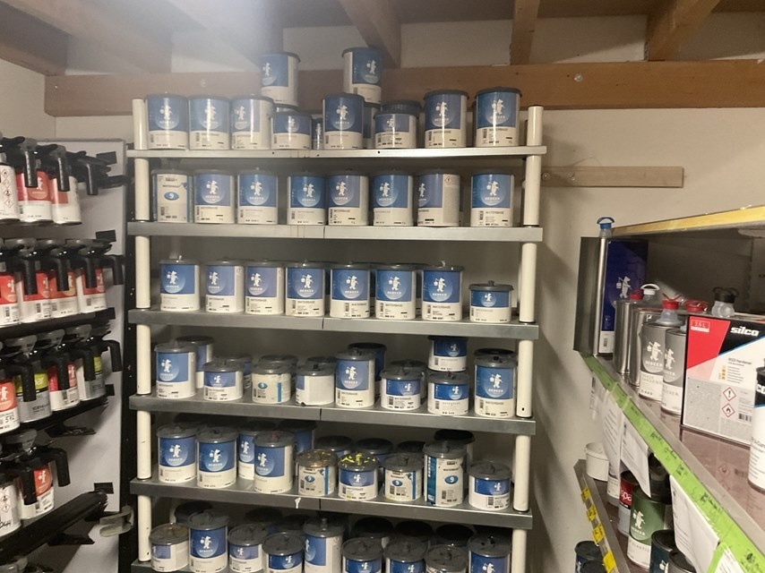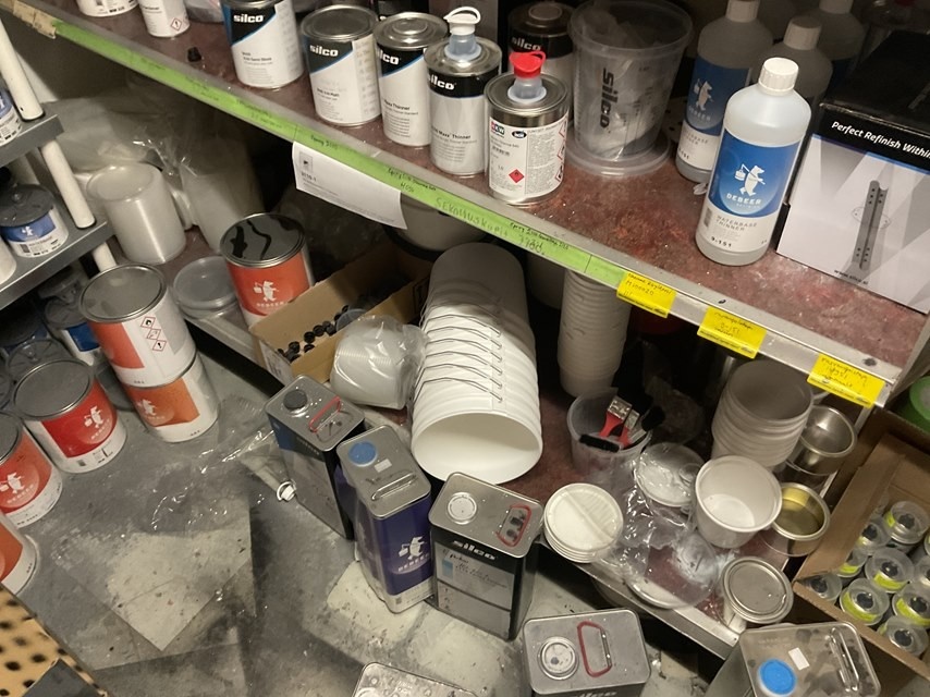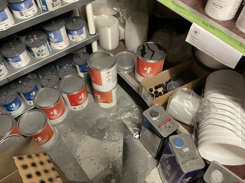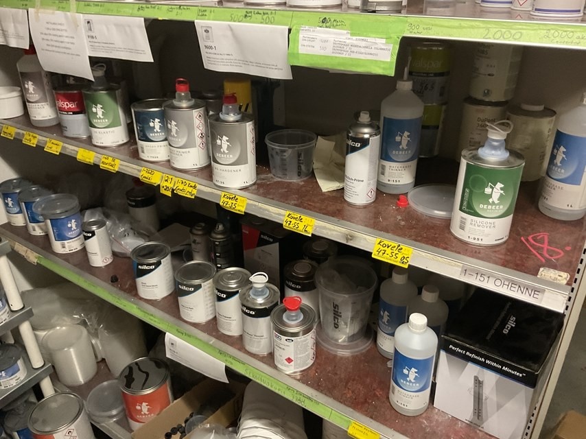 Myyntikohteet » 2. Kokemäen Varaosa / Kovatech Oy:n konkurssipesä, KOKEMÄKI (2136465-5), 14.03.2026 » 18. Maalinsekoitushuone koko irtain mm. sävytys- ja perusmaalit, ohenteet, vaaka, sekoituspöytä, astiat ja kupit, sprayt . Telineet ja ravistimet
