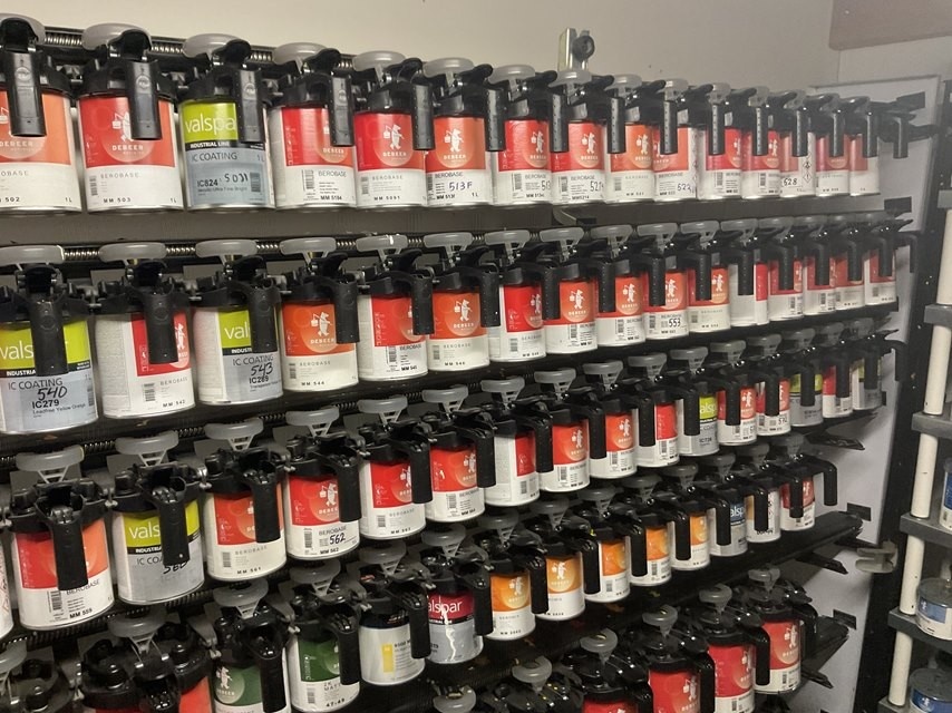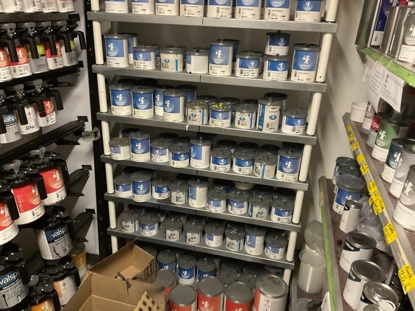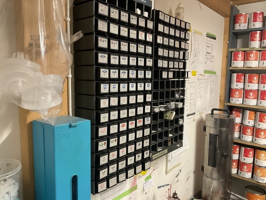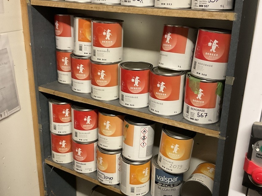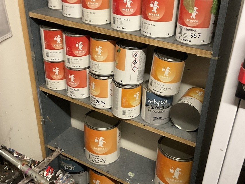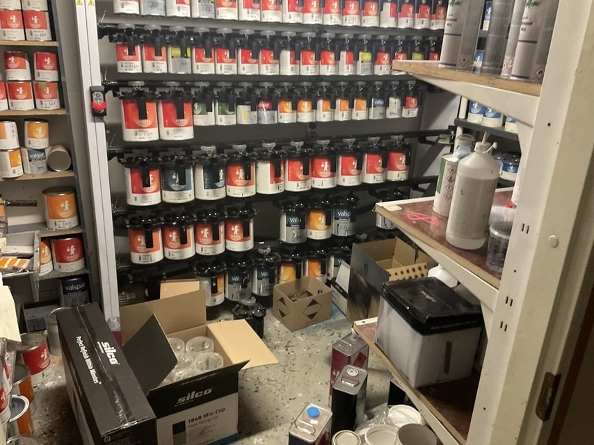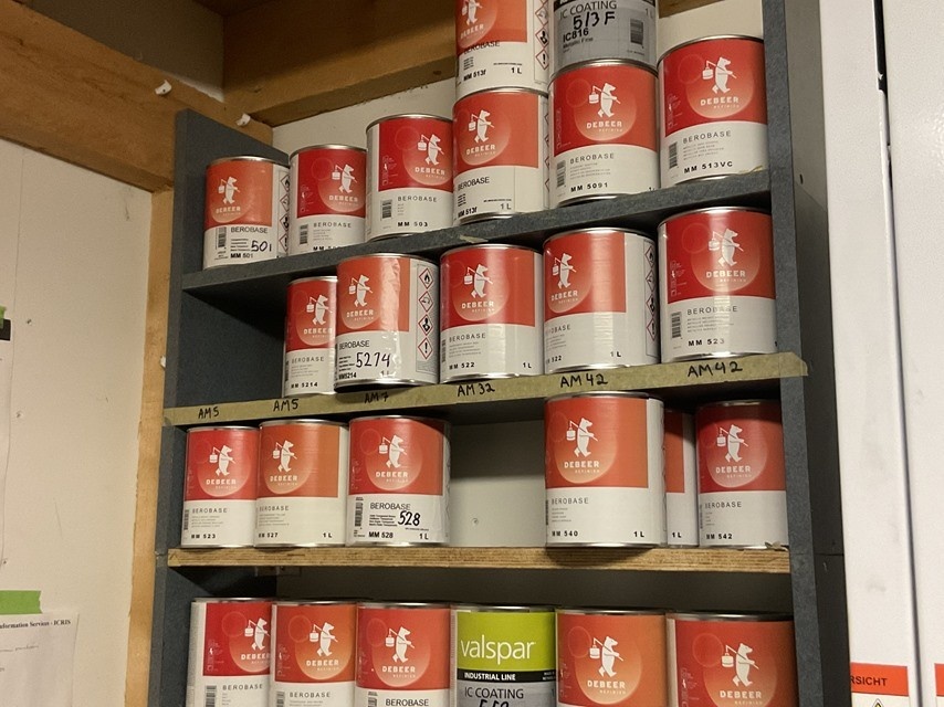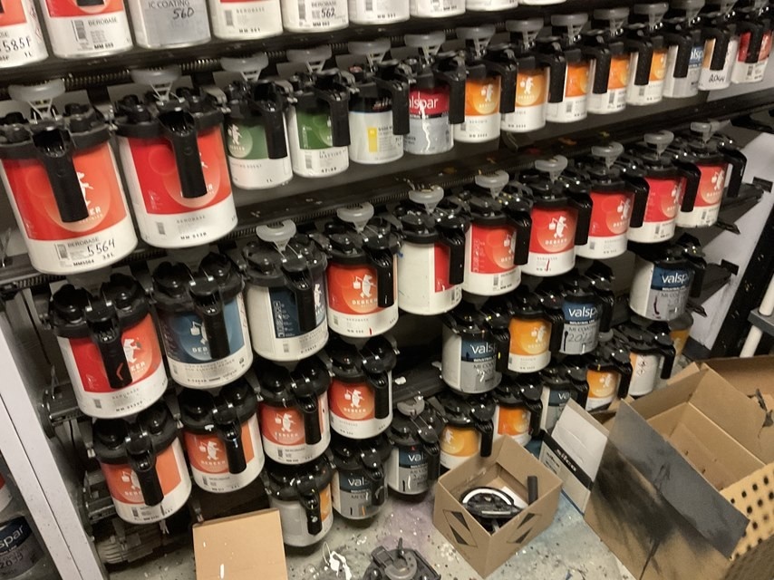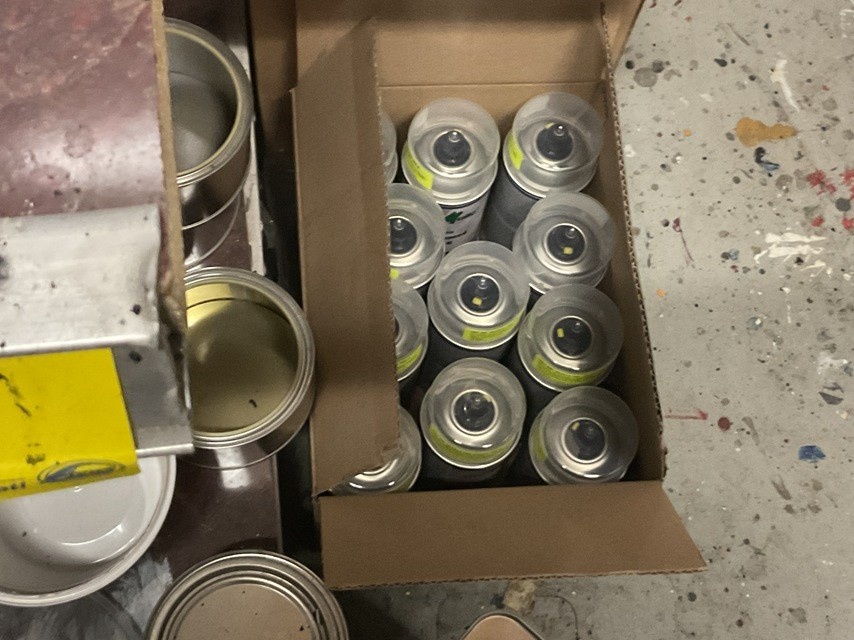 Myyntikohteet » 2. Kokemäen Varaosa / Kovatech Oy:n konkurssipesä, KOKEMÄKI (2136465-5), 14.03.2026 » 18. Maalinsekoitushuone koko irtain mm. sävytys- ja perusmaalit, ohenteet, vaaka, sekoituspöytä, astiat ja kupit, sprayt . Telineet ja ravistimet