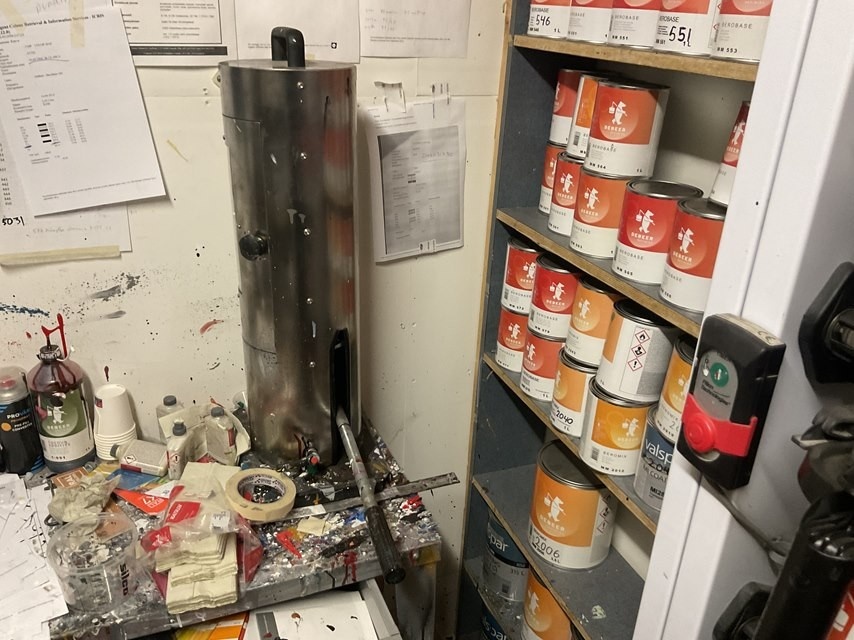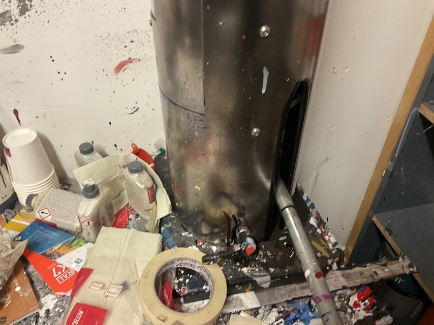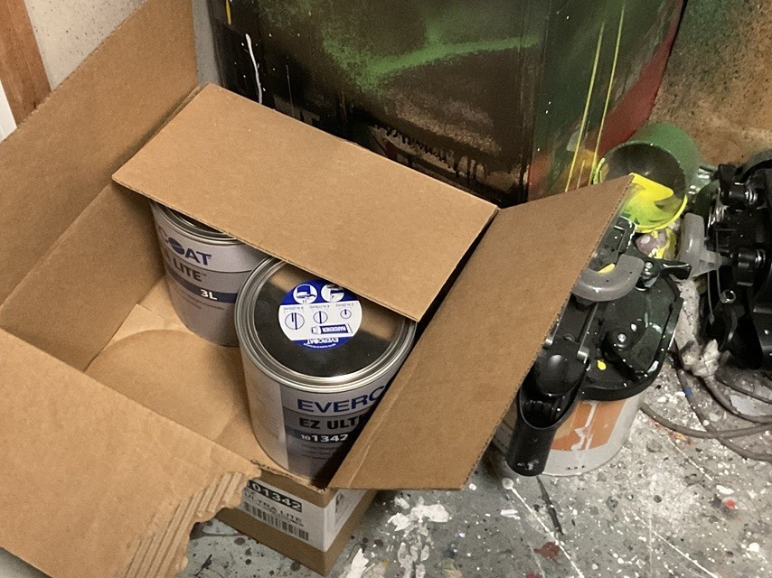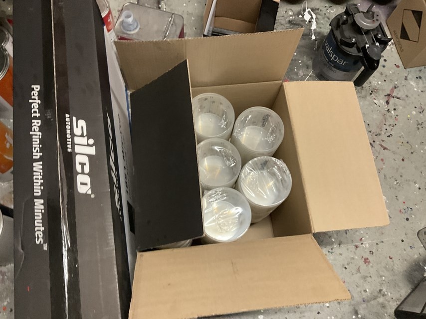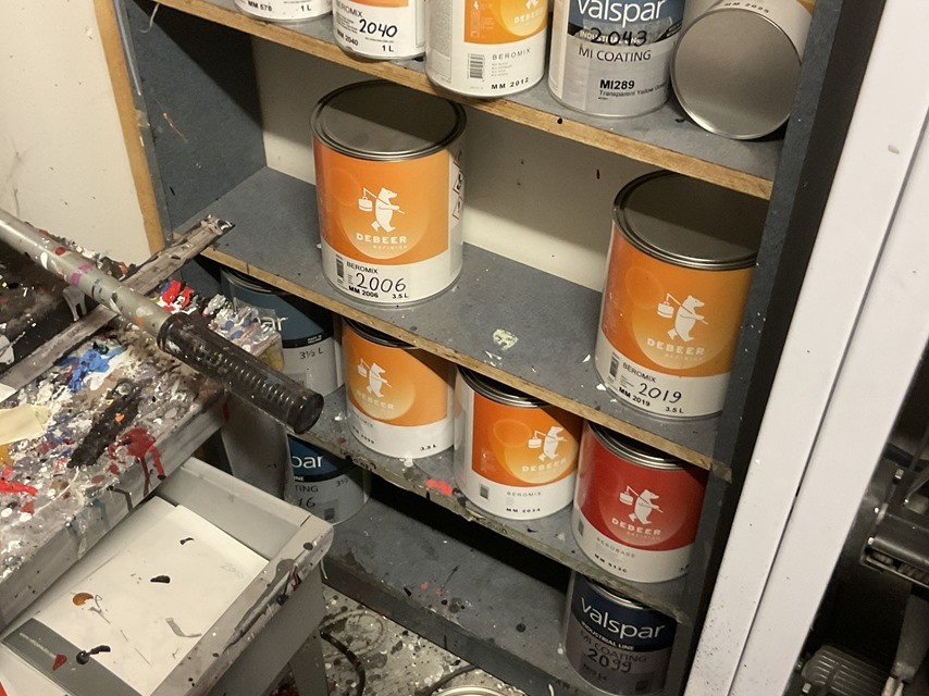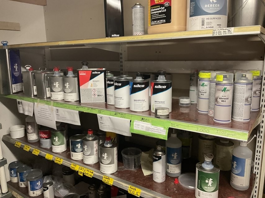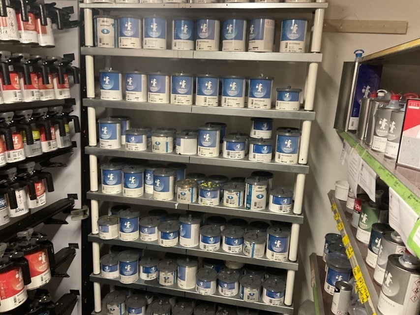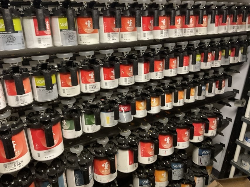 Myyntikohteet » 2. Kokemäen Varaosa / Kovatech Oy:n konkurssipesä, KOKEMÄKI (2136465-5), 14.03.2026 » 18. Maalinsekoitushuone koko irtain mm. sävytys- ja perusmaalit, ohenteet, vaaka, sekoituspöytä, astiat ja kupit, sprayt . Telineet ja ravistimet