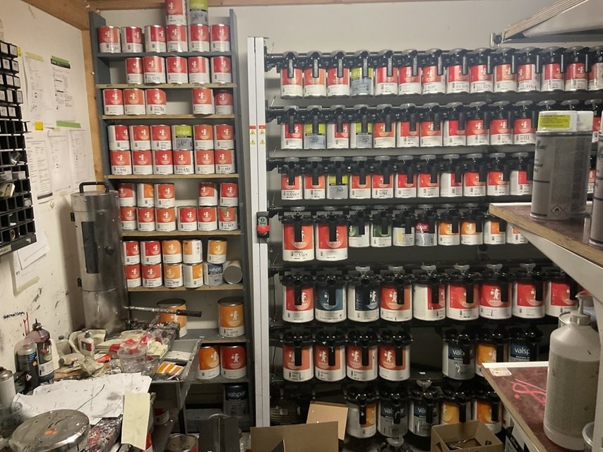Maalinsekoitushuone koko irtain mm. sävytys- ja perusmaalit, ohenteet, vaaka, sekoituspöytä, astiat ja kupit, sprayt