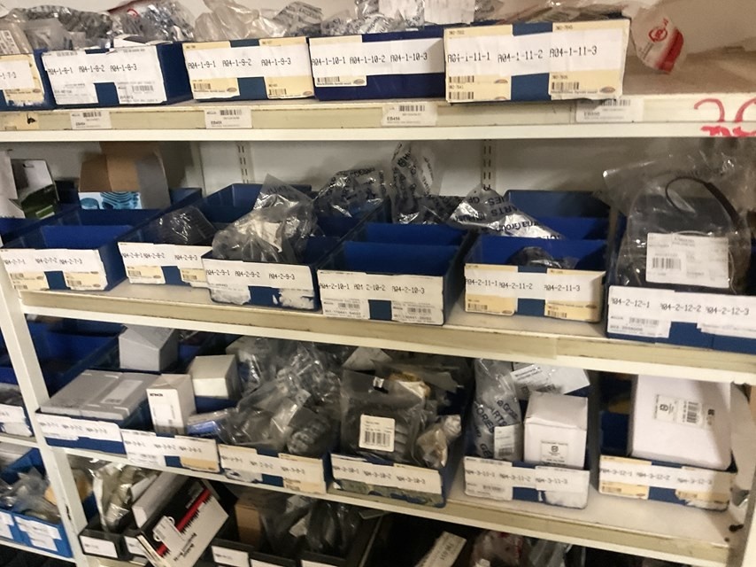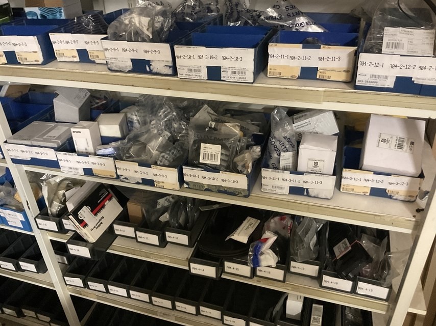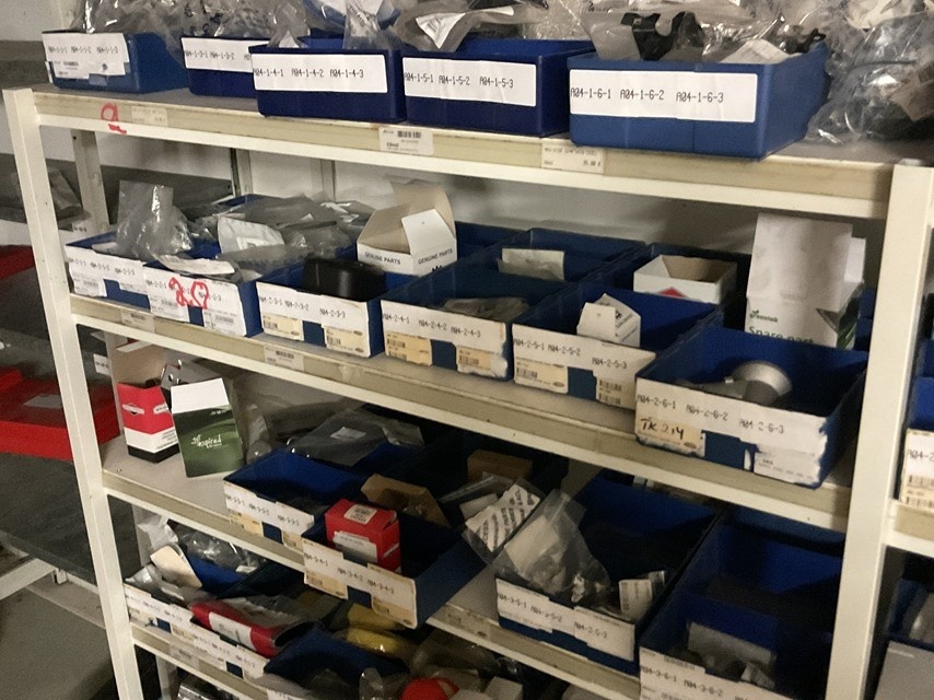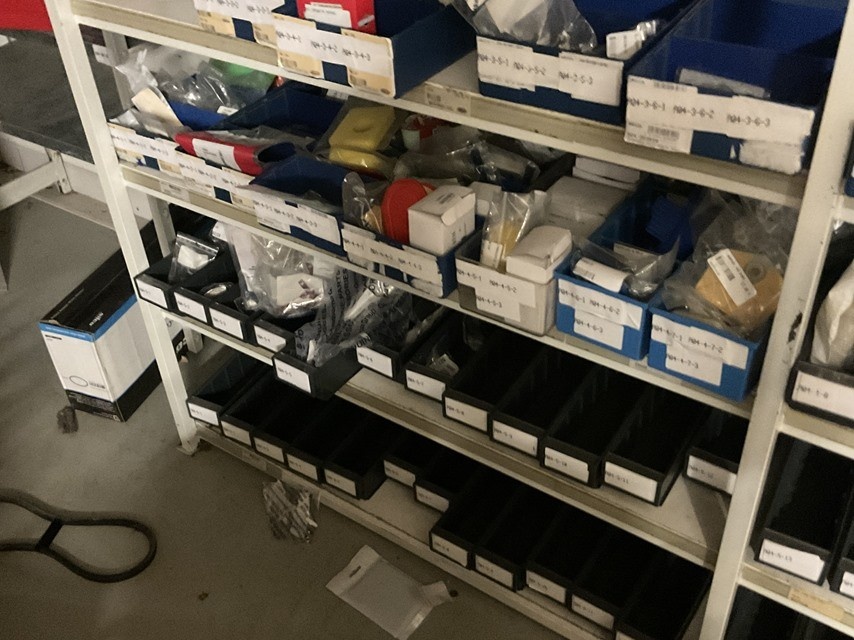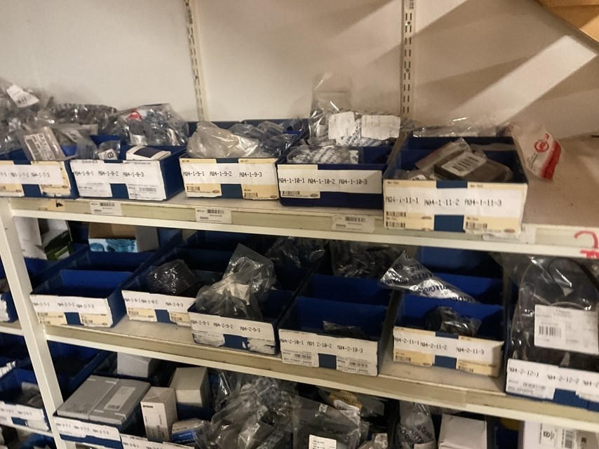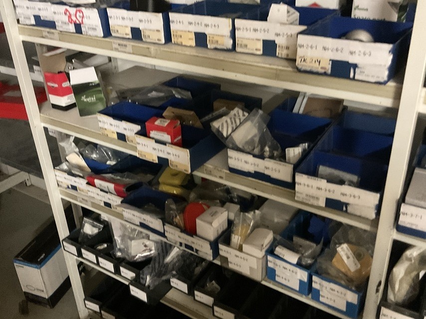 Husqvarna-(Genuine Parts) alkuperäiset pienosat hyllyssä, kahdessa hyllyvälikössä n. 38 laatikkoa (sinistä)