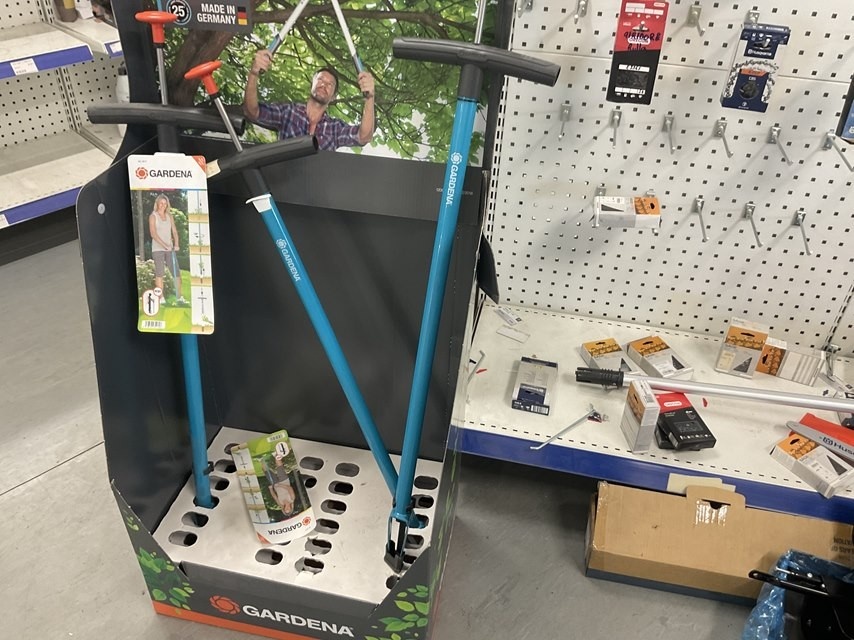 Myymälähyllyssä olevat Husqvarna tarvikkeet ja varaosat