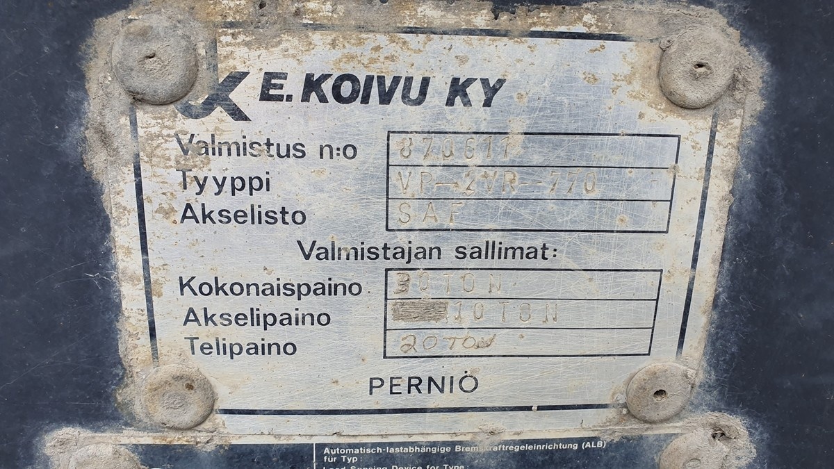 Myyntikohteet » 6. Infraneliö Oy:n konkurssipesä (1712325-0), VIITASAARI, 16.03.2026 » 03(49x). Vaihtolavaperävaunu EK-Koivu, vm. 1987
