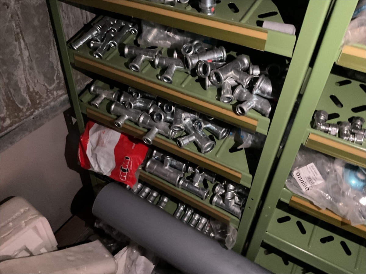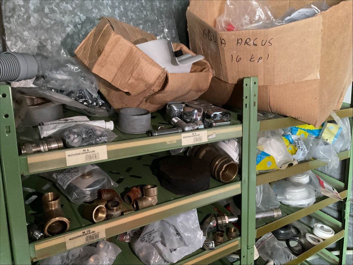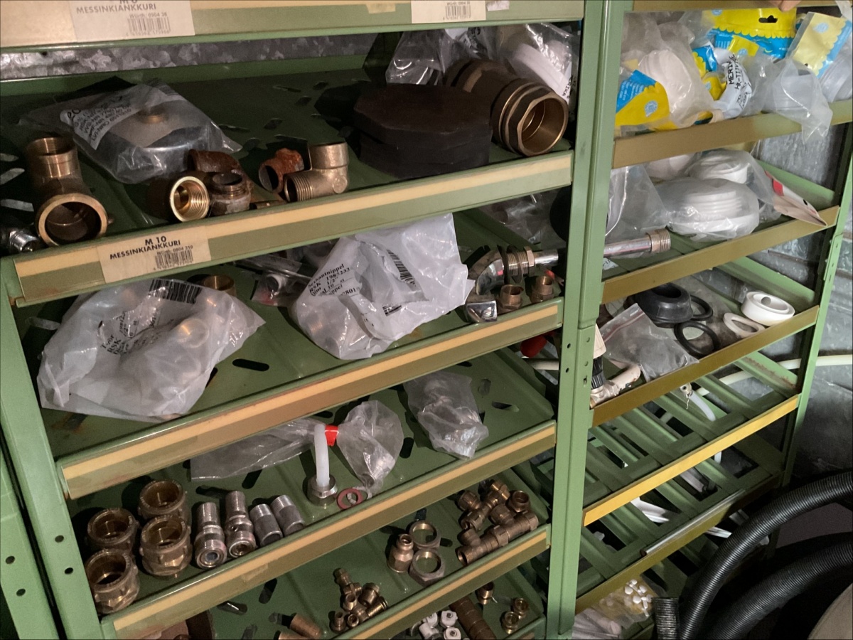 Varastokopissa olevat putkiosat, työkalut ja tarvikkeet (sis. kupariosat,puristusleuat ym.)