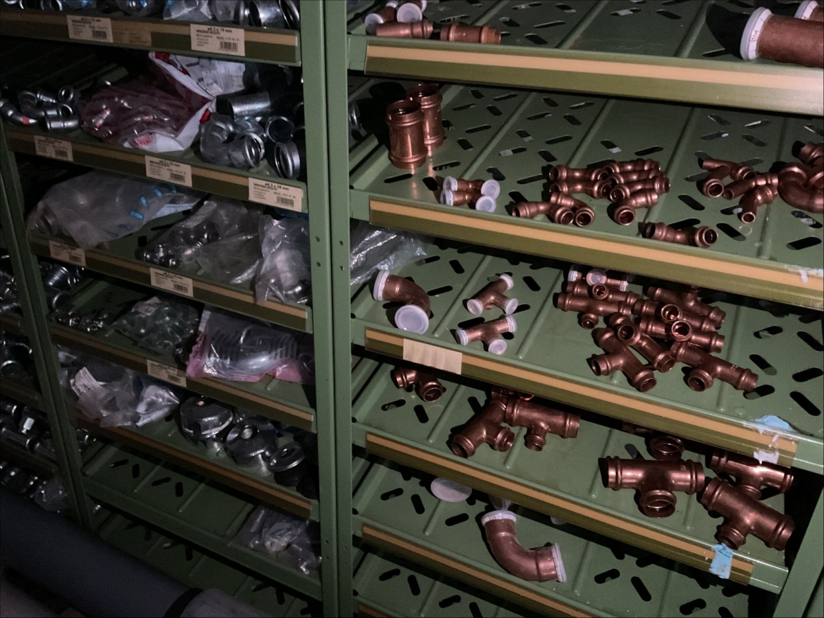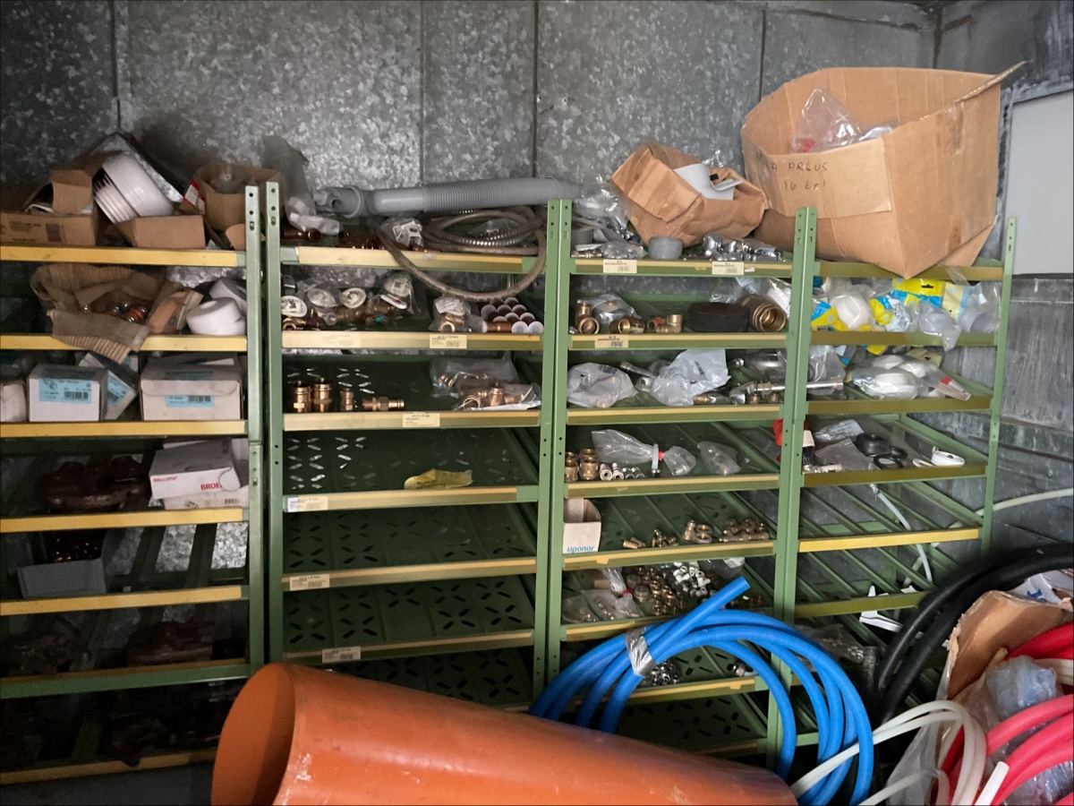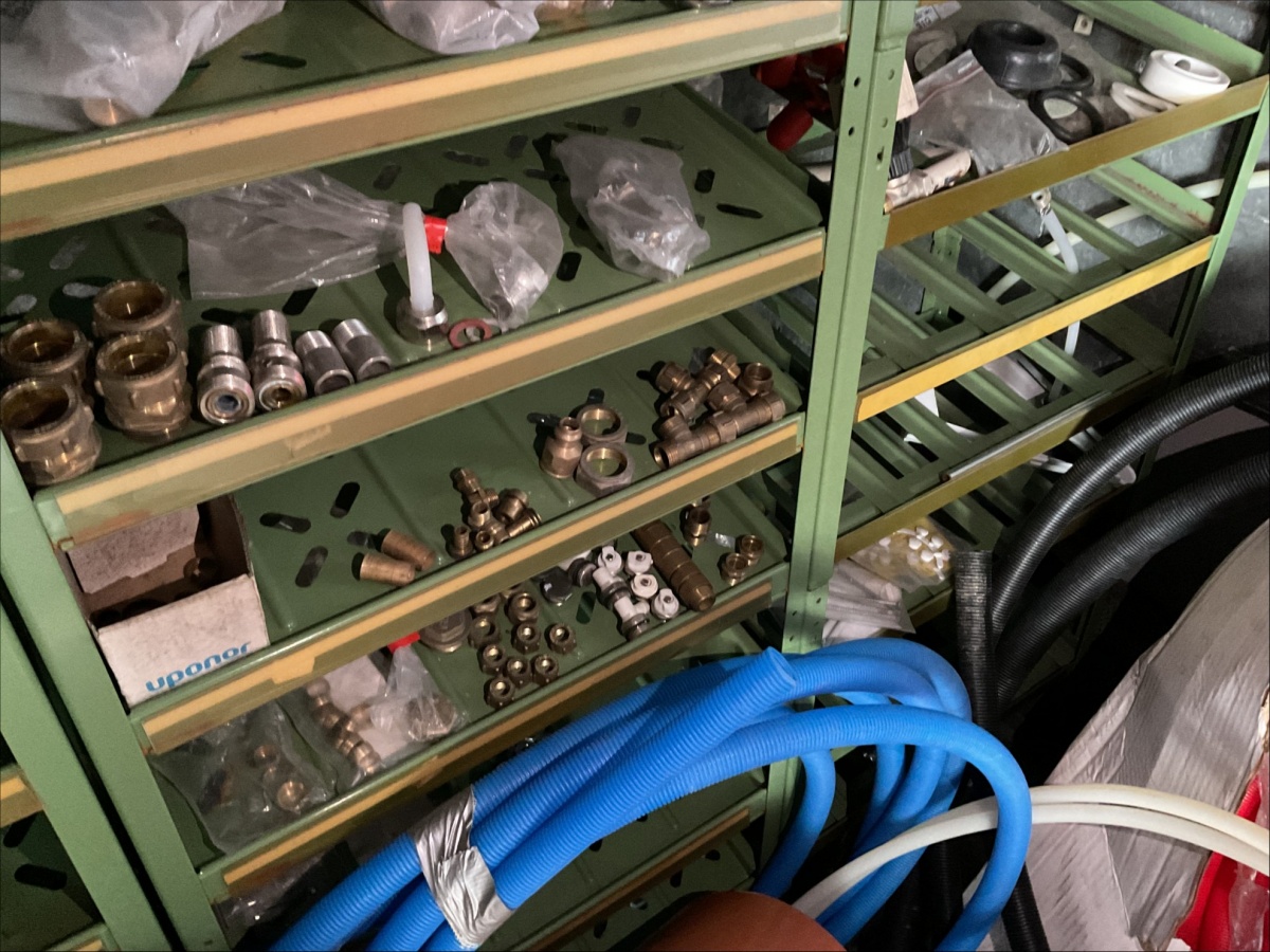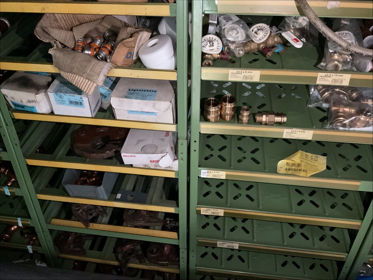 Varastokopissa olevat putkiosat, työkalut ja tarvikkeet (sis. kupariosat,puristusleuat ym.)