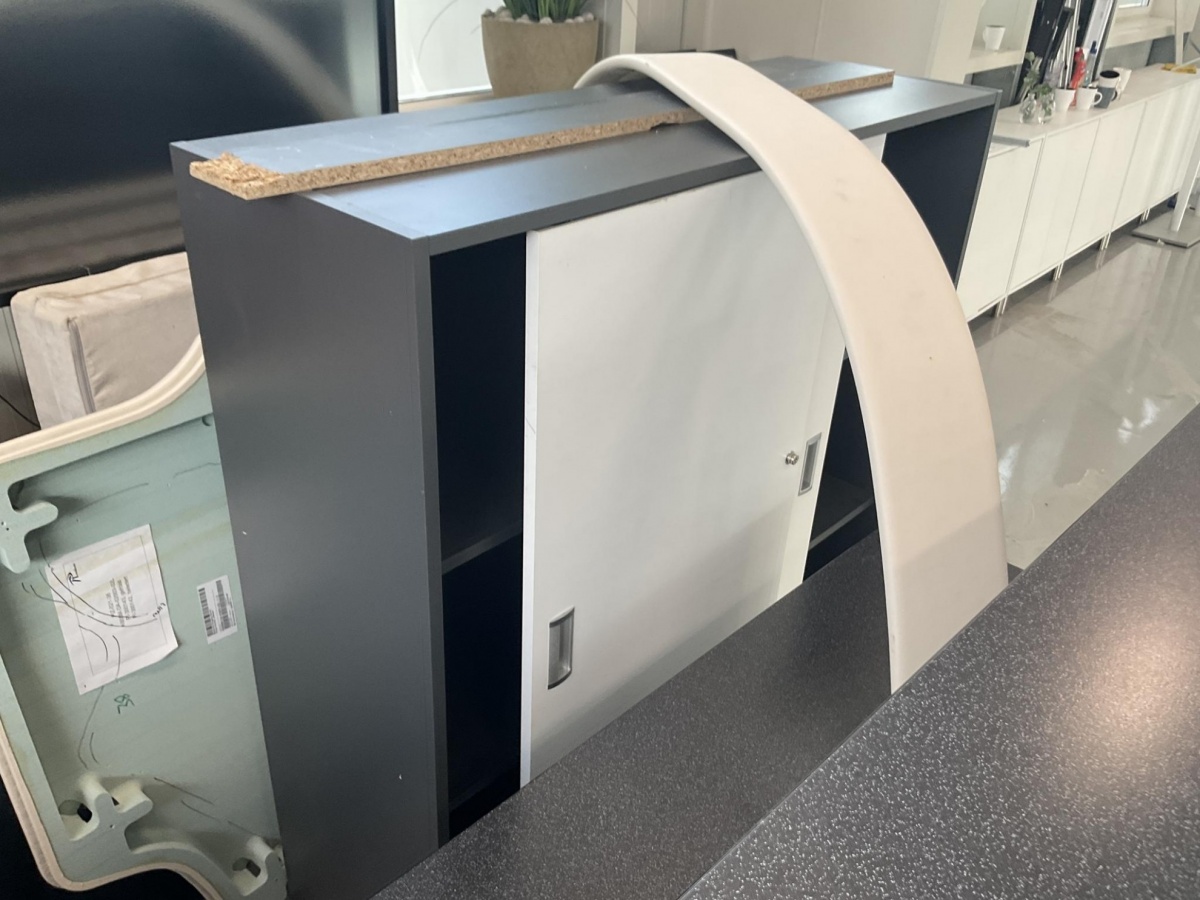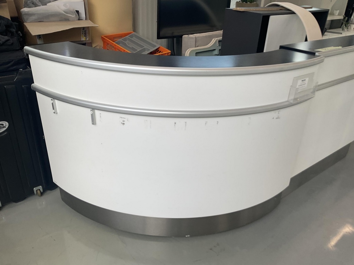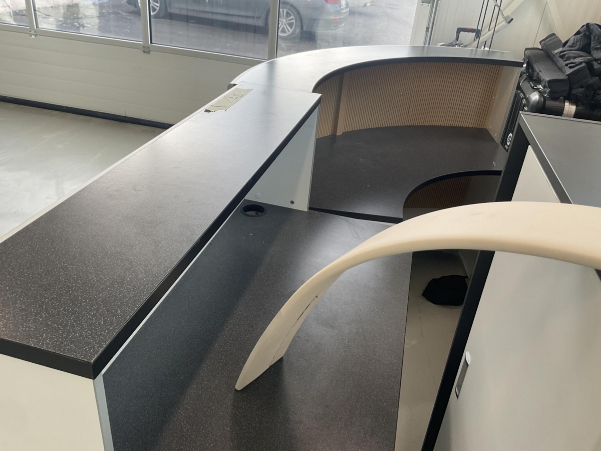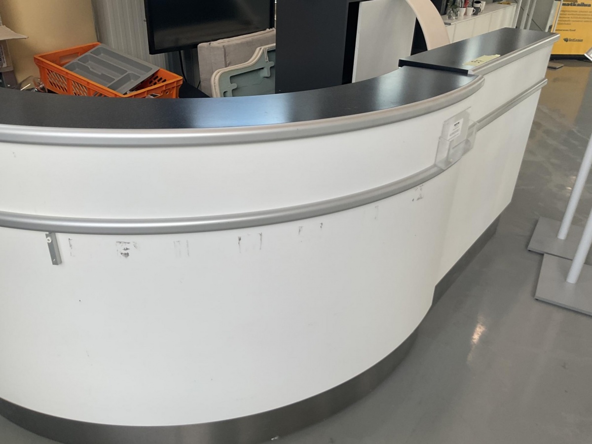 Myyntikohteet » 3. Best-Caravan Oy:n konkurssipesä, HYVINKÄÄ (1824257-7), 19.03.2026 » 097. Vastaanottotiski / palvelutiski (kaareva) + esitetelineet
