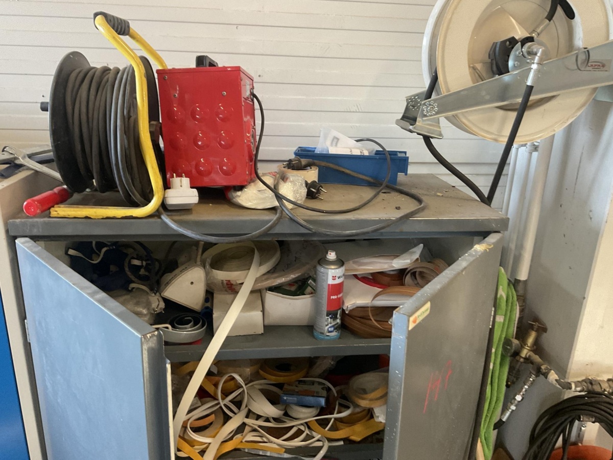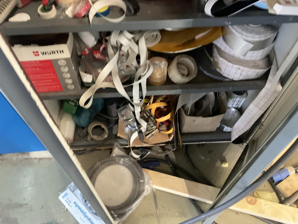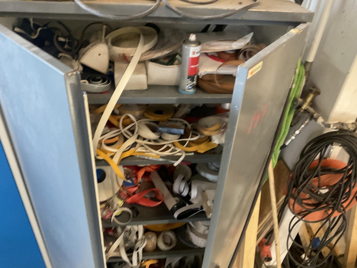 Myyntikohteet » 5. Best-Caravan Oy:n konkurssipesä, HYVINKÄÄ (1824257-7), 19.03.2026 » 147. Metallinen säilytyskaappi jossa kaluste- ja pintakäsittelytarvikkeita (reunanauhoitus ym.)