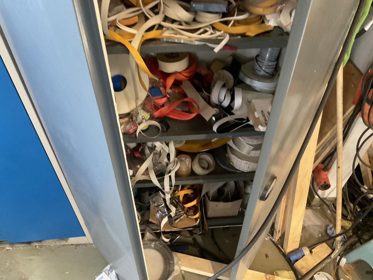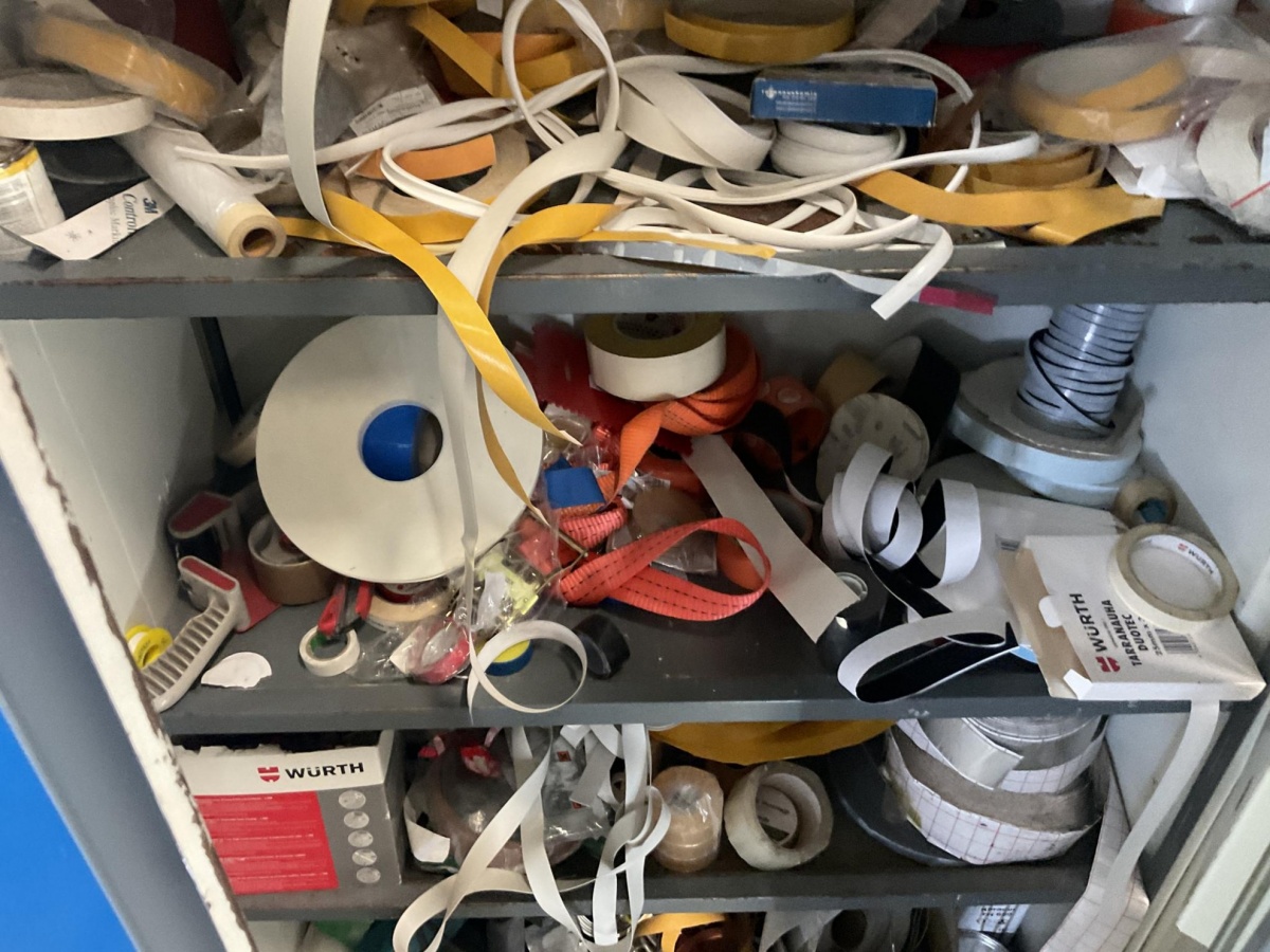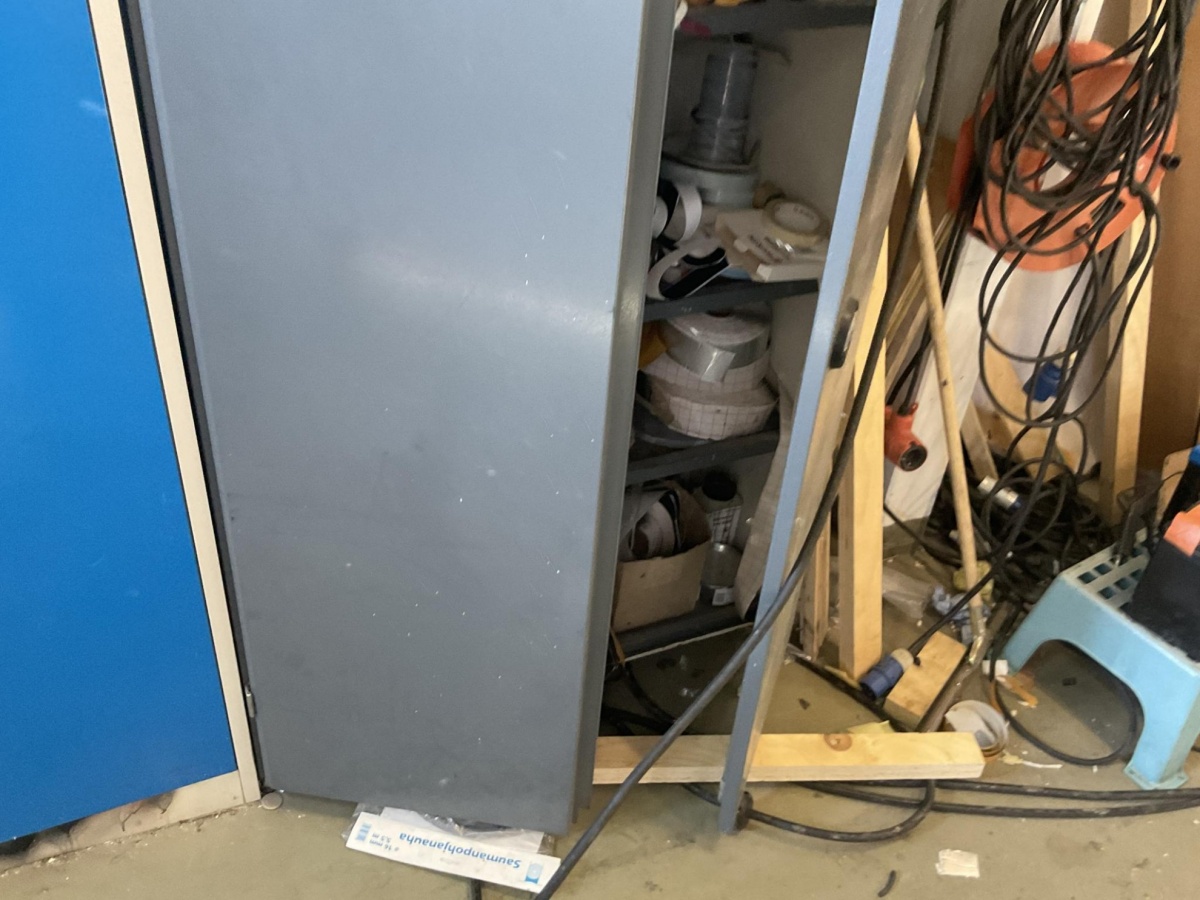 Myyntikohteet » 5. Best-Caravan Oy:n konkurssipesä, HYVINKÄÄ (1824257-7), 19.03.2026 » 147. Metallinen säilytyskaappi jossa kaluste- ja pintakäsittelytarvikkeita (reunanauhoitus ym.)
