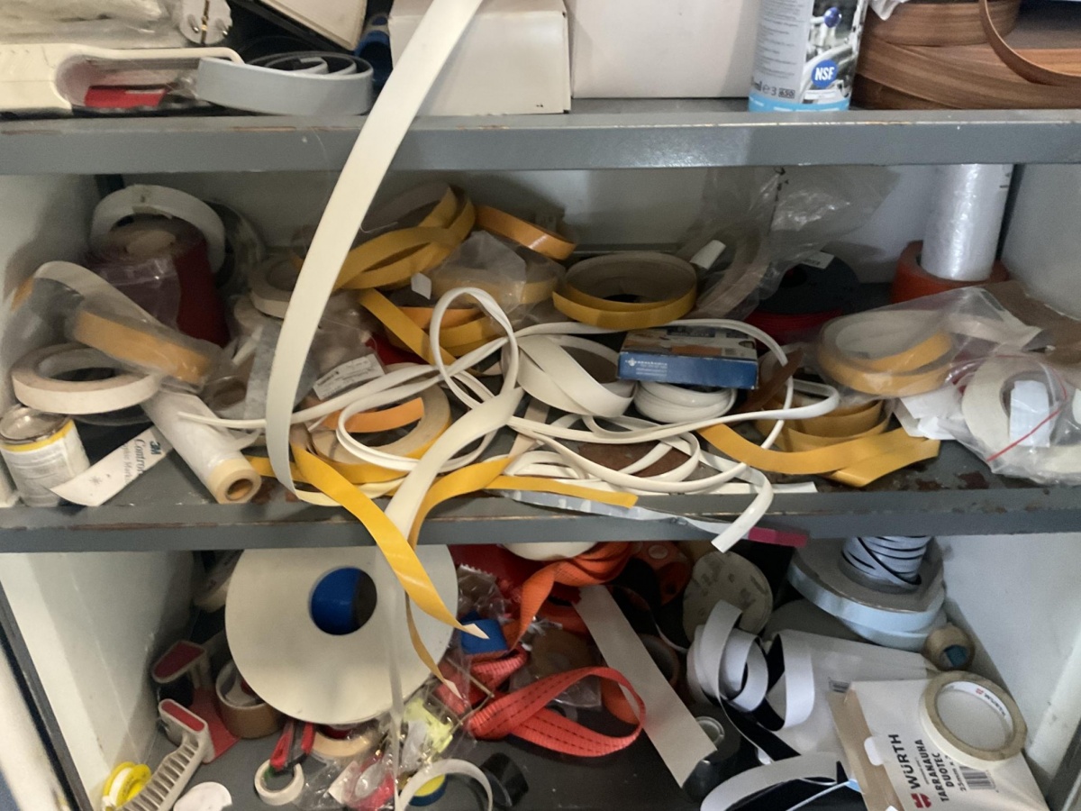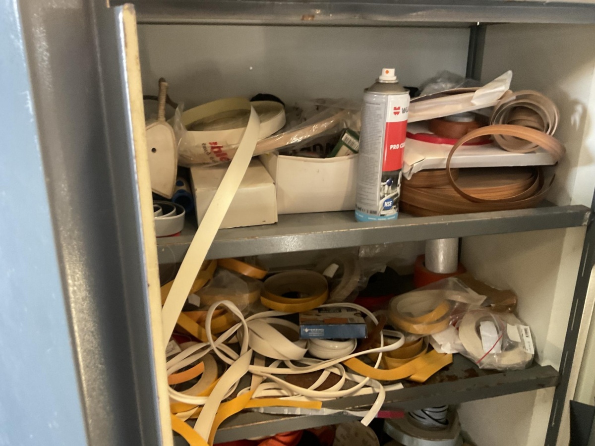 Metallinen säilytyskaappi jossa kaluste- ja pintakäsittelytarvikkeita (reunanauhoitus ym.)