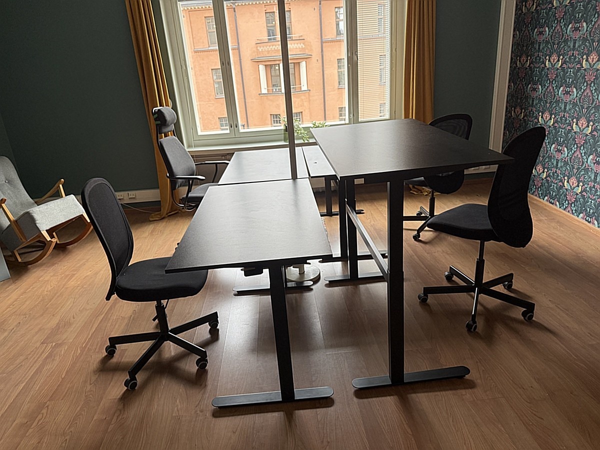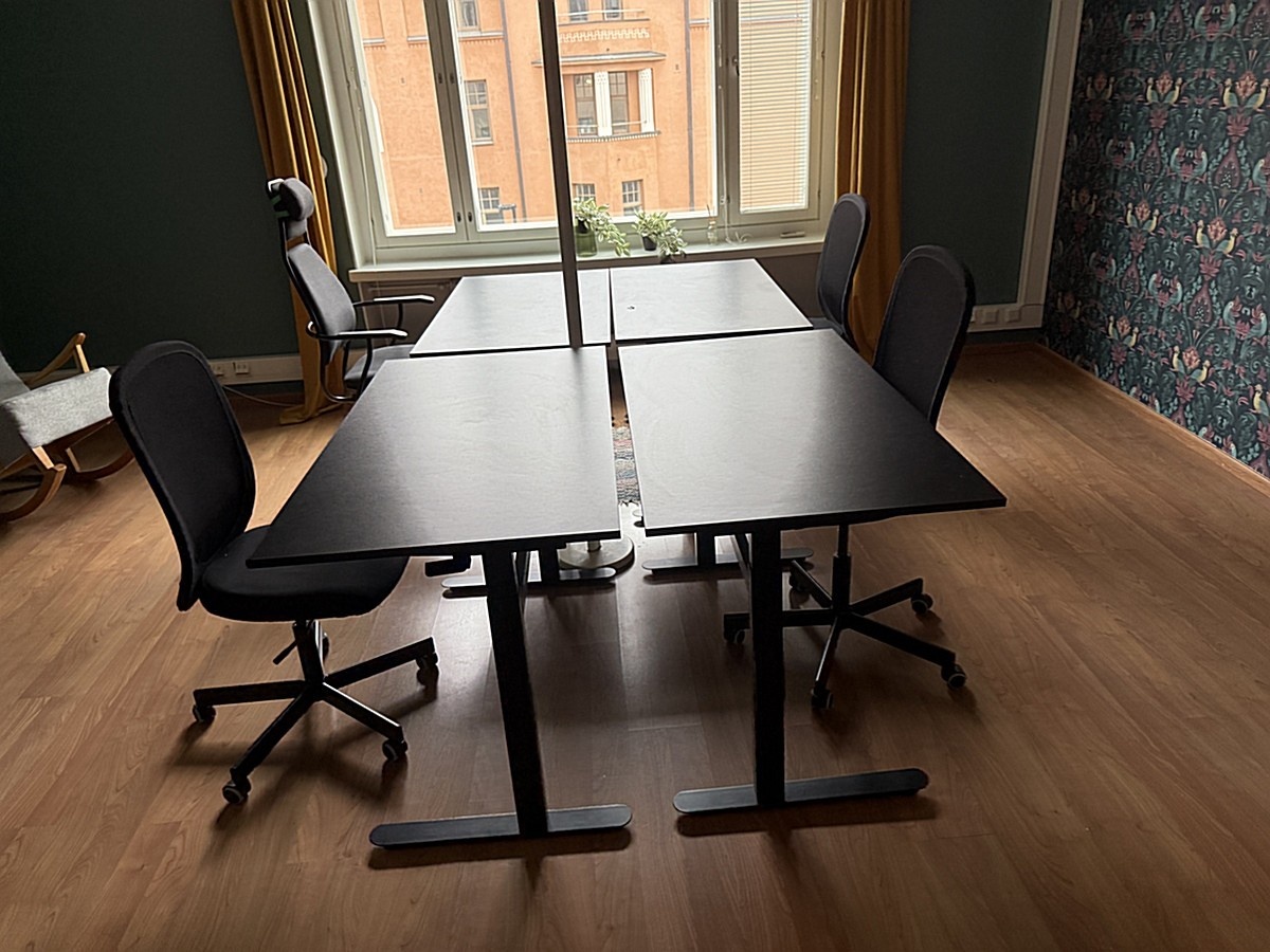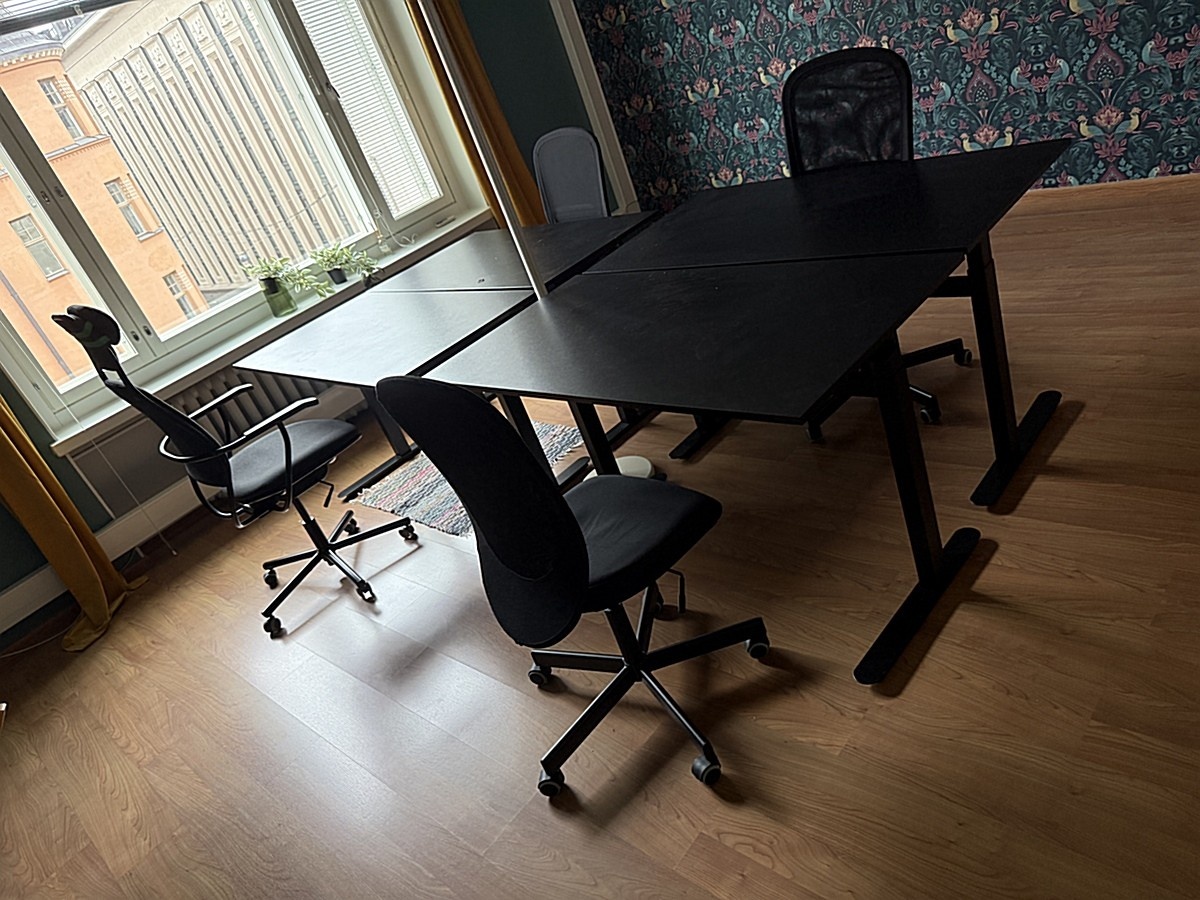 Toimistopöydät kaasujousisäädöllä (4 kappaletta) + tuolit (4 kappaletta)