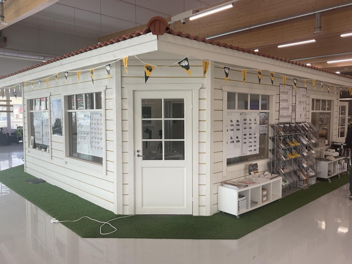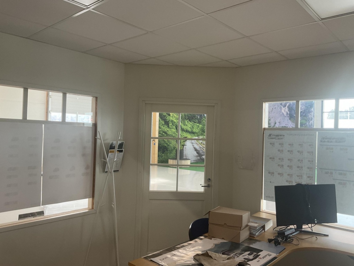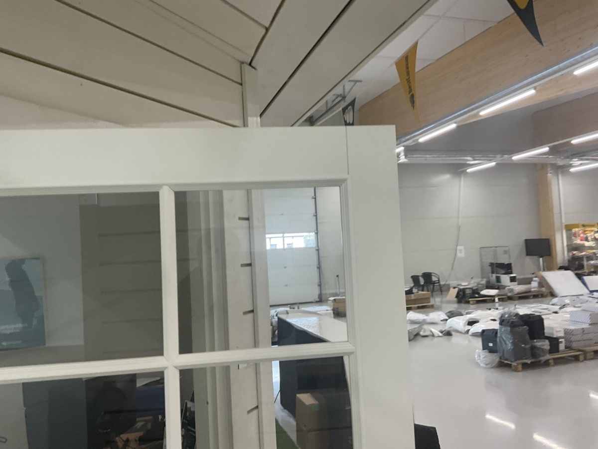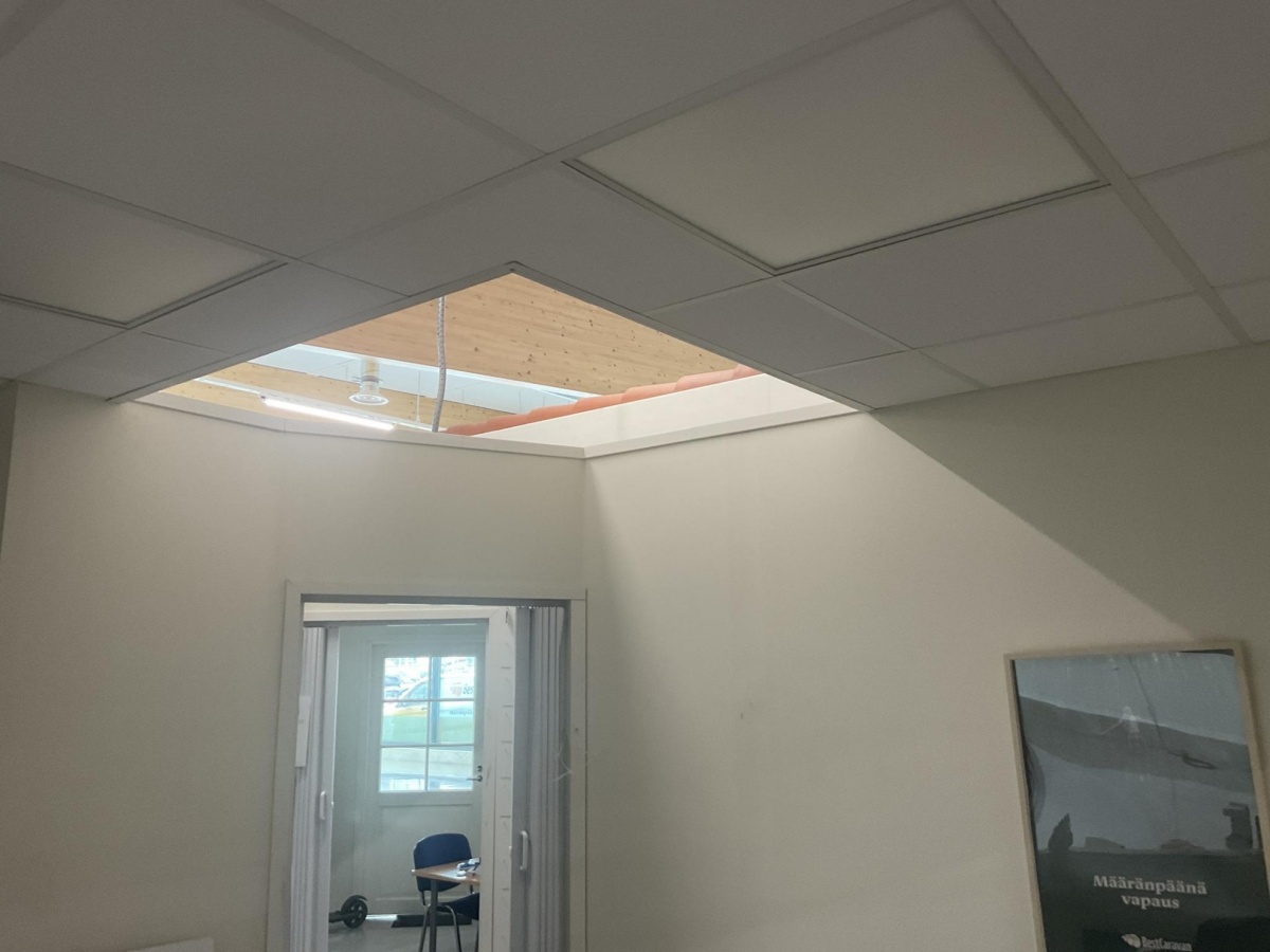 Kevyt, ei-kantava, sisätilaan rakennettu puurunkoinen dekoratiivinen seinä-/kattoelementti, joka jakaa tilan toimistohuoneiksi. Mitat noin 8 x 8 m.