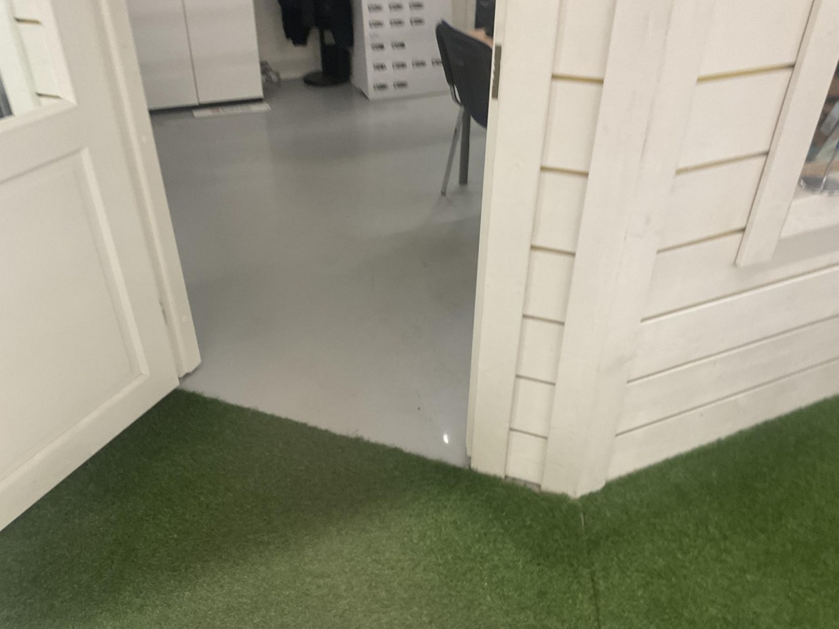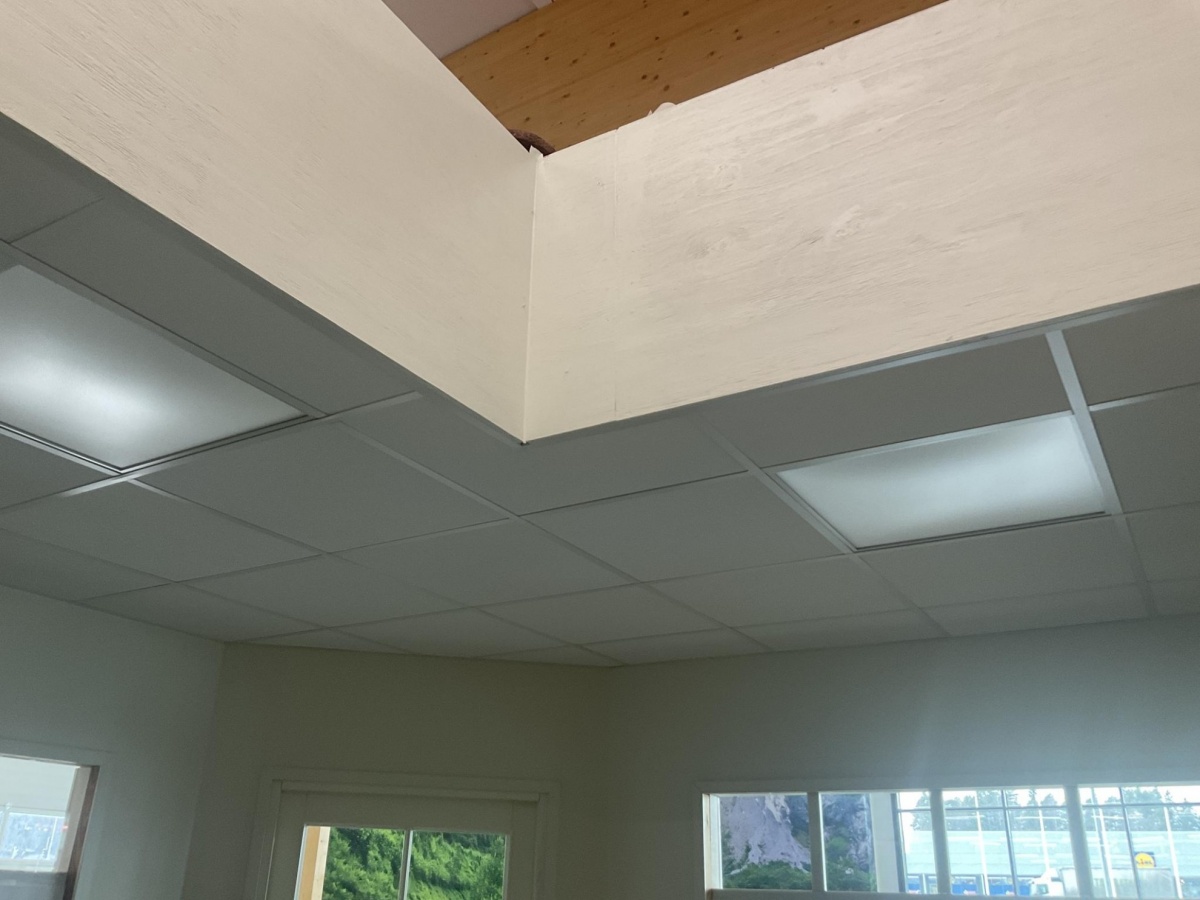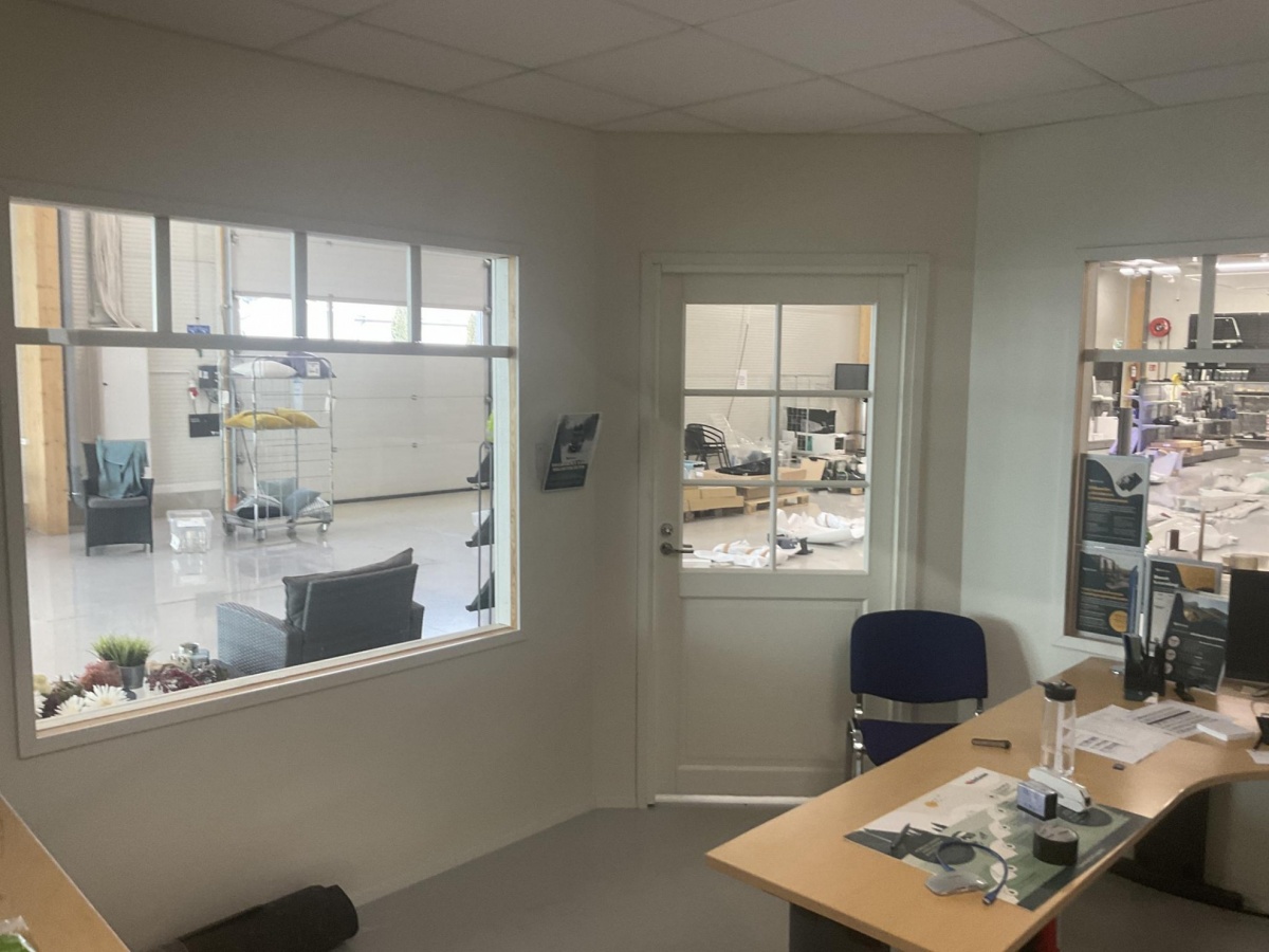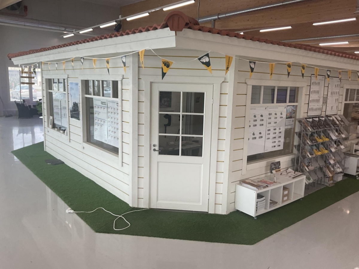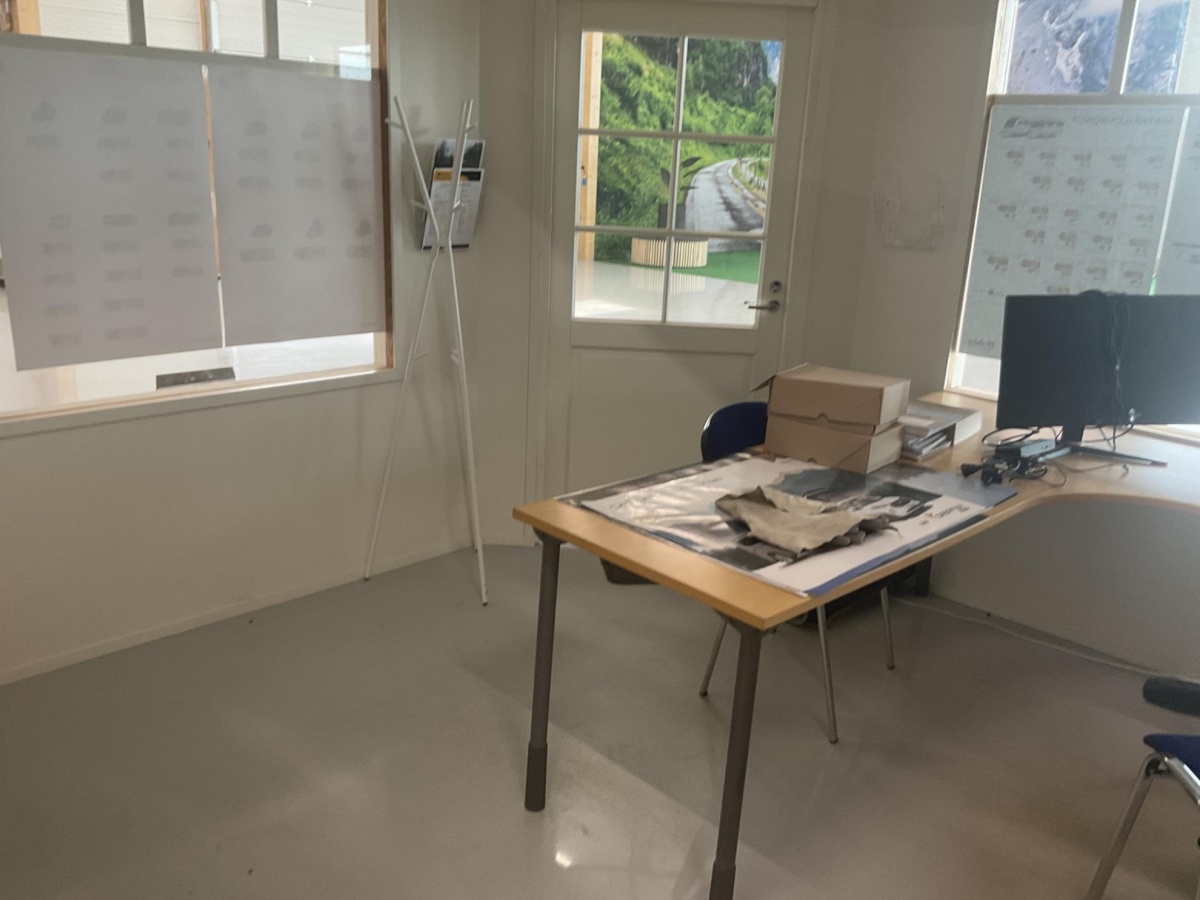 Kevyt, ei-kantava, sisätilaan rakennettu puurunkoinen dekoratiivinen seinä-/kattoelementti, joka jakaa tilan toimistohuoneiksi. Mitat noin 8 x 8 m.
