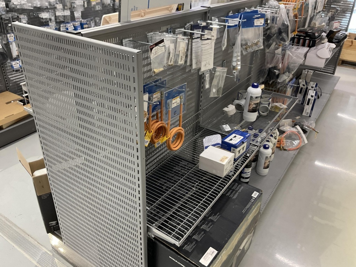 2-puoleinen myymälähylly; piikit, hyllyt ja ritilät