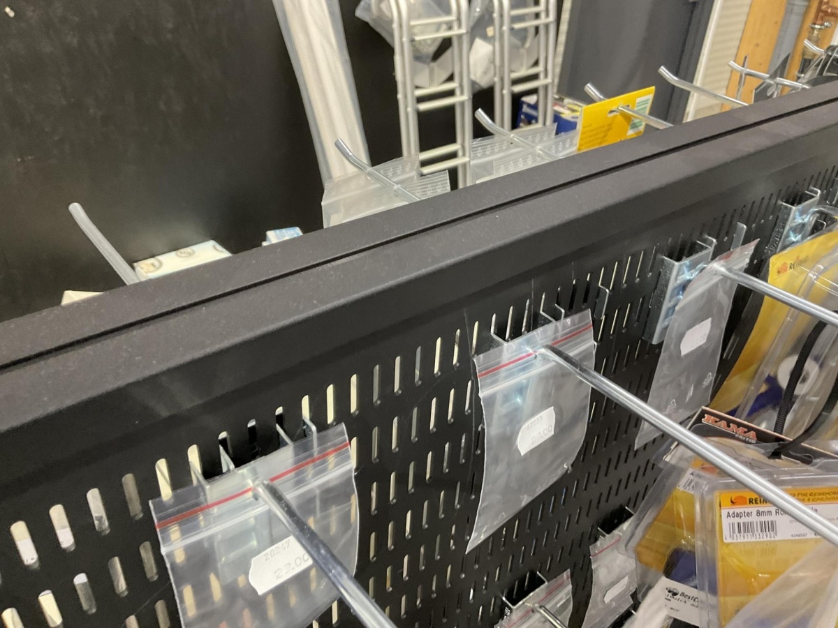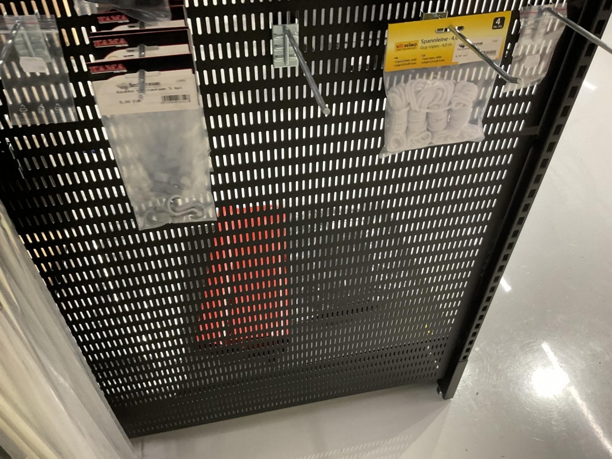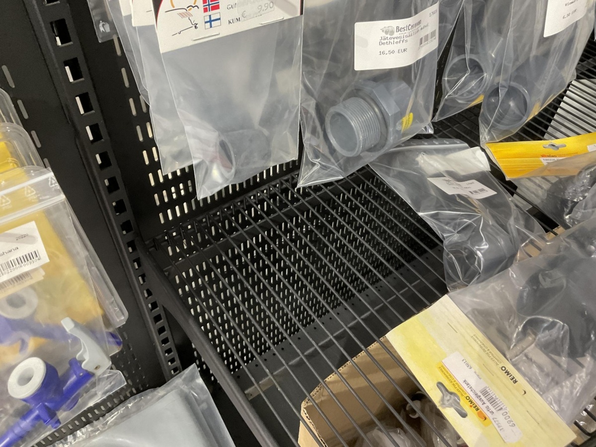 2-puoleinen myymälähylly; piikit, hyllyt ja ritilät