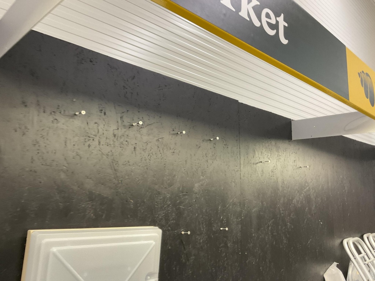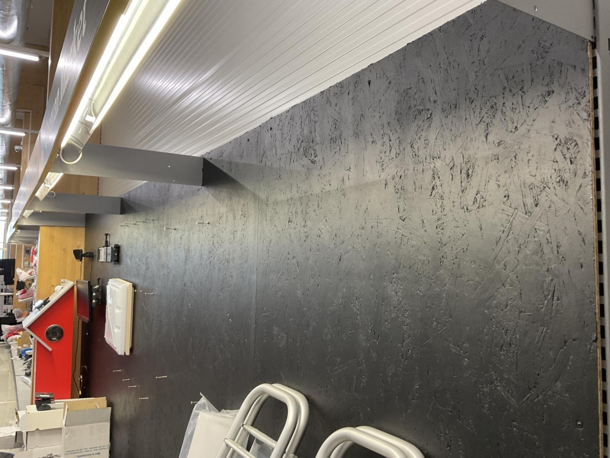 Vanerilla päällystetty myymälän seinähyllyn runko.