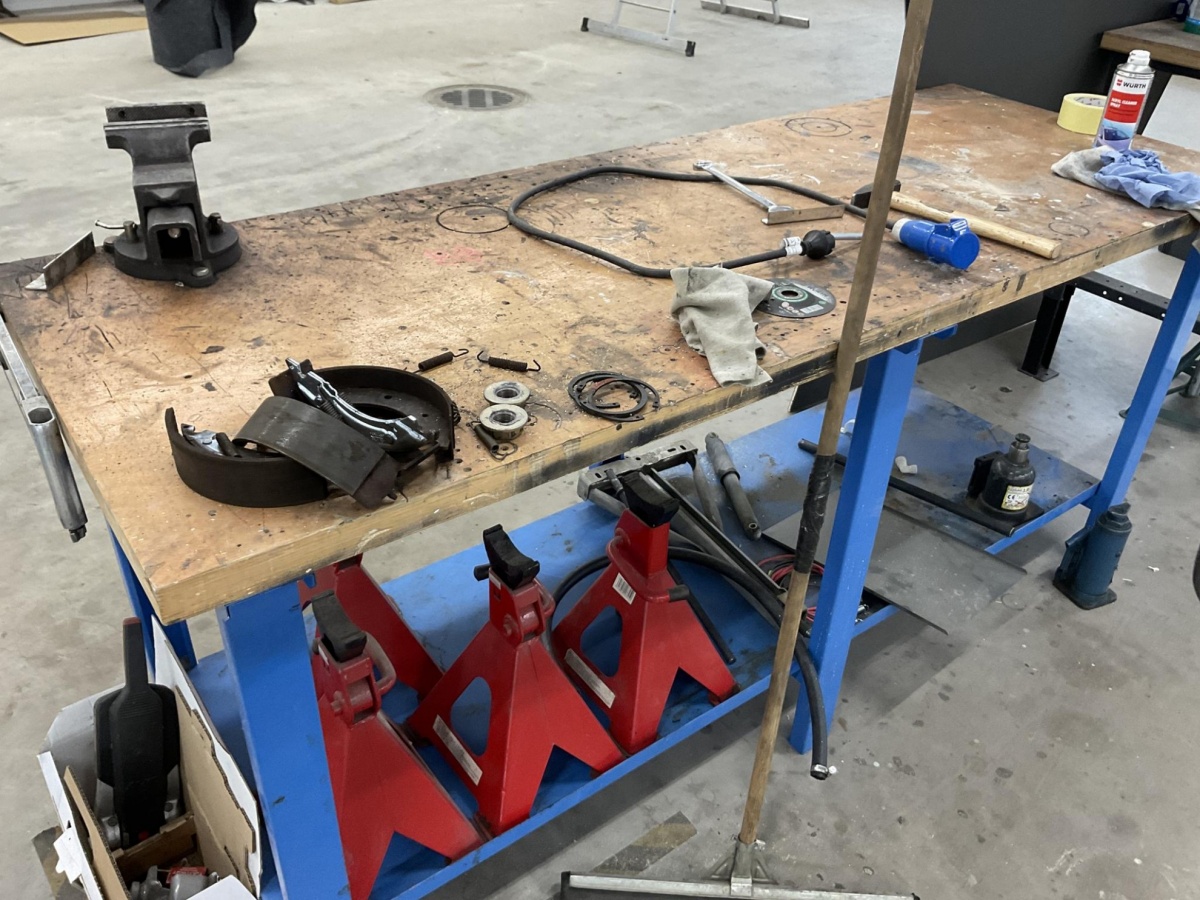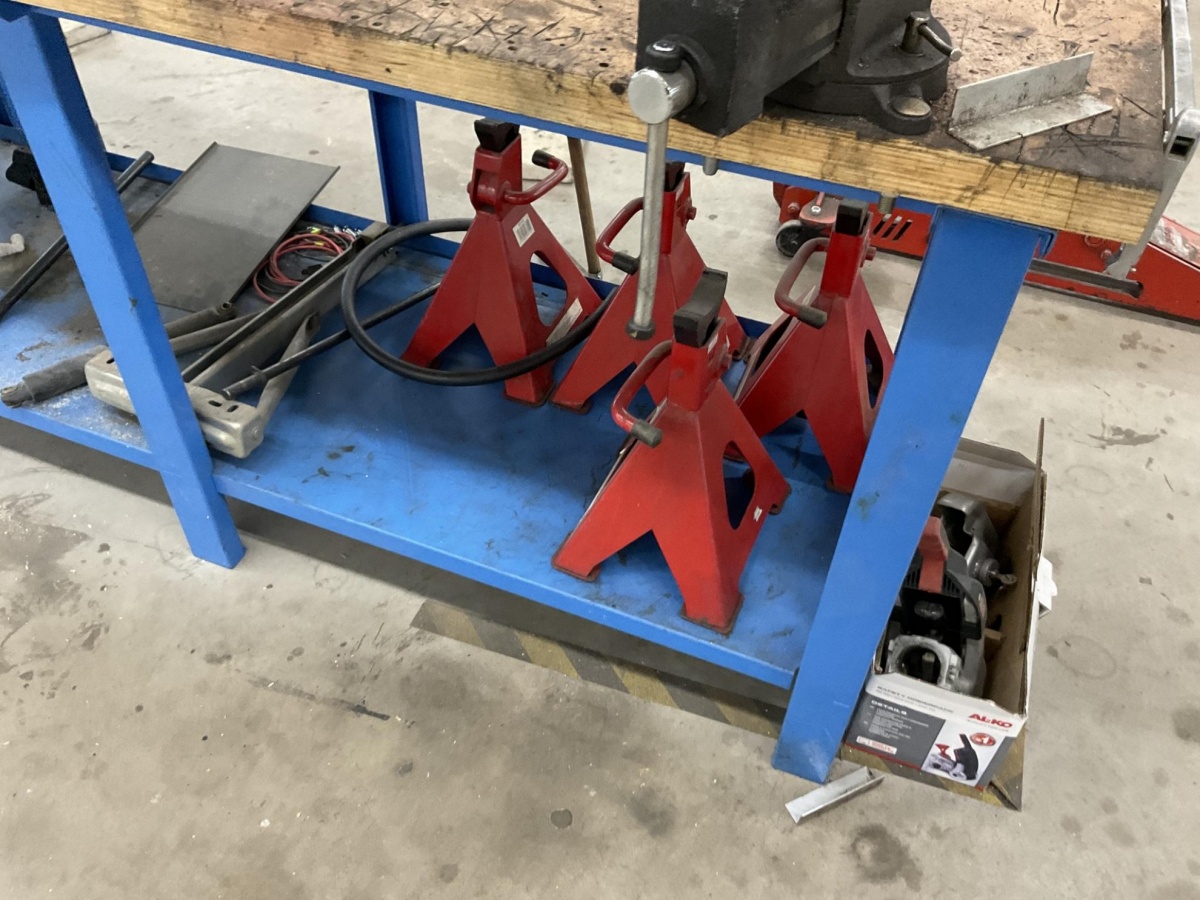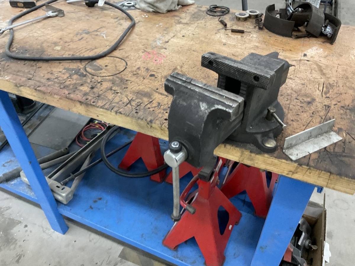 Myyntikohteet » 9. Best-Caravan Oy:n konkurssipesä, TURKU (1824257-7), 24.03.2026 » 088. Teräsrunkoinen työpöytä, ruuvipenkki ja korjaamopukit
