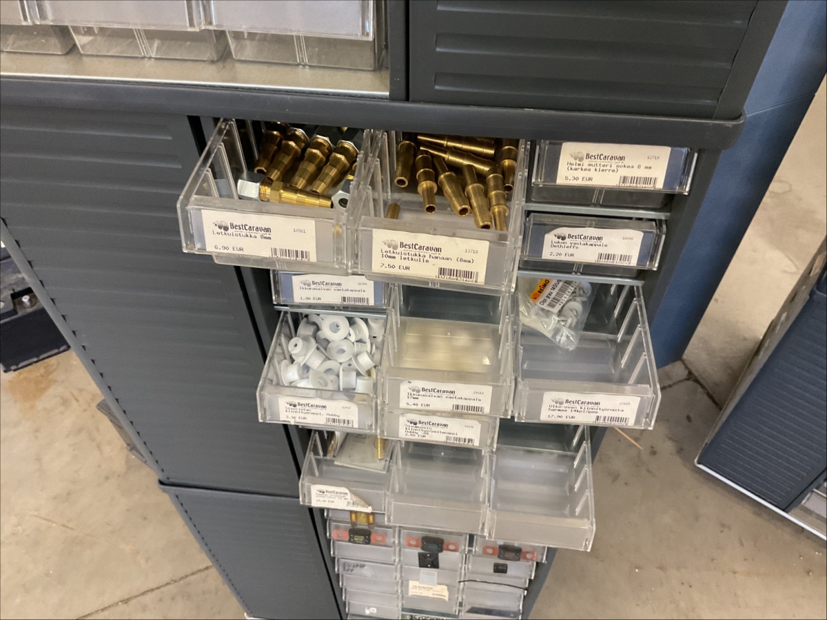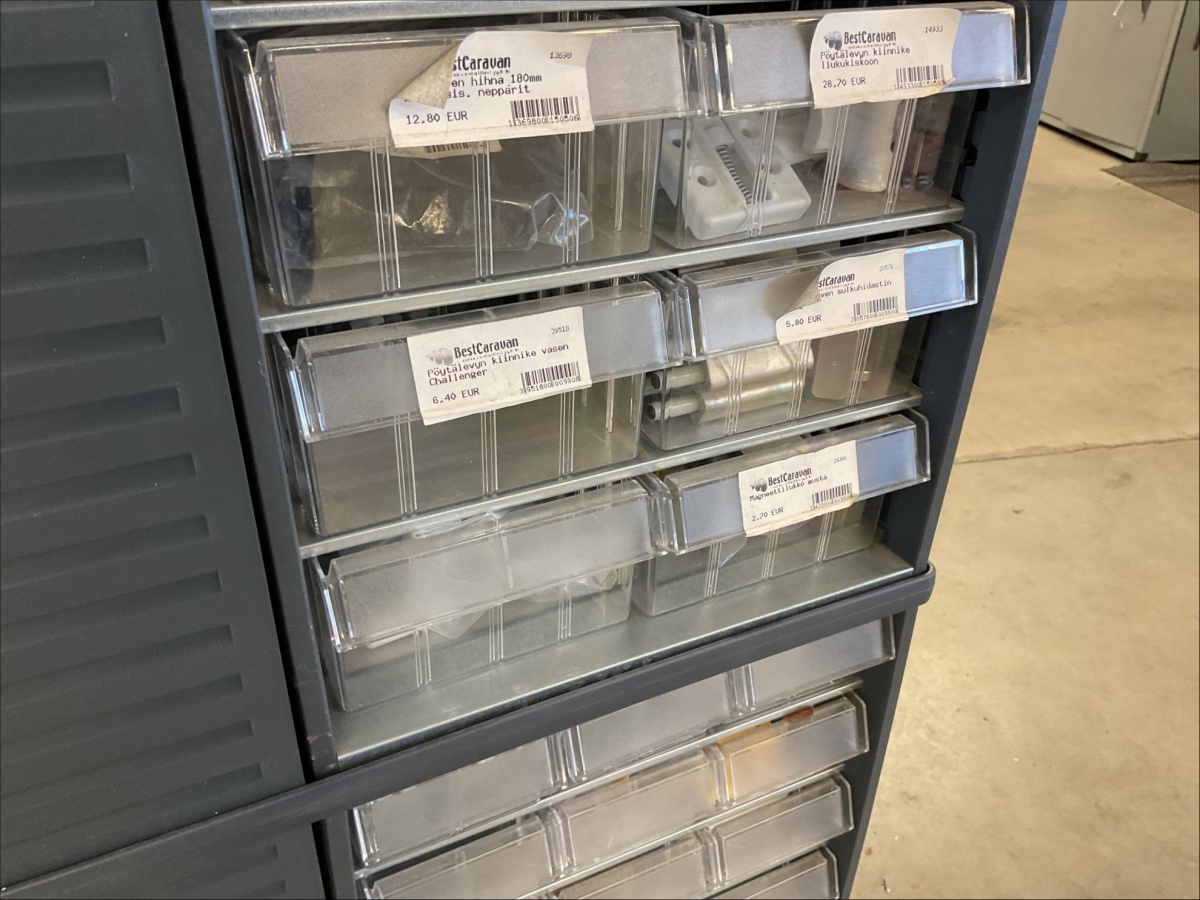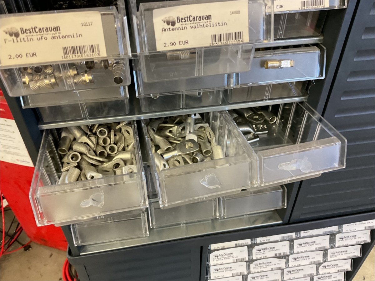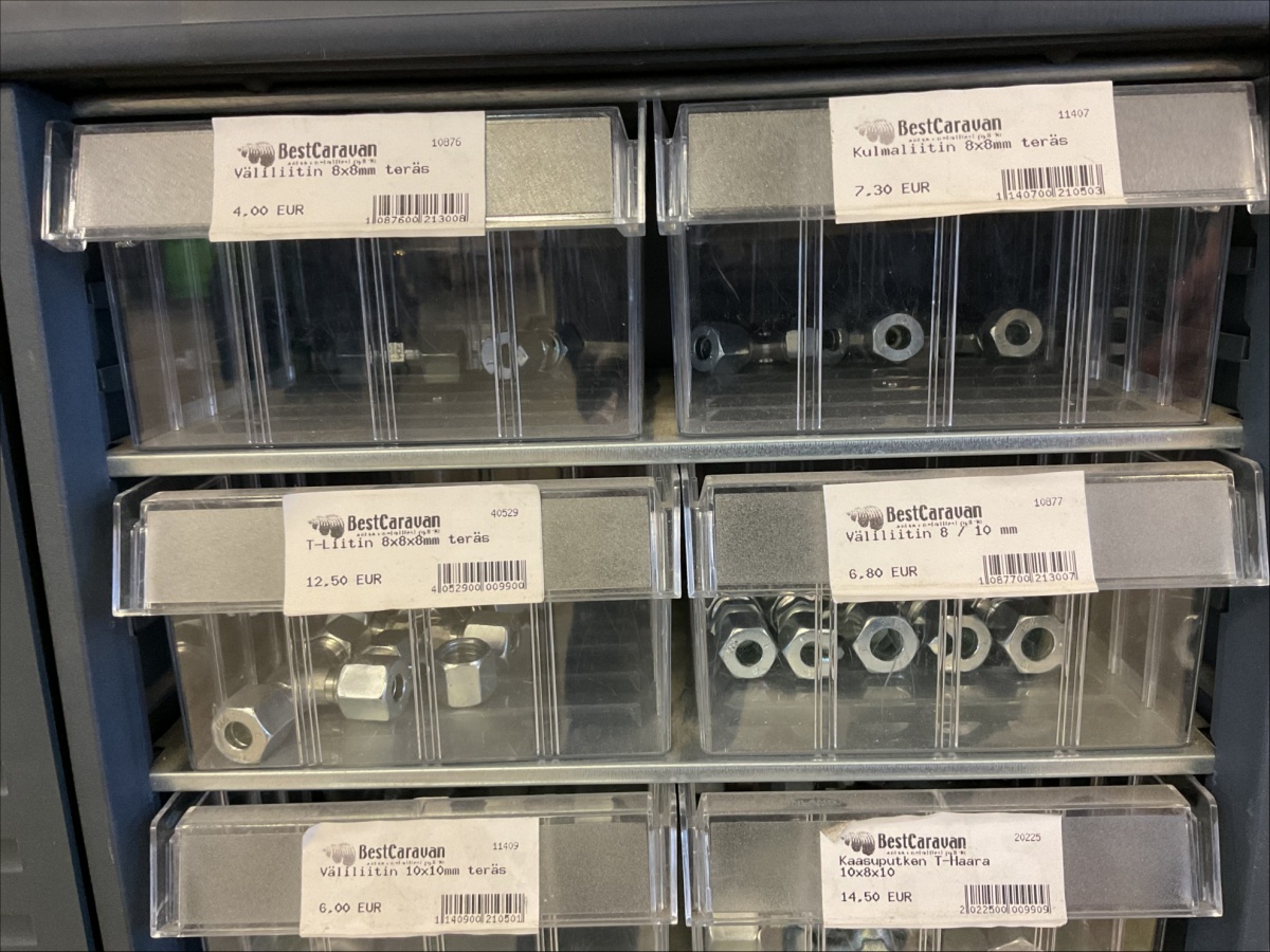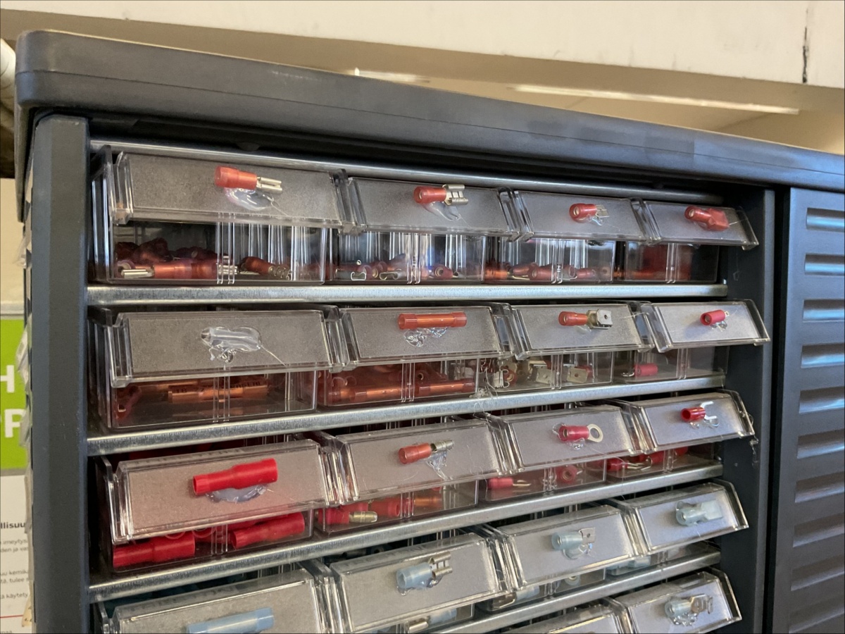 Myyntikohteet » 10. Best-Caravan Oy:n konkurssipesä, OULU (1824257-7), 28.03.2026 » K33. Pyörivä laatikostoteline tarvikkeineen (letkukiristimet, sulakkeet, liittimet ym.)