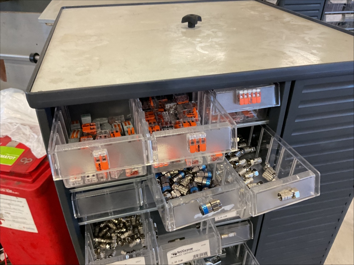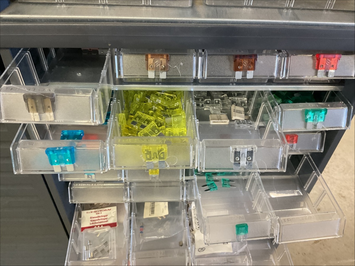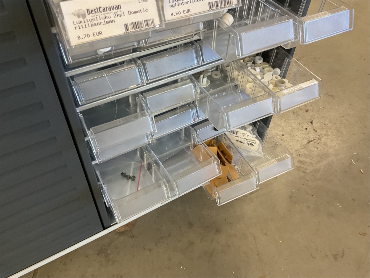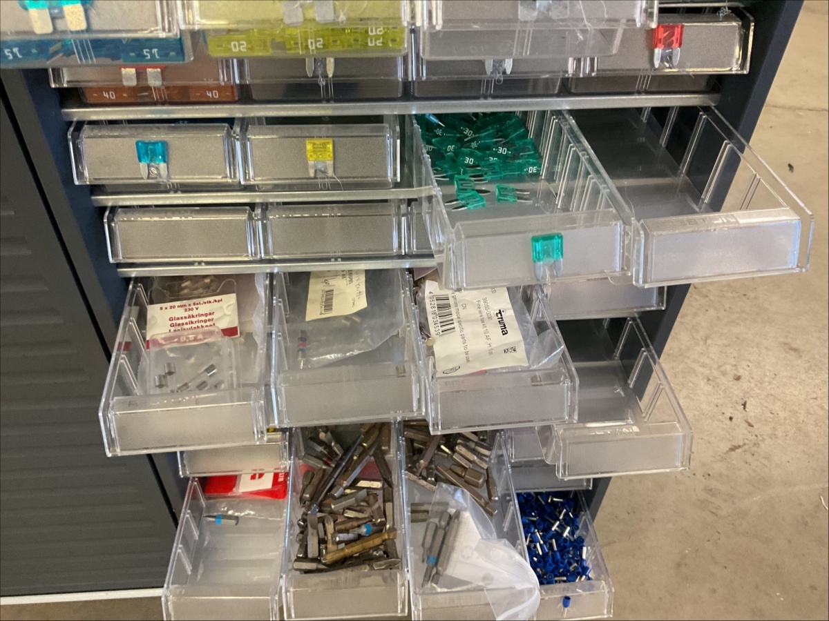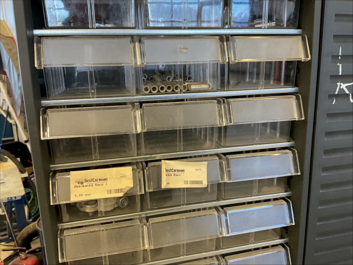 Myyntikohteet » 10. Best-Caravan Oy:n konkurssipesä, OULU (1824257-7), 28.03.2026 » K33. Pyörivä laatikostoteline tarvikkeineen (letkukiristimet, sulakkeet, liittimet ym.)