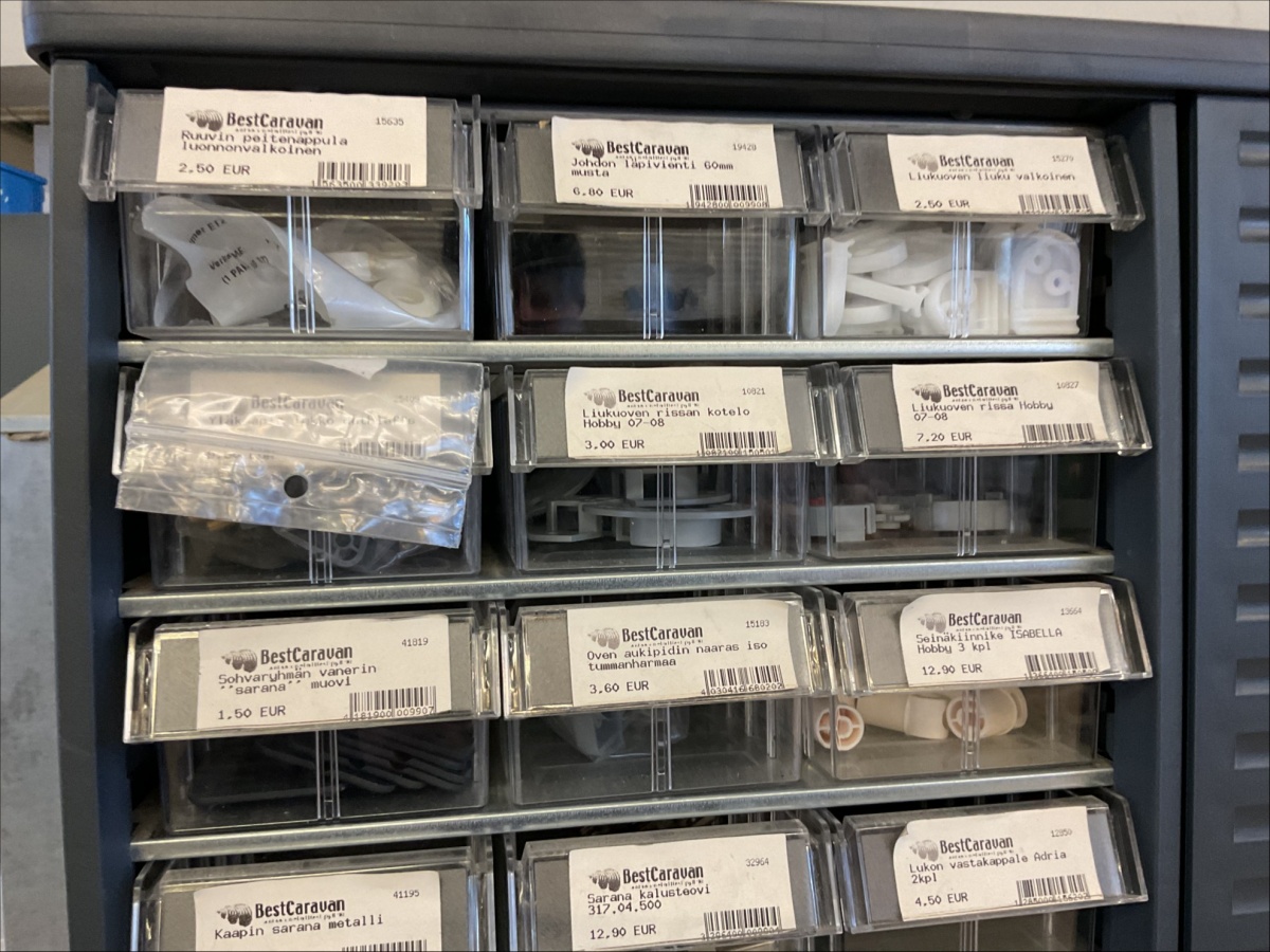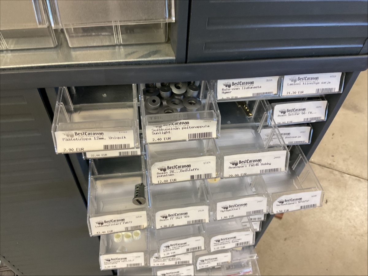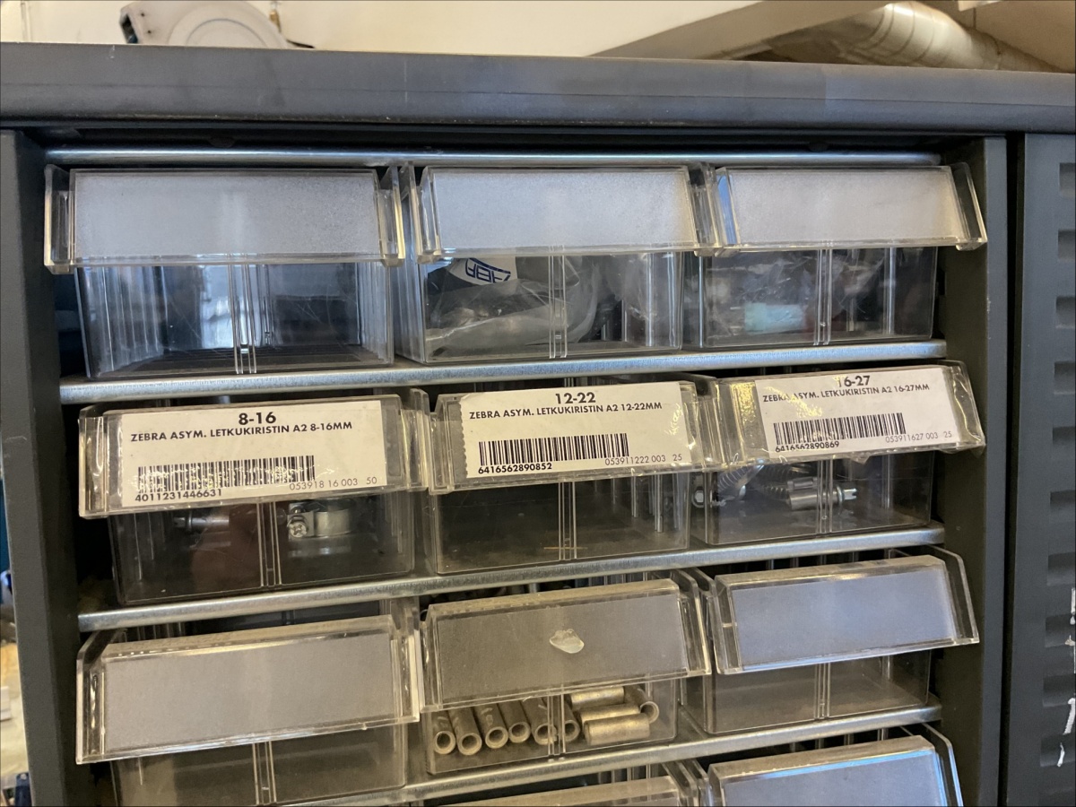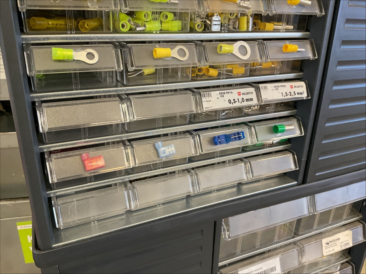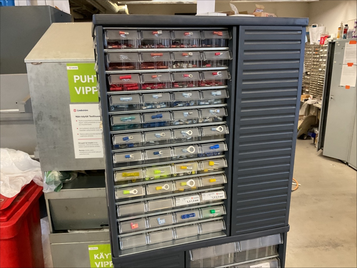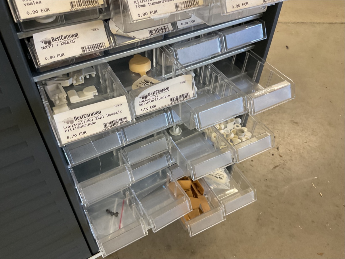 Myyntikohteet » 10. Best-Caravan Oy:n konkurssipesä, OULU (1824257-7), 28.03.2026 » K33. Pyörivä laatikostoteline tarvikkeineen (letkukiristimet, sulakkeet, liittimet ym.)