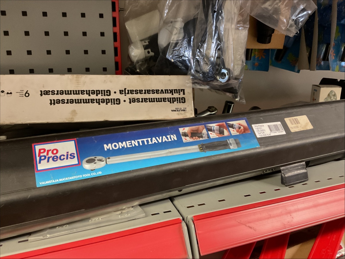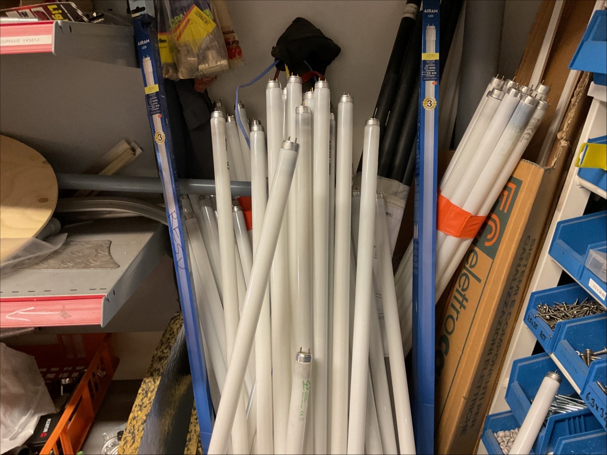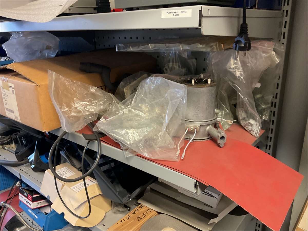 Hyllytasoilla olevat varaosat, työkalut ja tarvikkeet + kulmassa olevat loisteputket