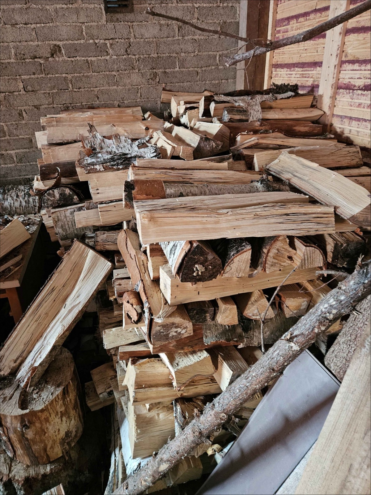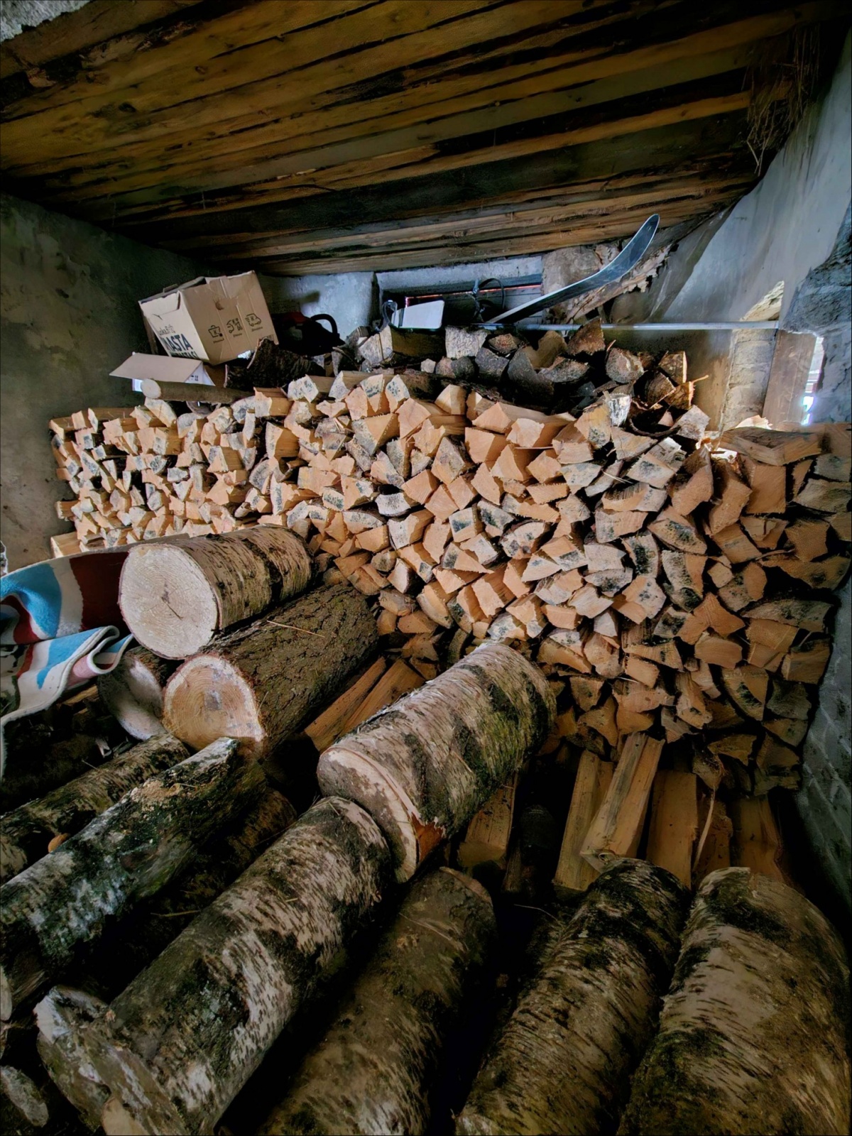 Erä valmiita polttopuita ja halkomattomia pölkkyjä