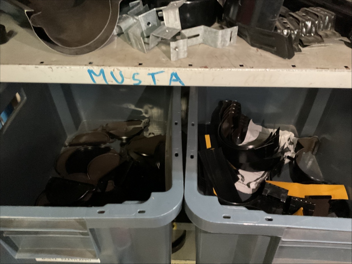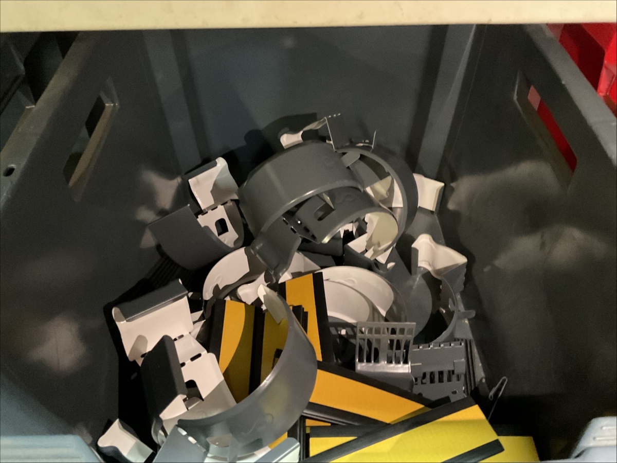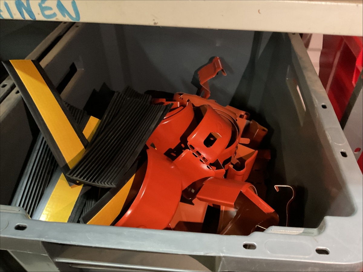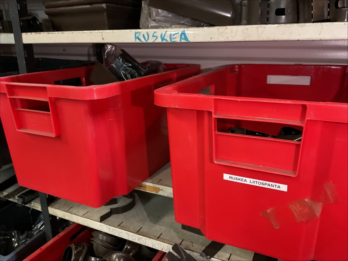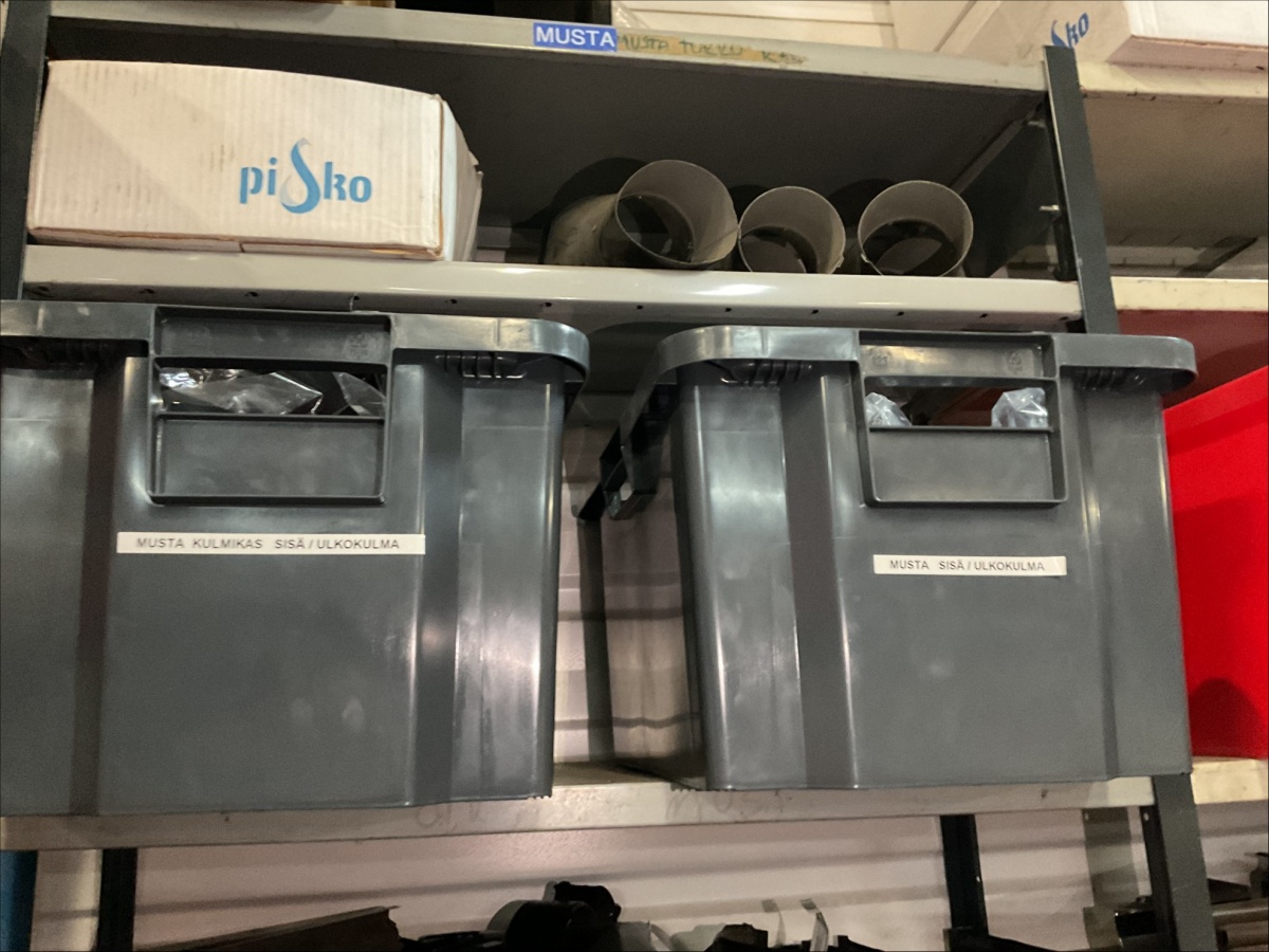 Hyllyissä olevat kaulukset, liukulähdöt, kulmikkaat päätylaput, liitospannat, syöksyputket ylähyllyllä, pieni määrä IV osia
