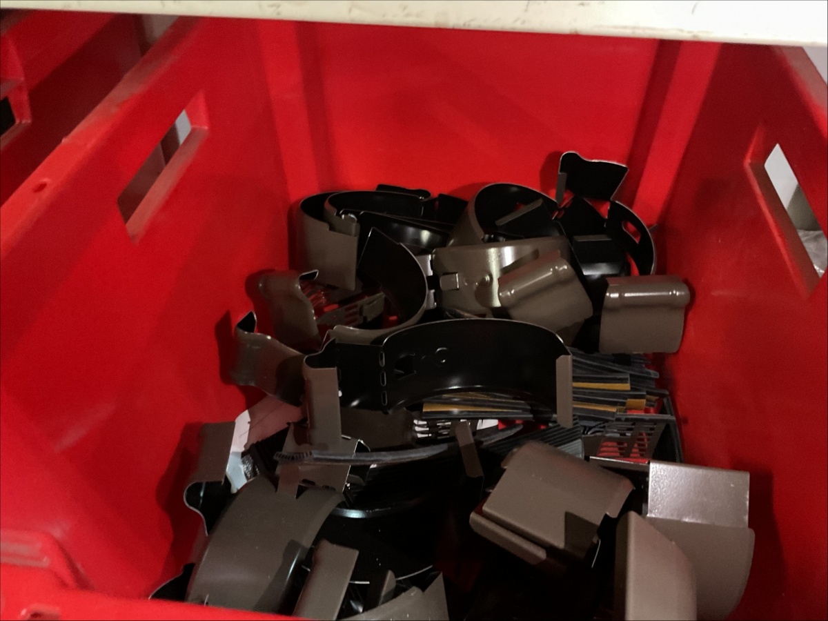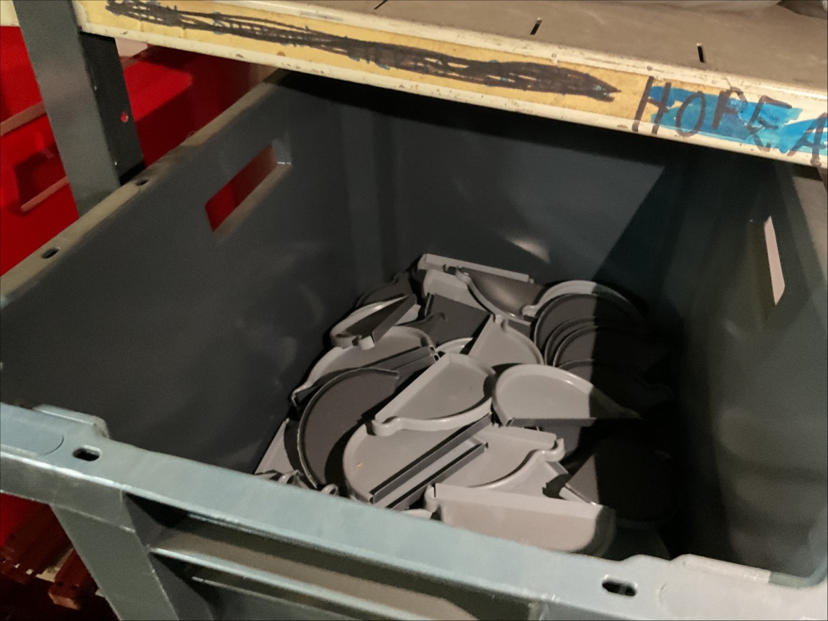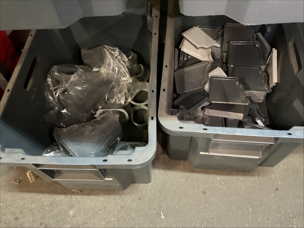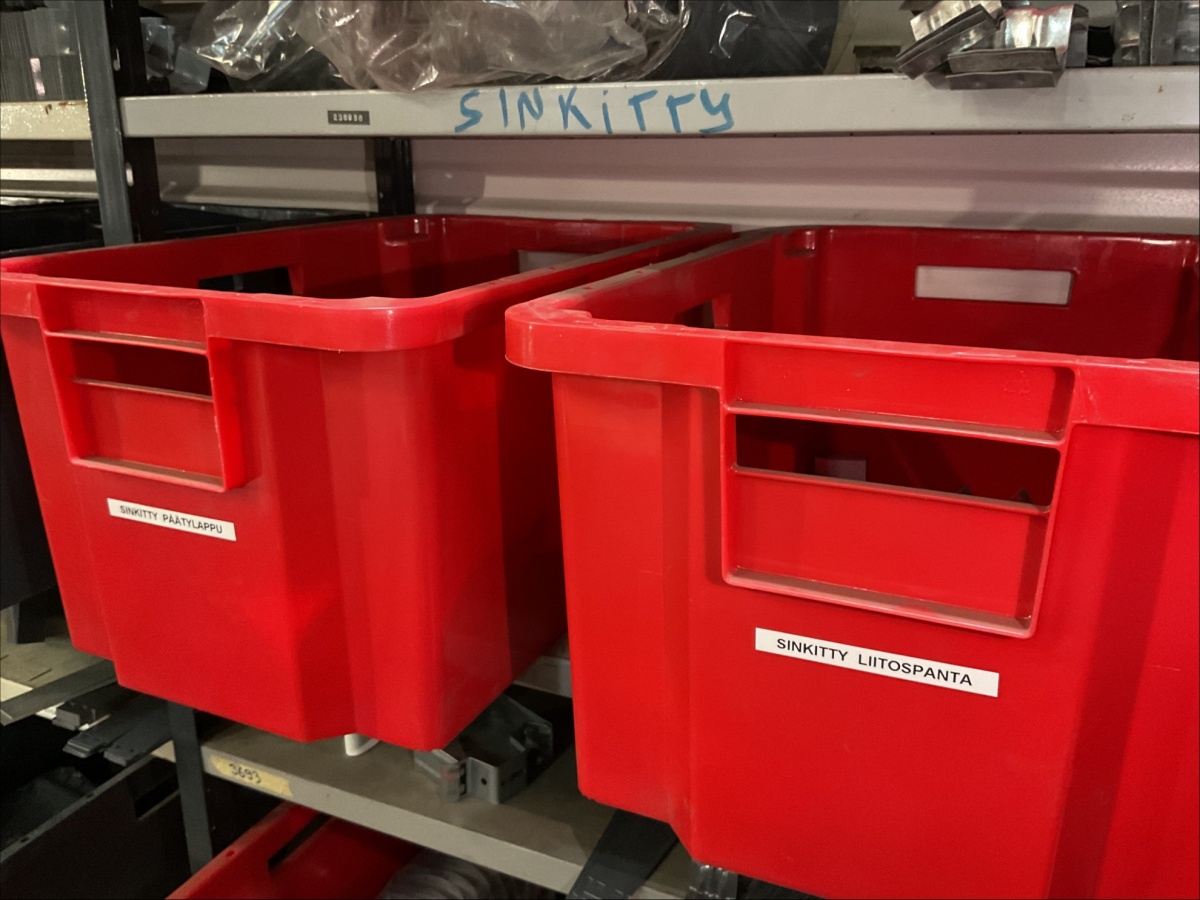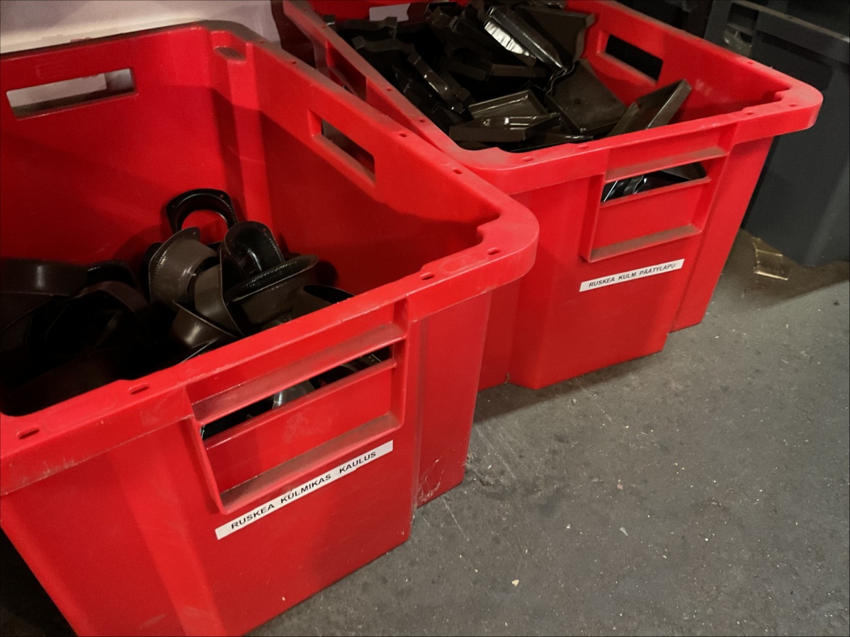 Hyllyissä olevat kaulukset, liukulähdöt, kulmikkaat päätylaput, liitospannat, syöksyputket ylähyllyllä, pieni määrä IV osia