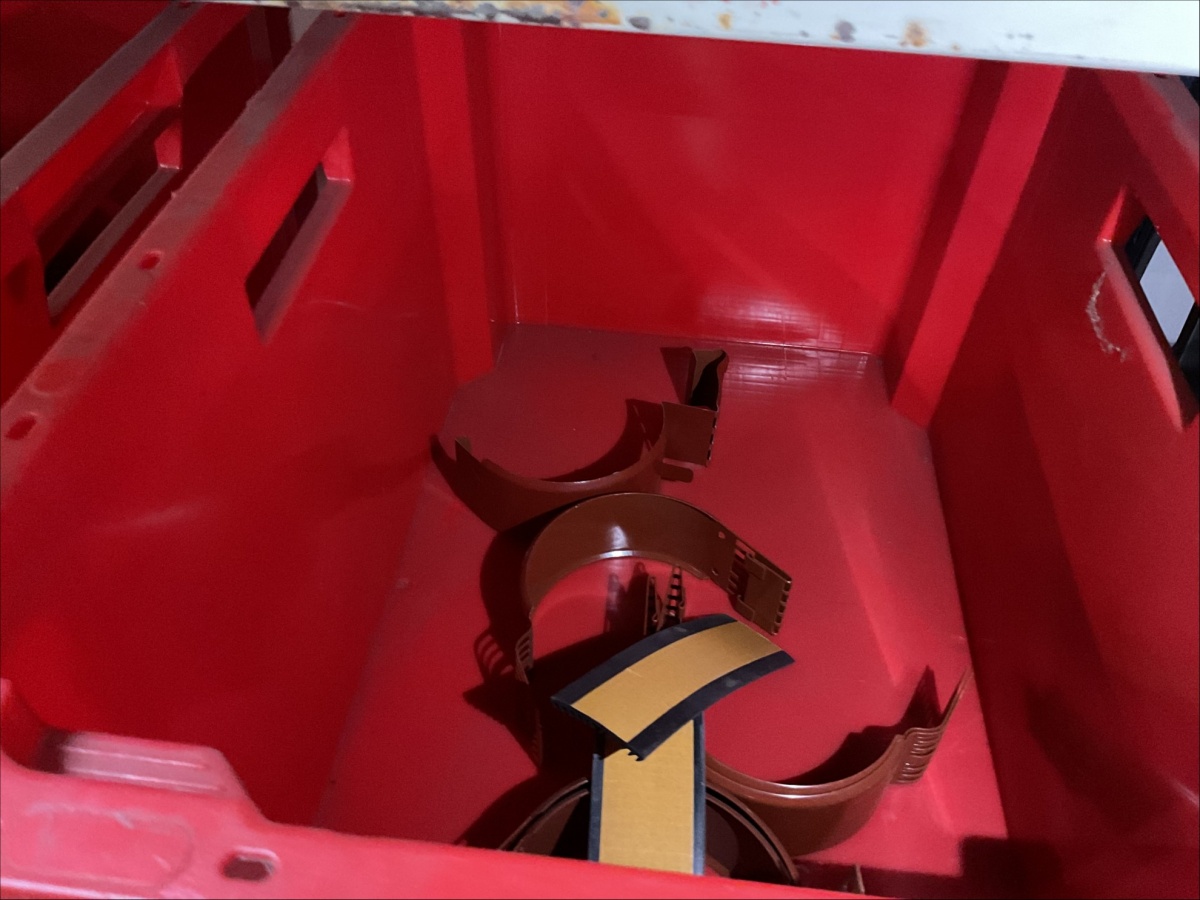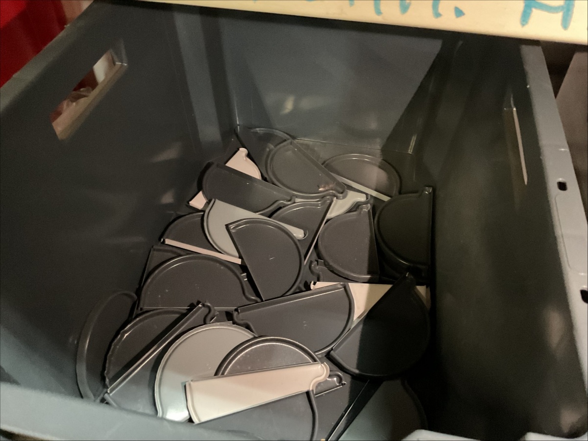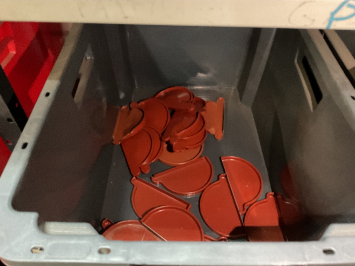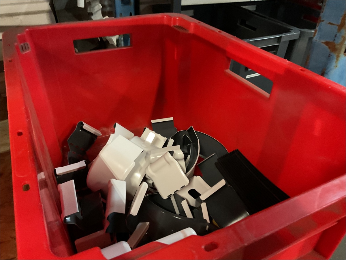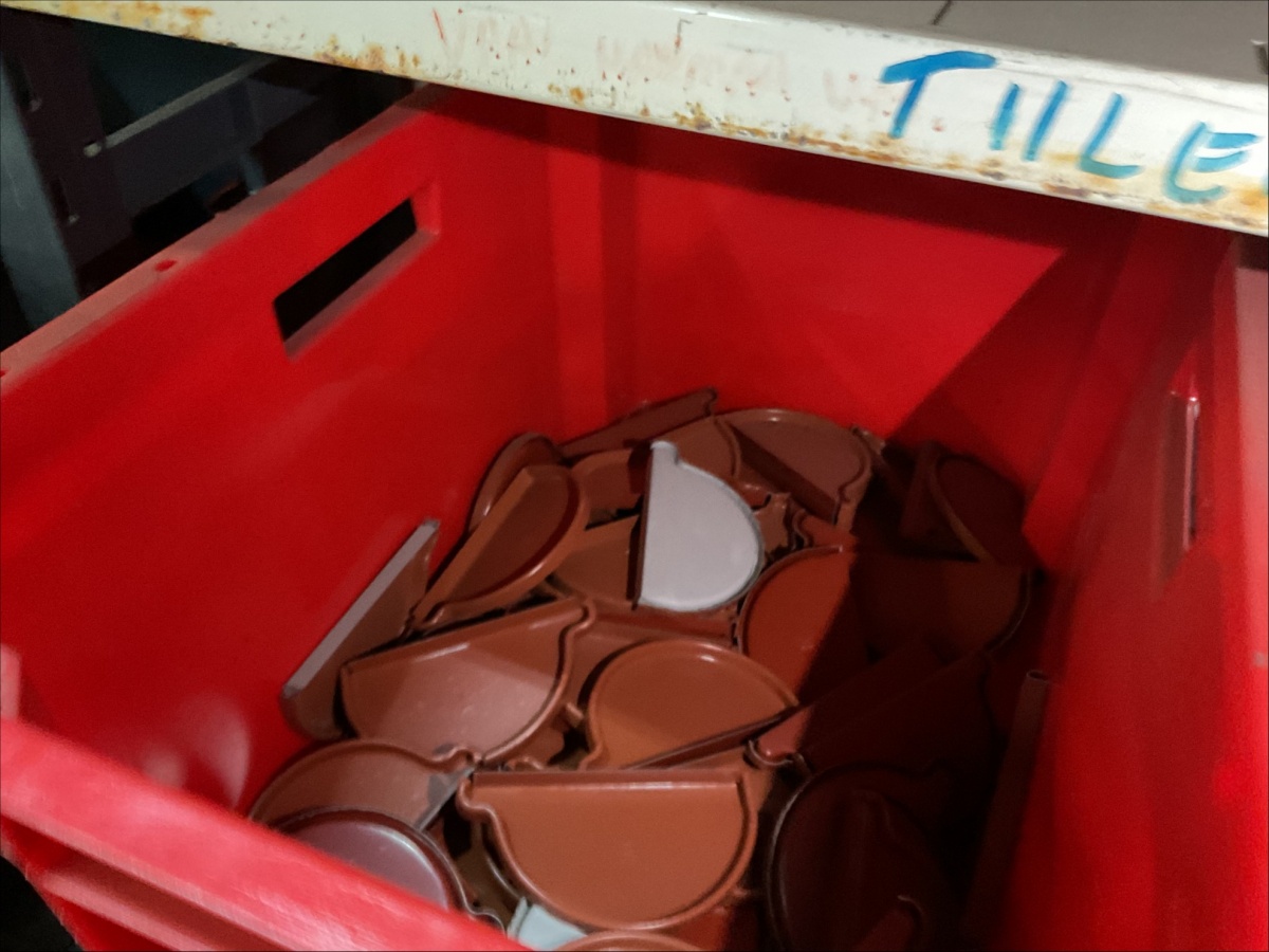 Hyllyissä olevat kaulukset, liukulähdöt, kulmikkaat päätylaput, liitospannat, syöksyputket ylähyllyllä, pieni määrä IV osia