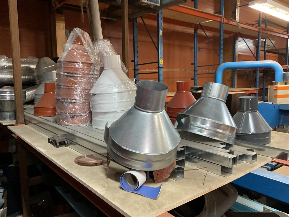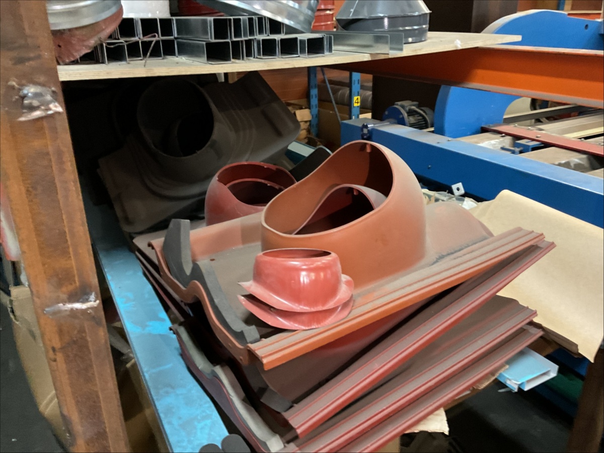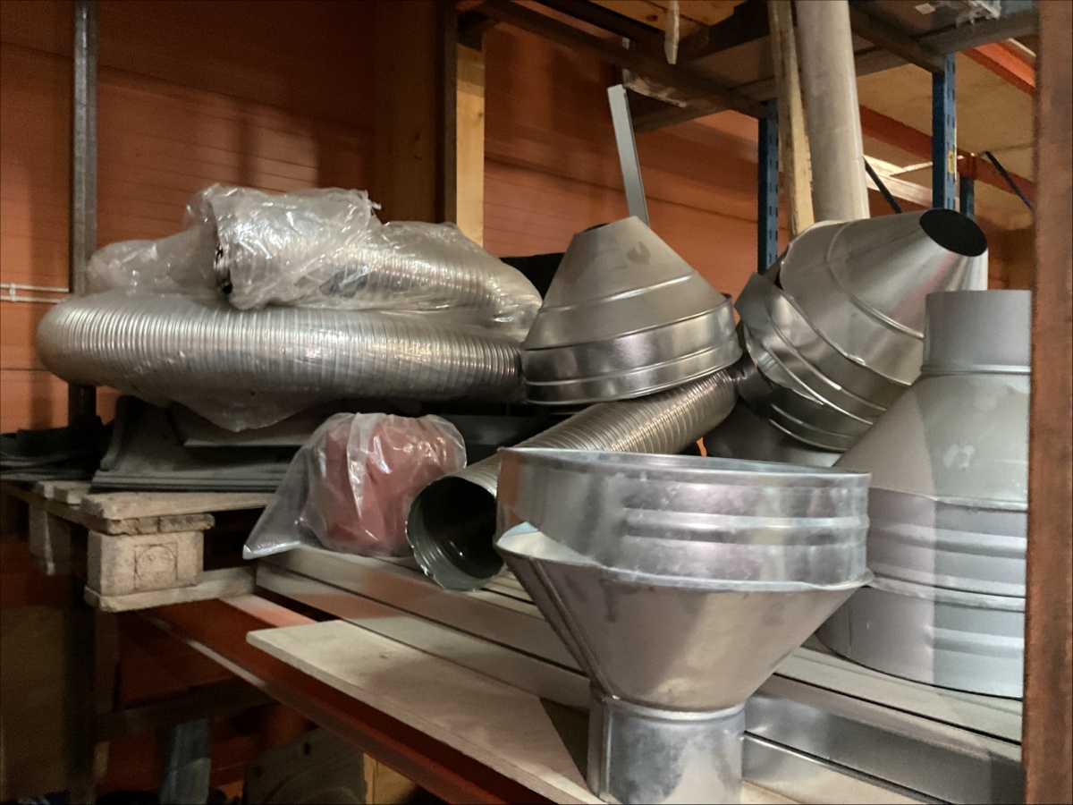 Myyntikohteet » 13. IV-Pelti Luuri Oy:n konkurssipesä, LOIMAA (1637489-1), 04.04.2026 » V249. Hyllyissä olevat kaulukset, liukulähdöt, kulmikkaat päätylaput, liitospannat, syöksyputket ylähyllyllä, pieni määrä IV osia