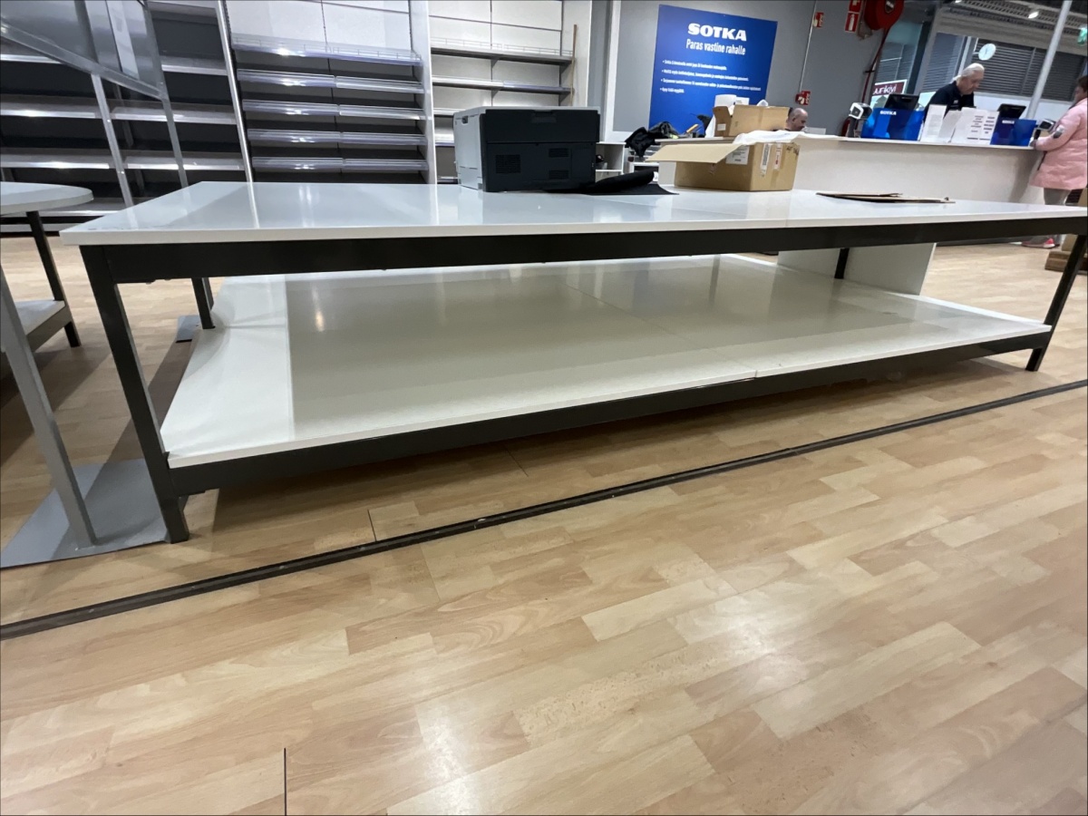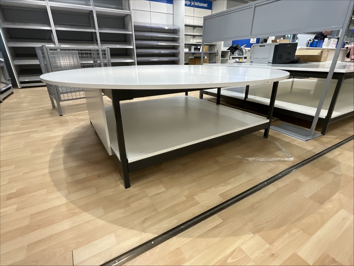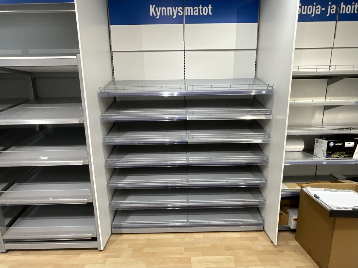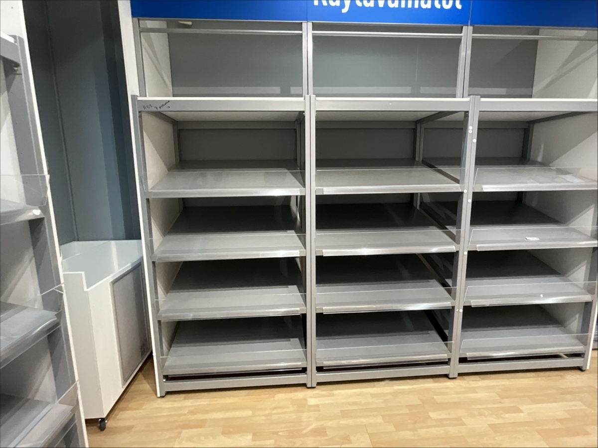 Myyntikohteet » 19. Indoor Group Oy:n konkurssipesä, HÄMEENLINNA (1512332-9), 05.04.2026 » H53. Myymälähyllyt yhteensä 7-hyllyvälikköä, mattojen myyntipöydät 2 kappaletta