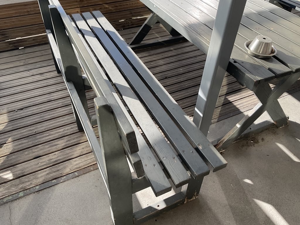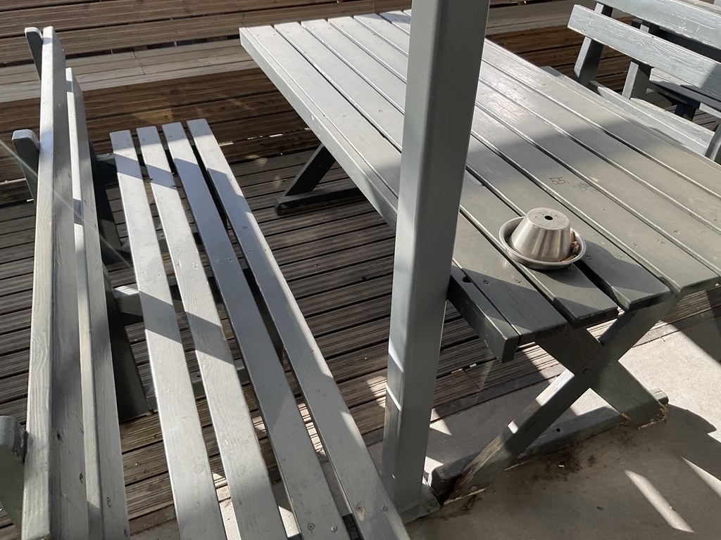 Kahvilan puinen ulkokalusteryhmä, koostuu yhdestä pöydästä ja kahdesta penkistä