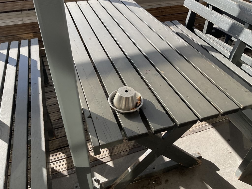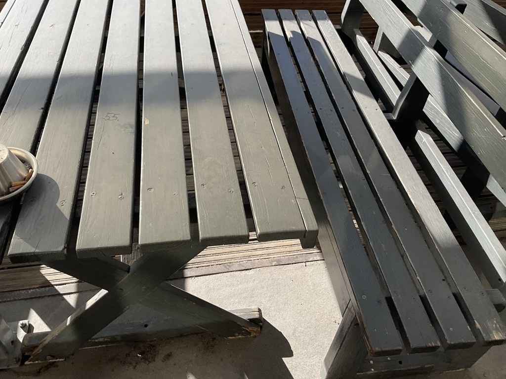 Myyntikohteet » 3. Paimelan Ranch Oy:n konkurssipesä, VESIVEHMAA (2480918-9), 05.04.2026 » A55. Kahvilan puinen ulkokalusteryhmä, (pöytä + kaksi penkkiä)