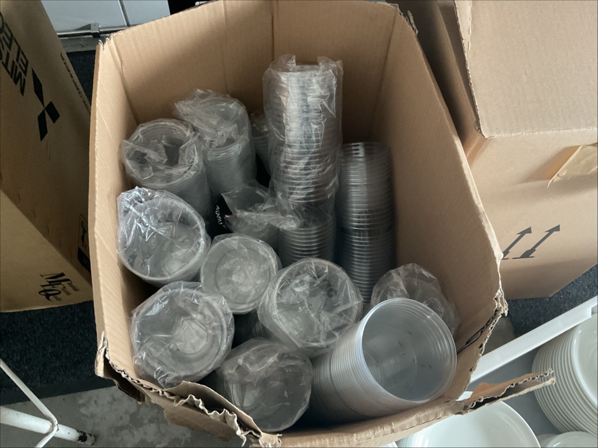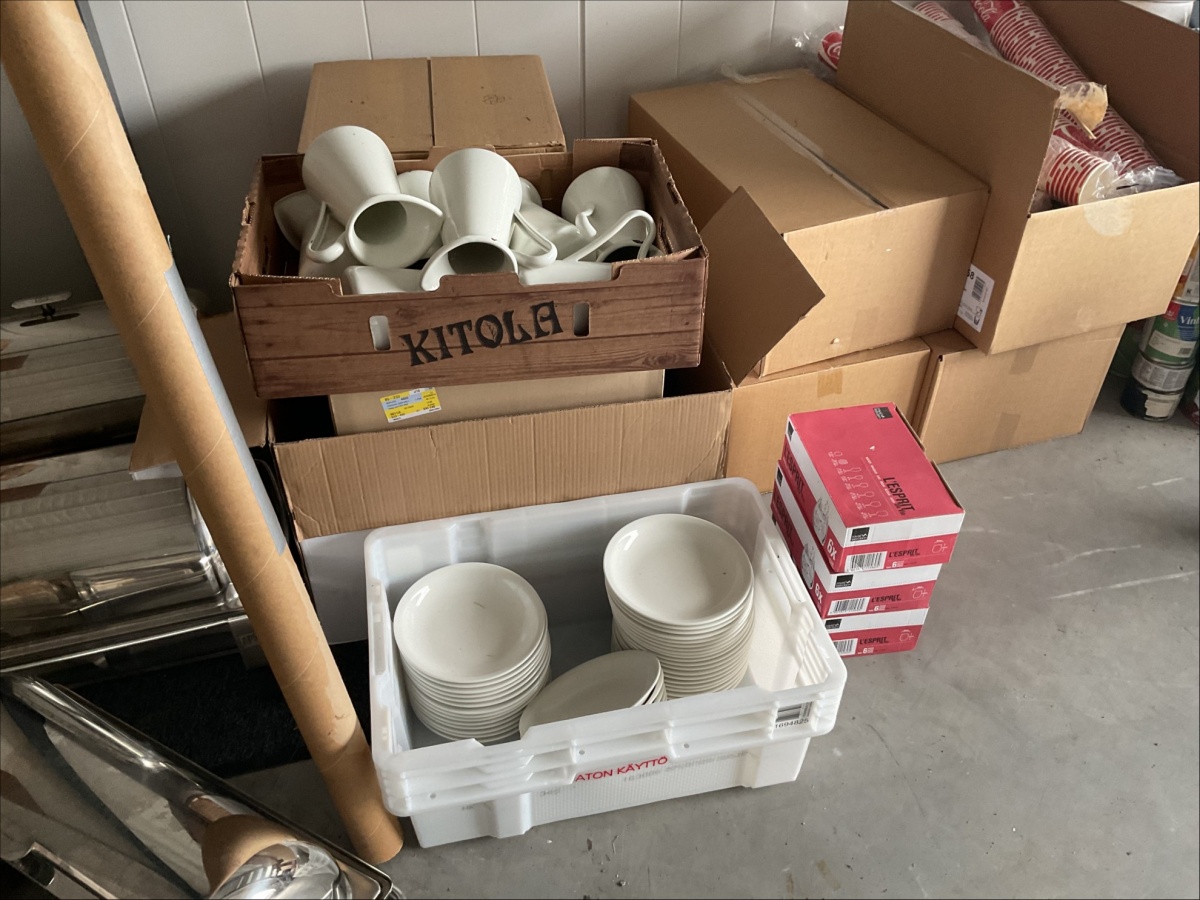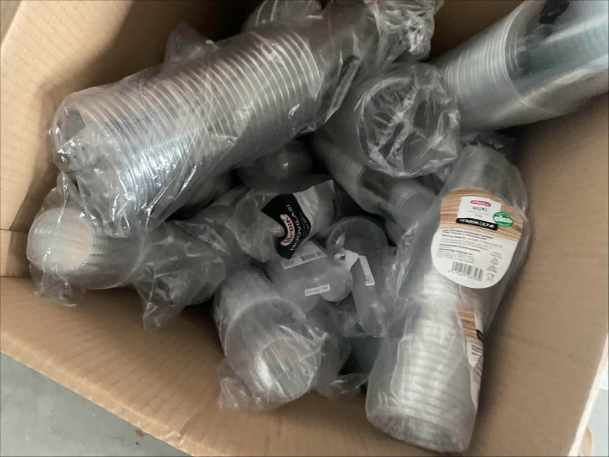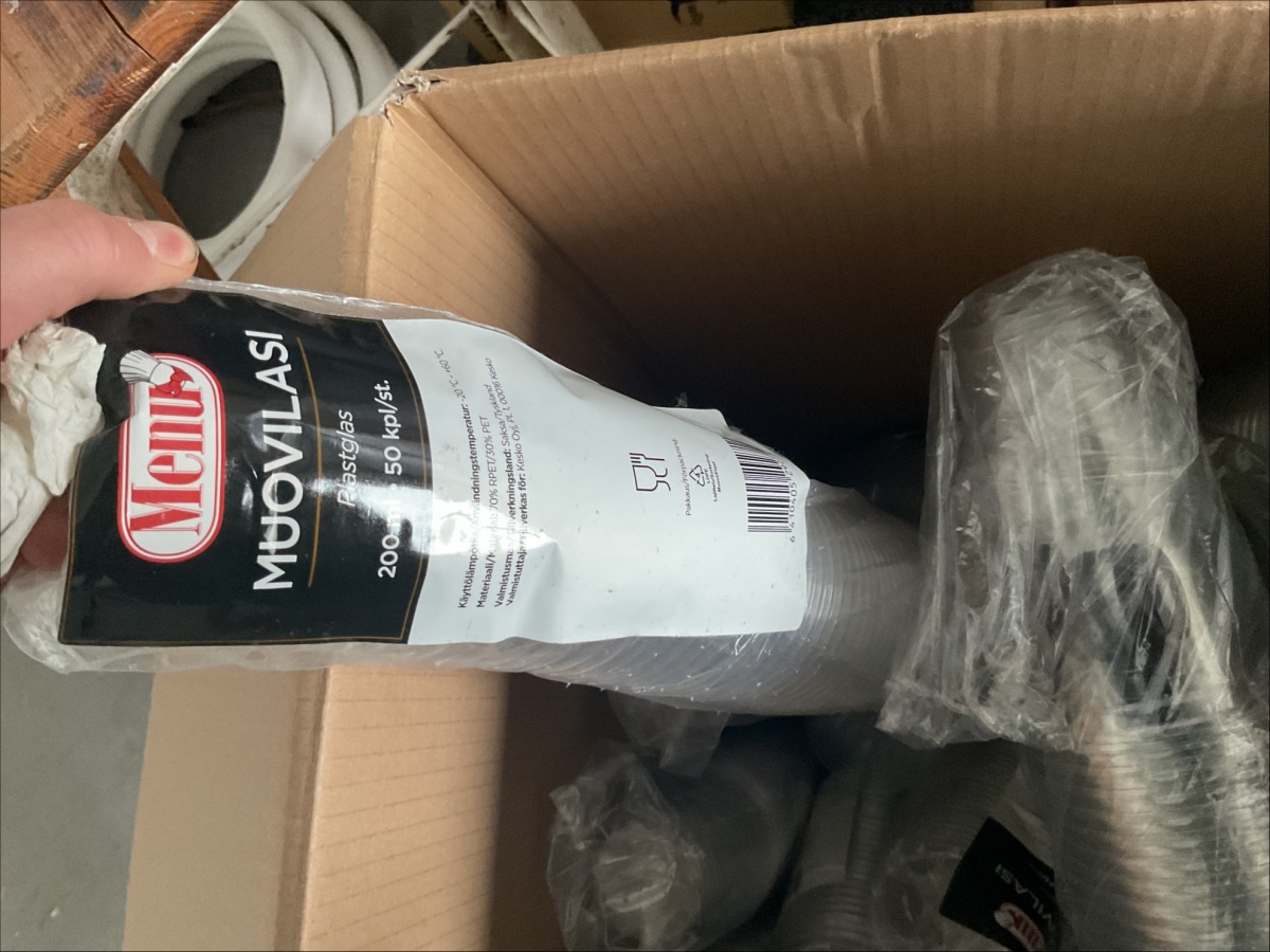 Myyntikohteet » 4. ReSa Oy:n konkurssipesä, UUSIKAUPUNKI (3442164-7), 08.04.2026 » 06. Muovilasit, lautaset, lasit yhteensä n. 15 laatikkoa / pakettia