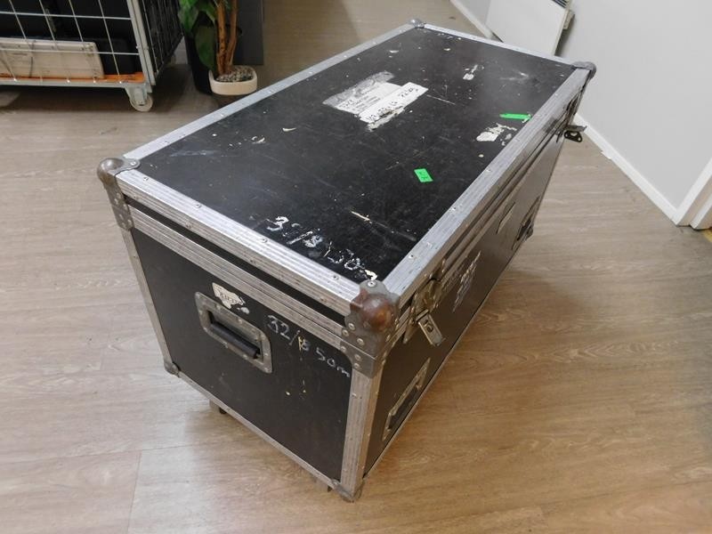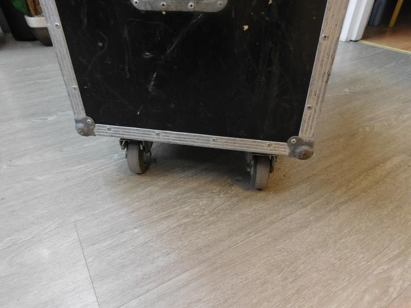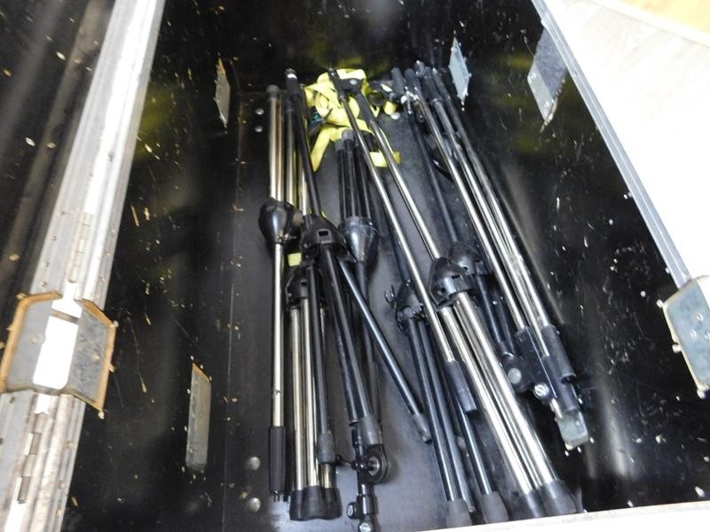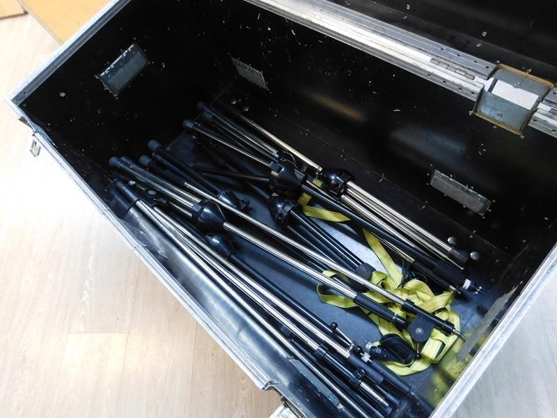 Erä mikrofonitelineitä (7 kpl) sekä roudauslaatikko pyörillä.