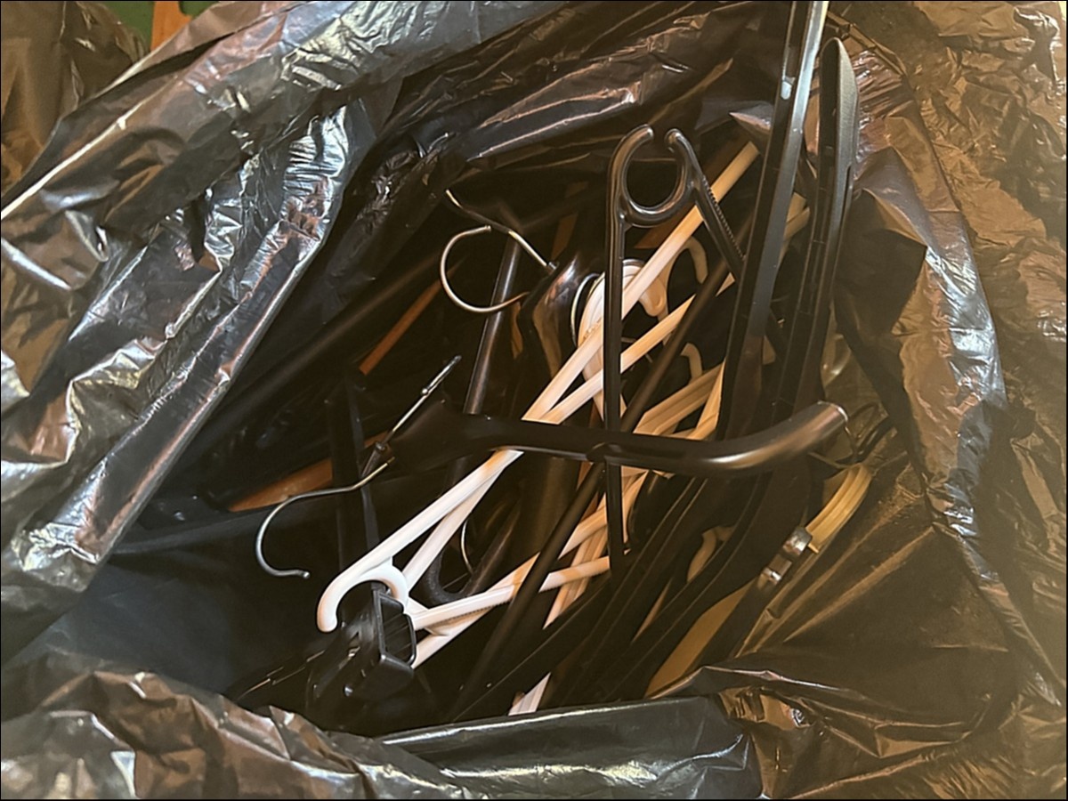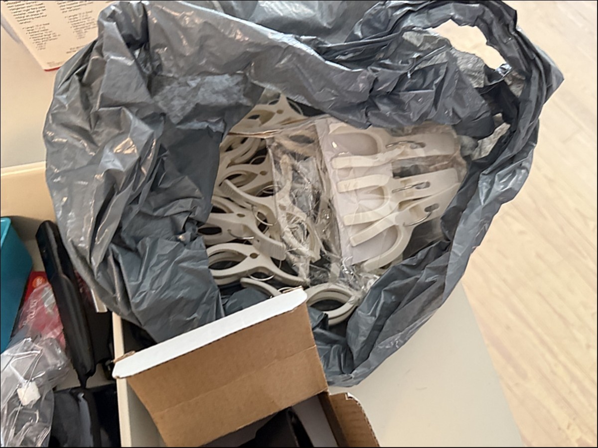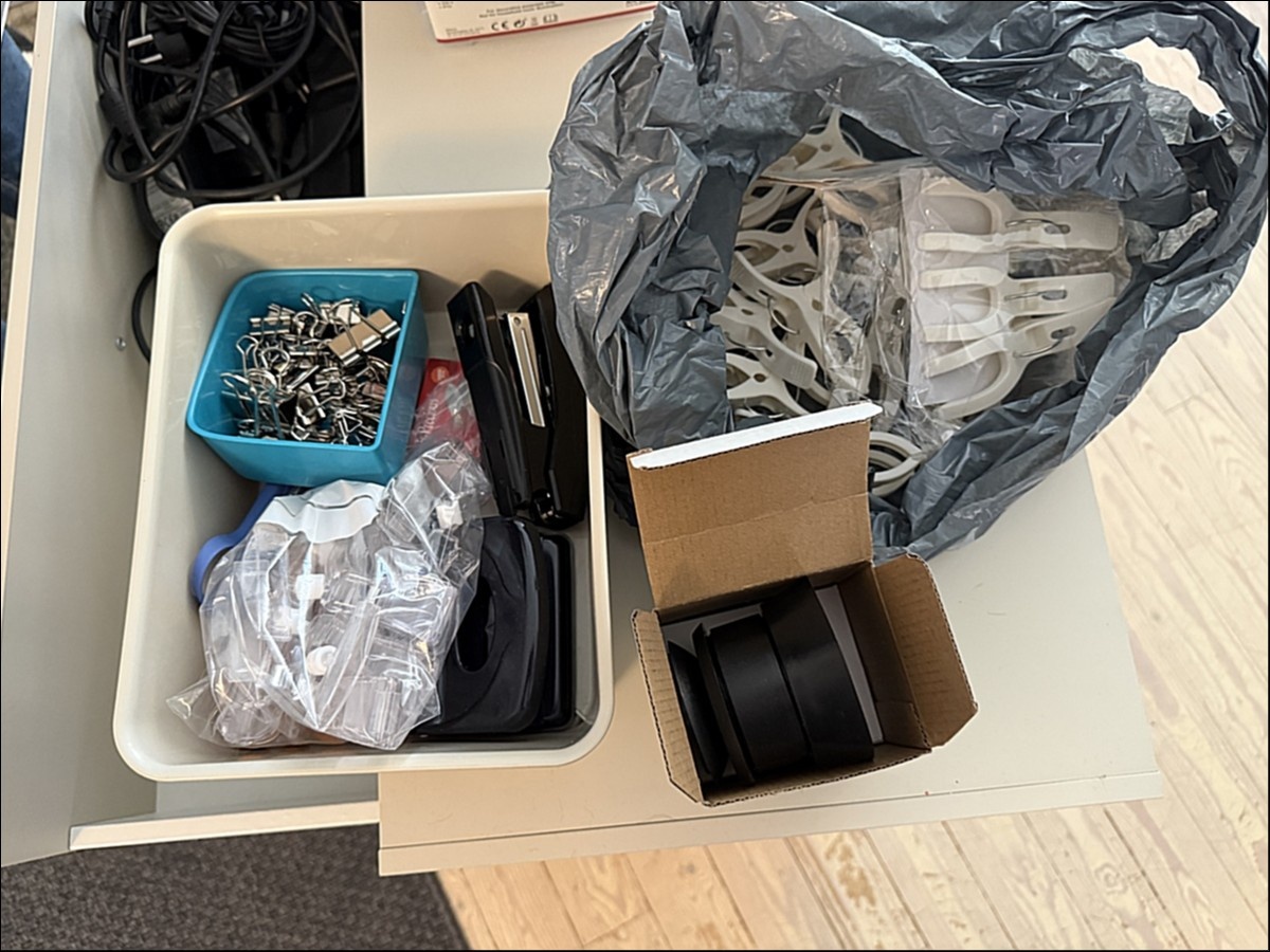 - Henkarit, 2 laatikkoa, 5 jätesäkkiä, metalliteline ja 3 kassia