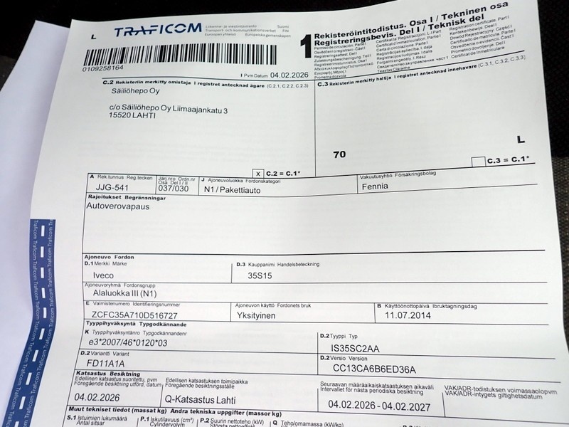 Myyntikohteet » 3. Säiliöhepo Oy:n konkurssipesä (2241416-7), LAHTI, 19.04.2026 » 50. Iveco 35S15 2.3 vm. 2014 pakettiauto JJG-541