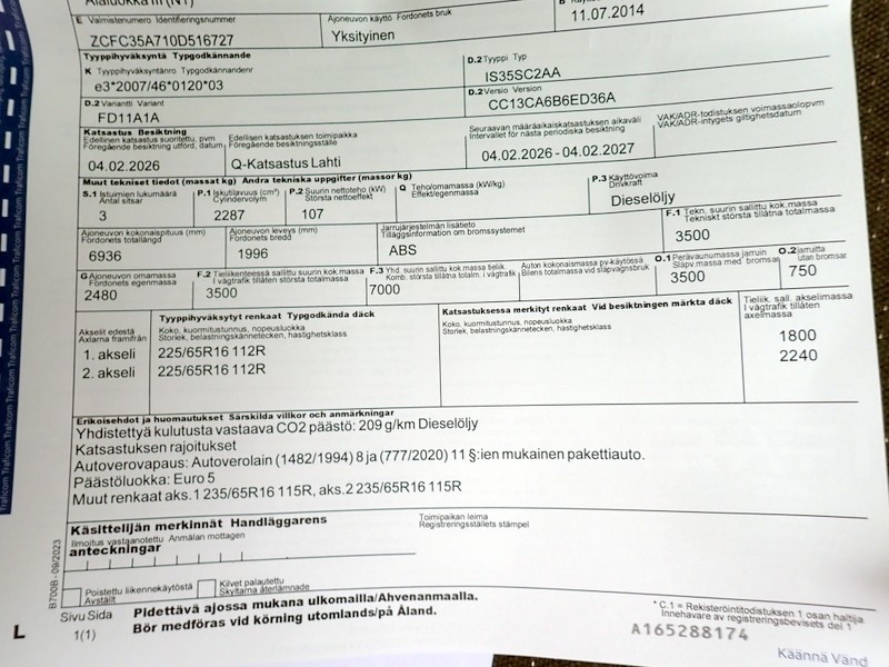 Tieliikenteessä suurin sallittu kokonaismassa (kg): 3 500
