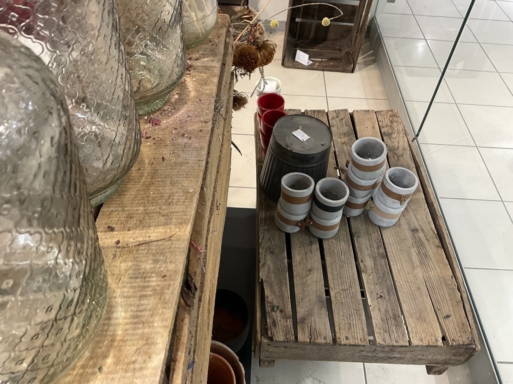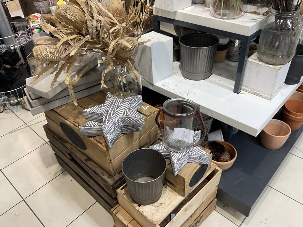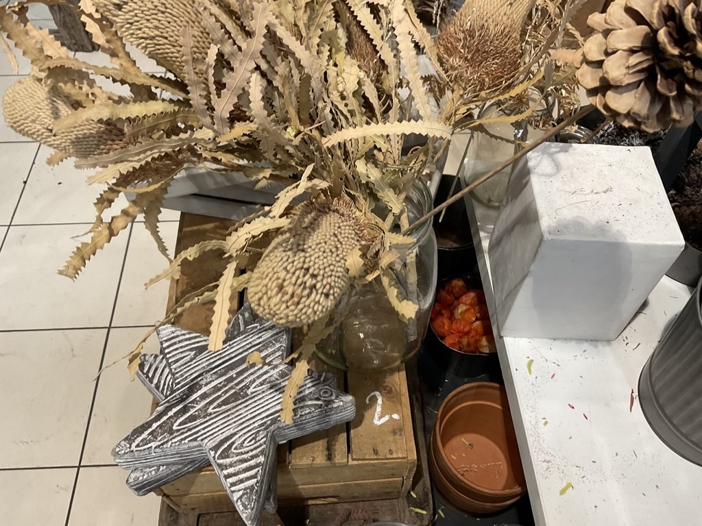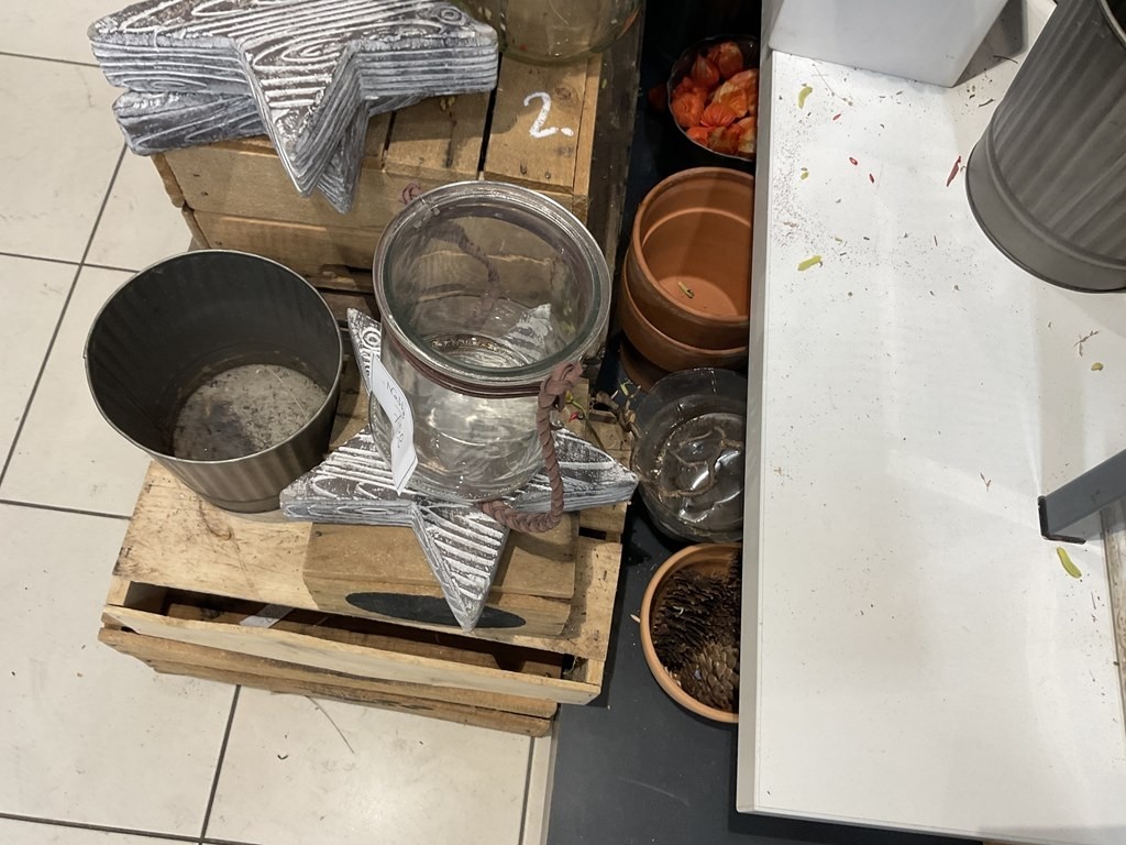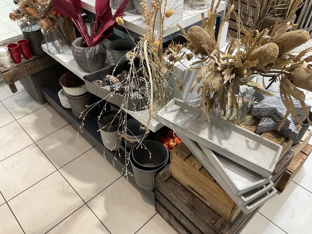 Myyntikohteet » Kukkakauppa Vivahde Oy:n konkurssipesä, TURKU (1993472-7), 17.04.2026 » 02. Esillepanopöytä jossa kukkasidonnan tarvikkeet, sisustusastiat ja kausikoristeet