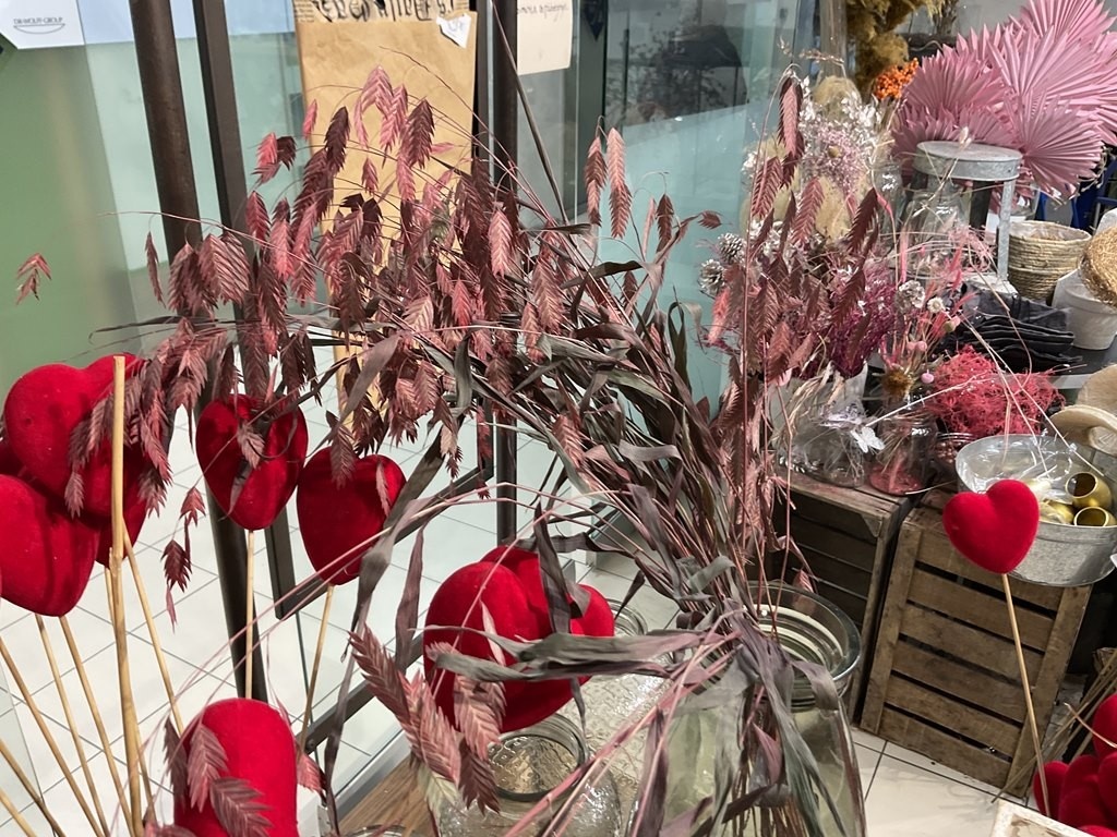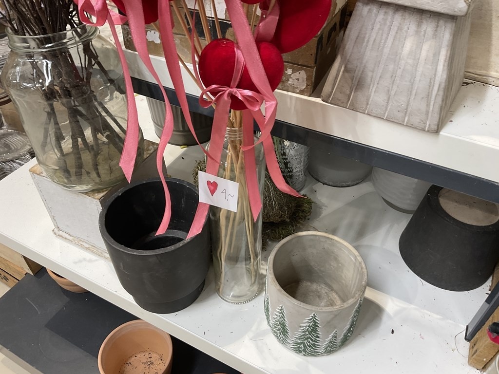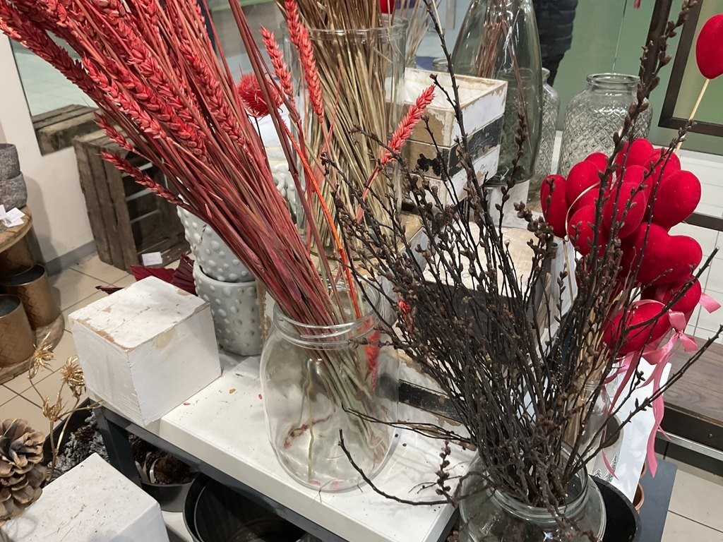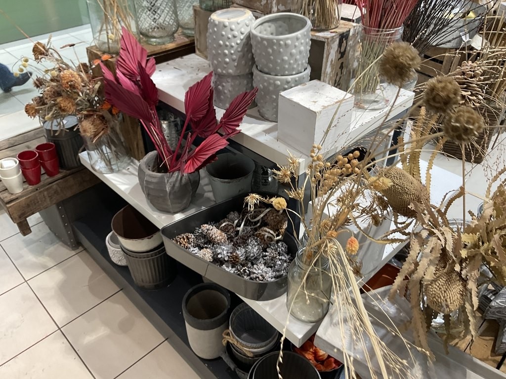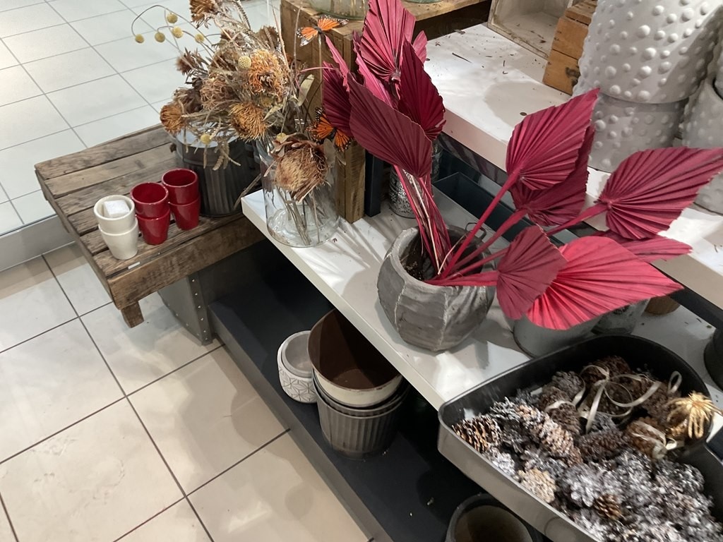 Myyntikohteet » Kukkakauppa Vivahde Oy:n konkurssipesä, TURKU (1993472-7), 17.04.2026 » 02. Esillepanopöytä jossa kukkasidonnan tarvikkeet, sisustusastiat ja kausikoristeet