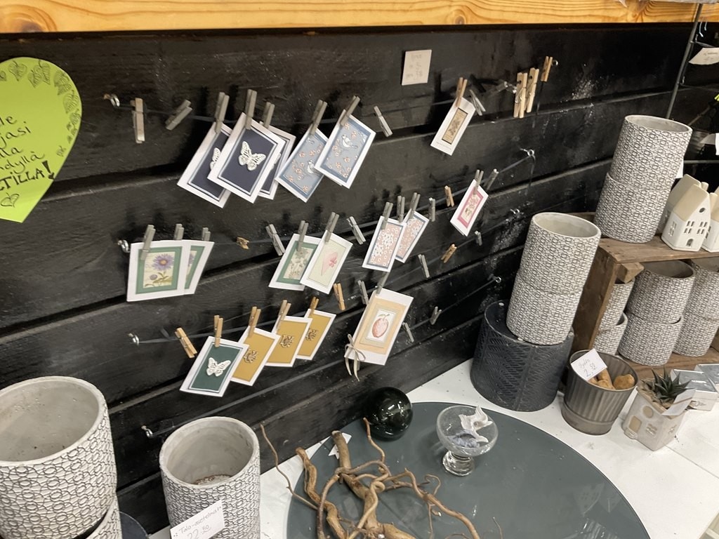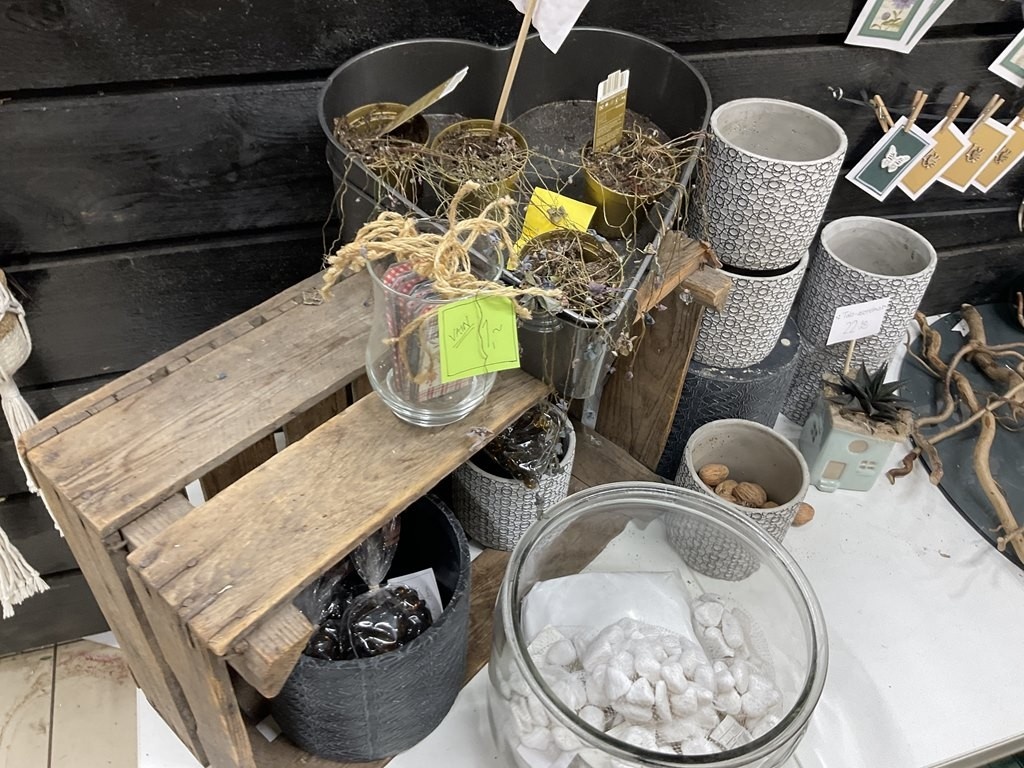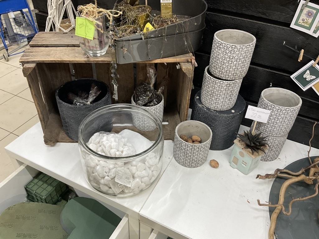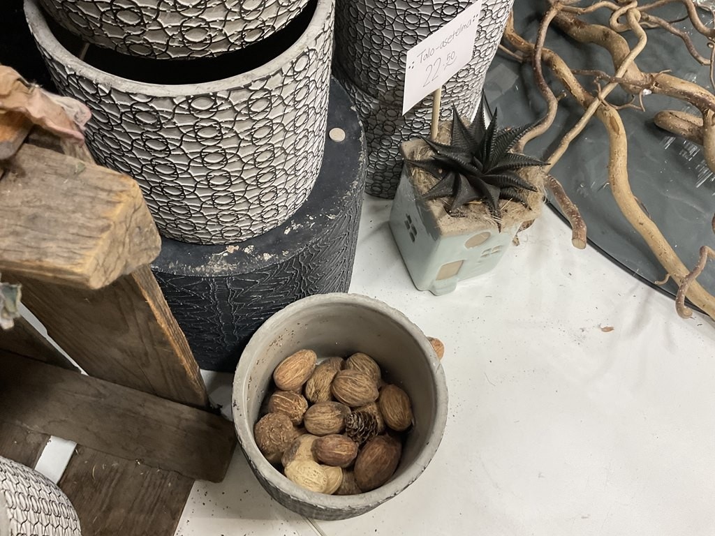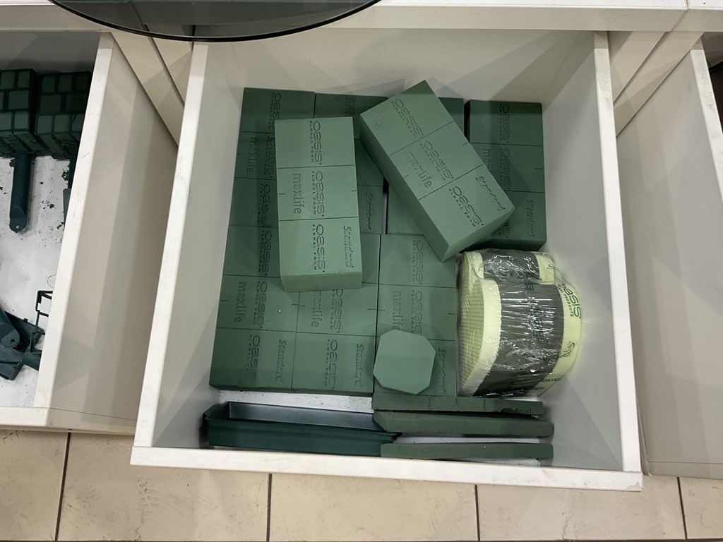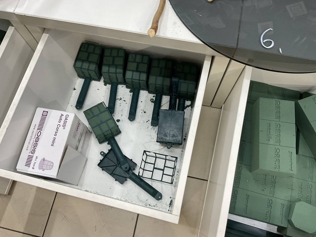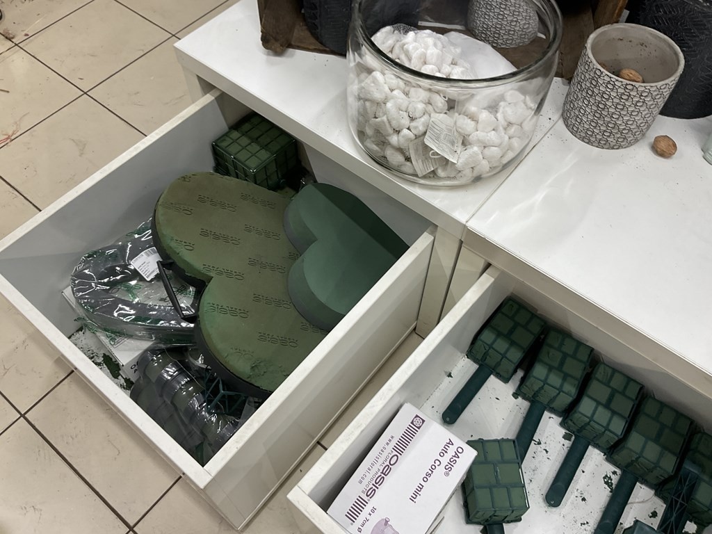 Myyntikohteet » Kukkakauppa Vivahde Oy:n konkurssipesä, TURKU (1993472-7), 17.04.2026 » 06. Kukkasidonnan tarvikkeet ja sisustus-somisteet laatikoissa ja seinällä