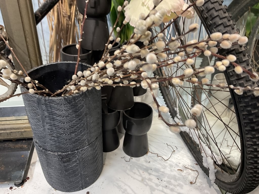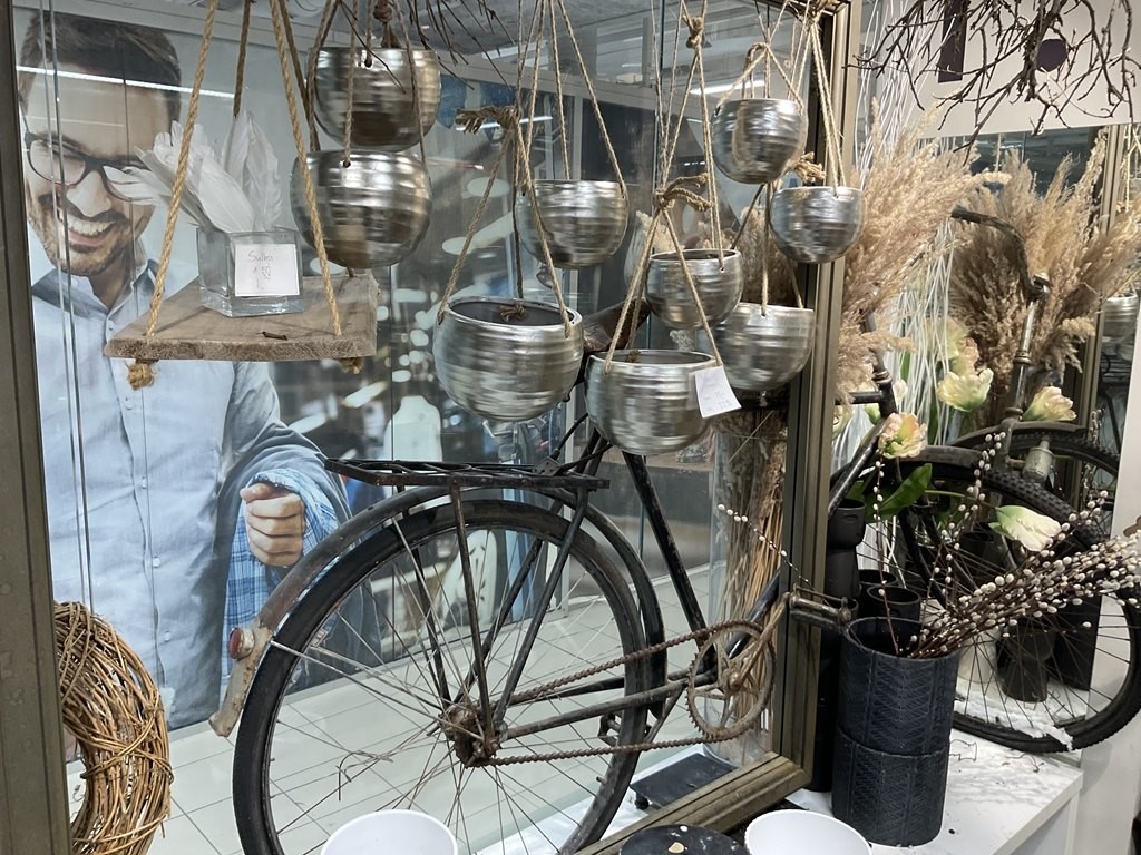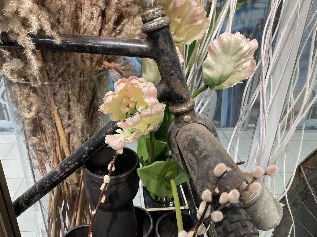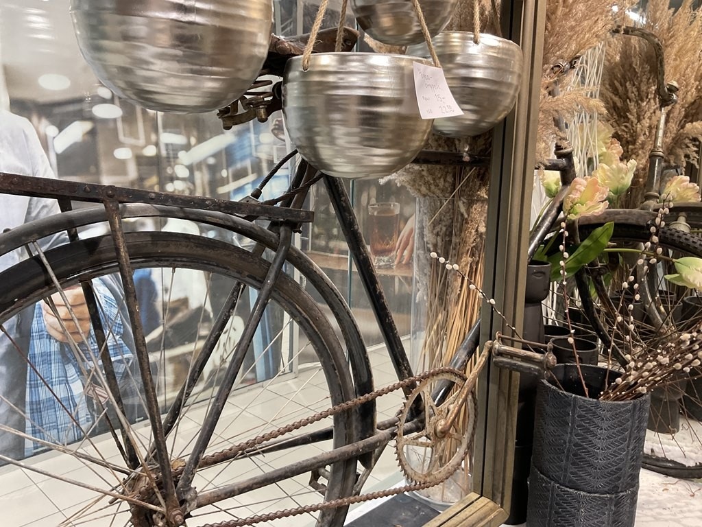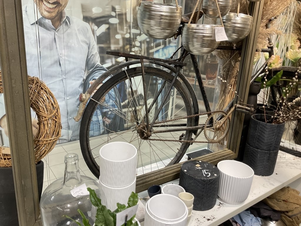 Myyntikohteet » Kukkakauppa Vivahde Oy:n konkurssipesä, TURKU (1993472-7), 17.04.2026 » 15. Eyyntiesillepanopöydät, jossa vanha polkupyörä, keraamiset ruukut