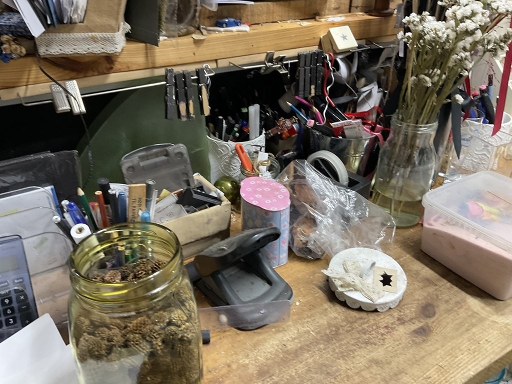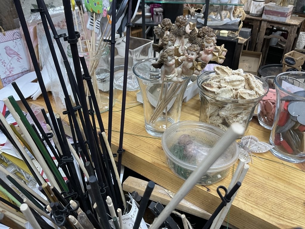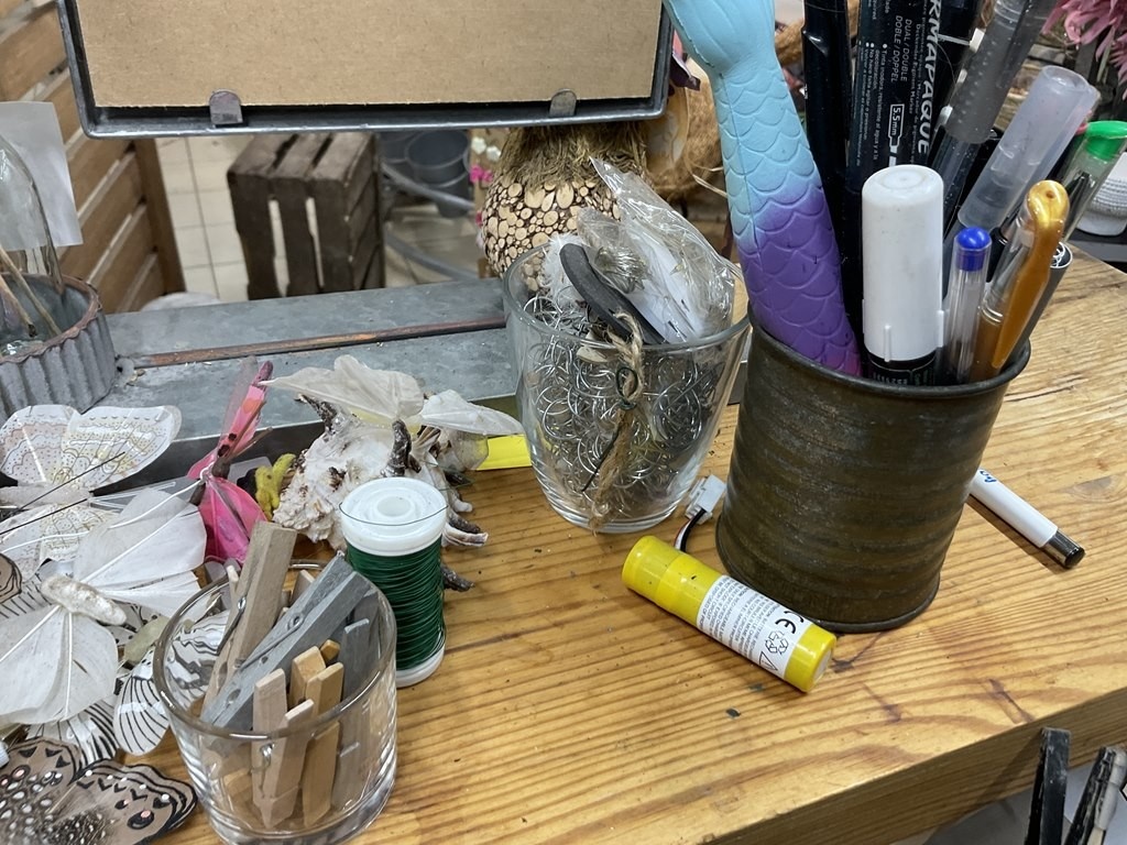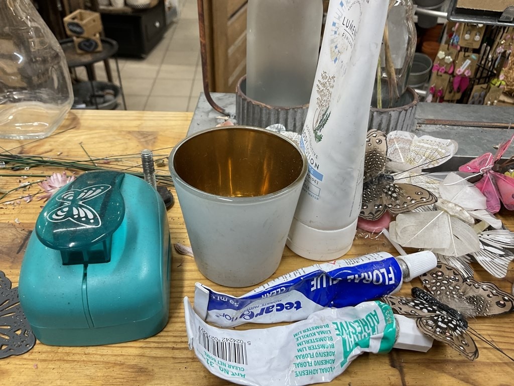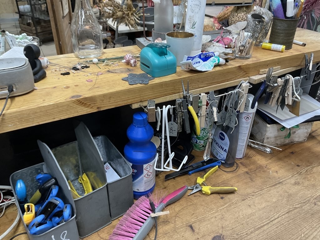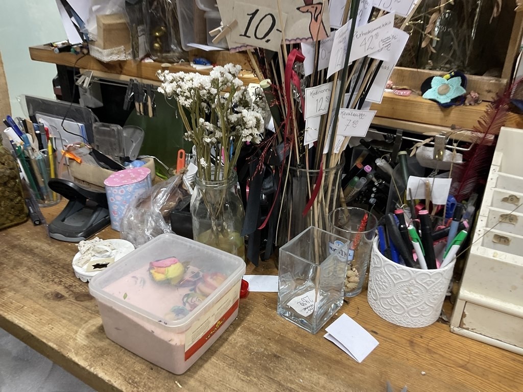 Myyntikohteet » Kukkakauppa Vivahde Oy:n konkurssipesä, TURKU (1993472-7), 17.04.2026 » 18. Floristin työpisteen ja askartelutarvikkeet pöydällä