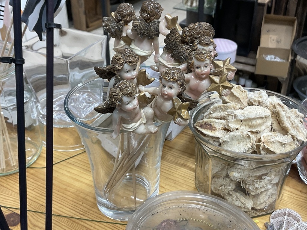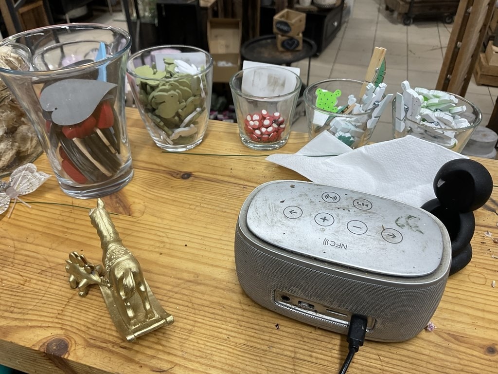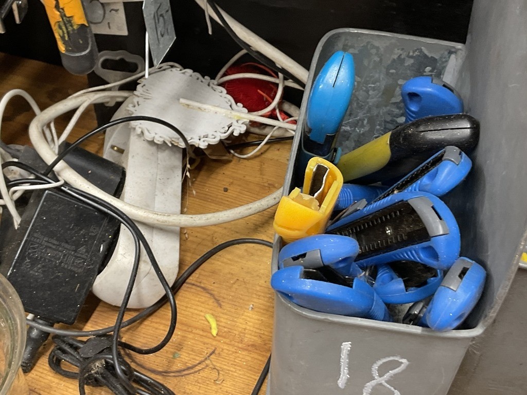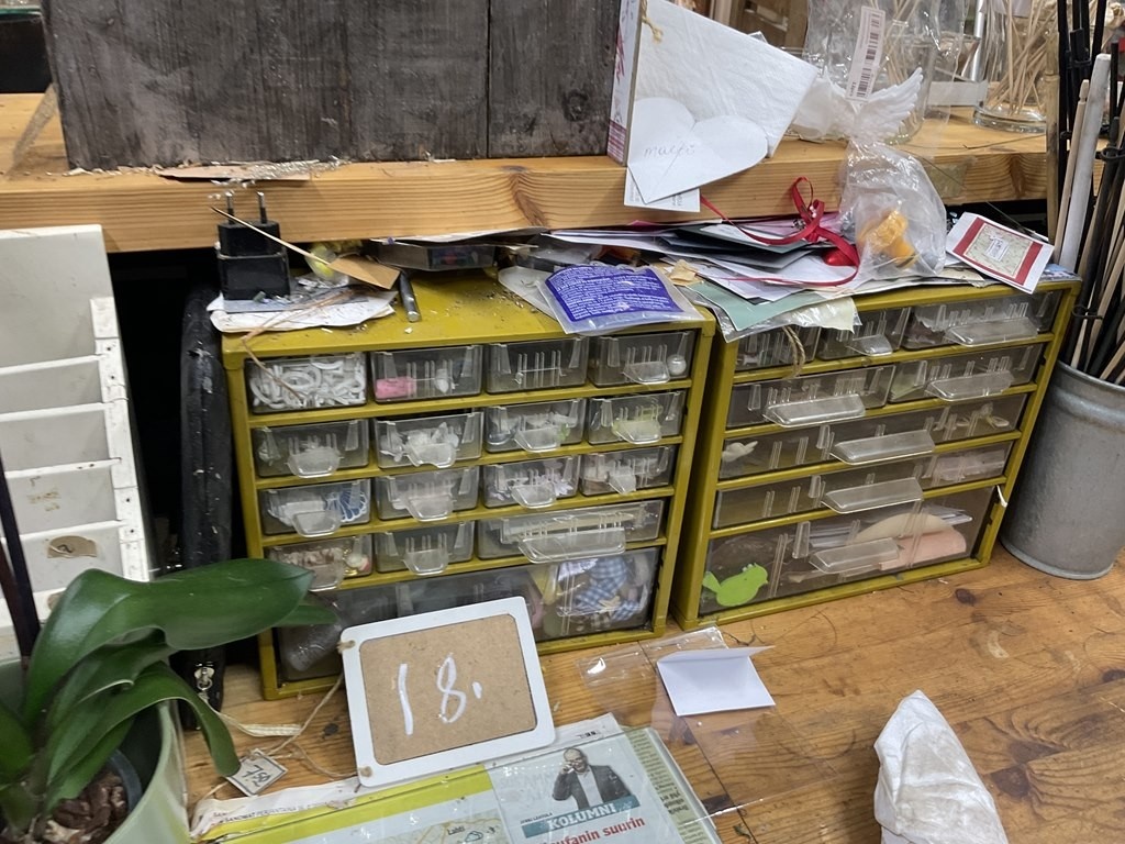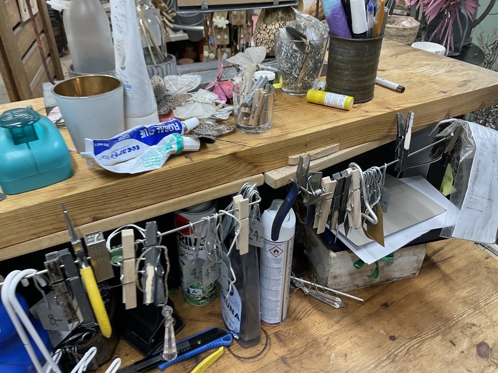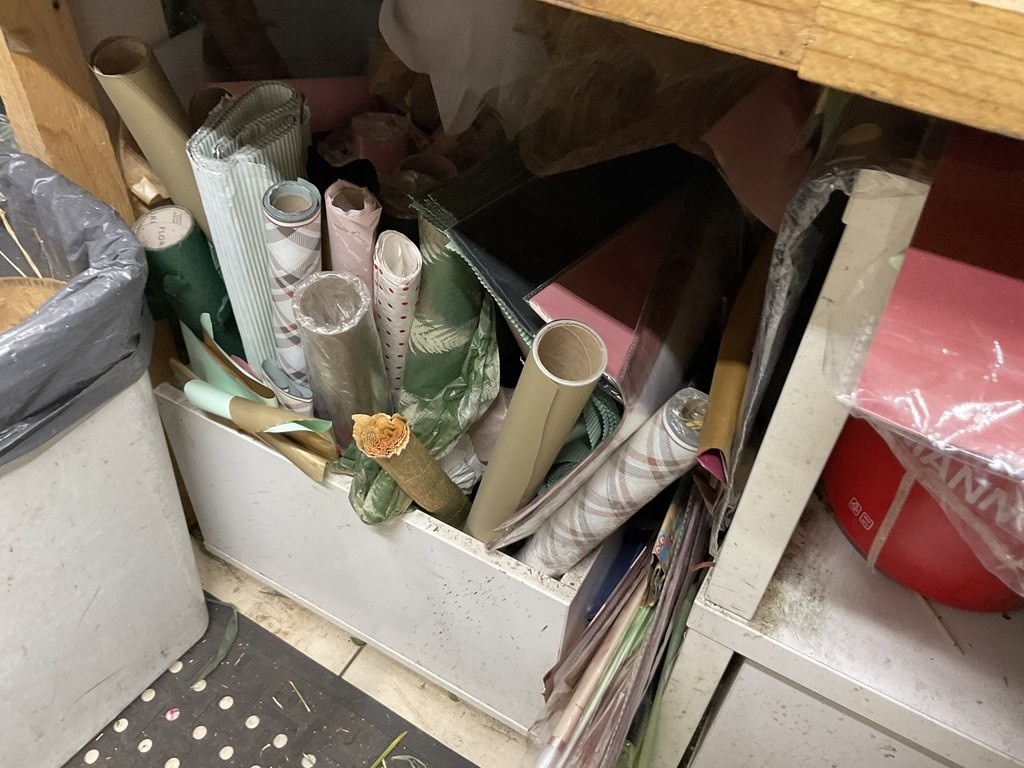 Myyntikohteet » Kukkakauppa Vivahde Oy:n konkurssipesä, TURKU (1993472-7), 17.04.2026 » 18. Floristin työpisteen ja askartelutarvikkeet pöydällä