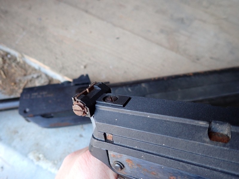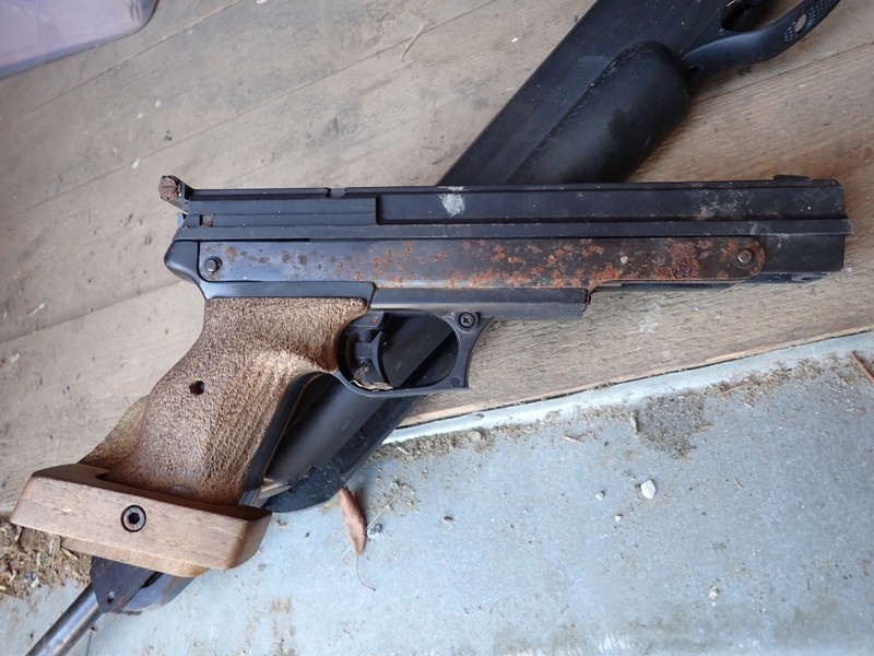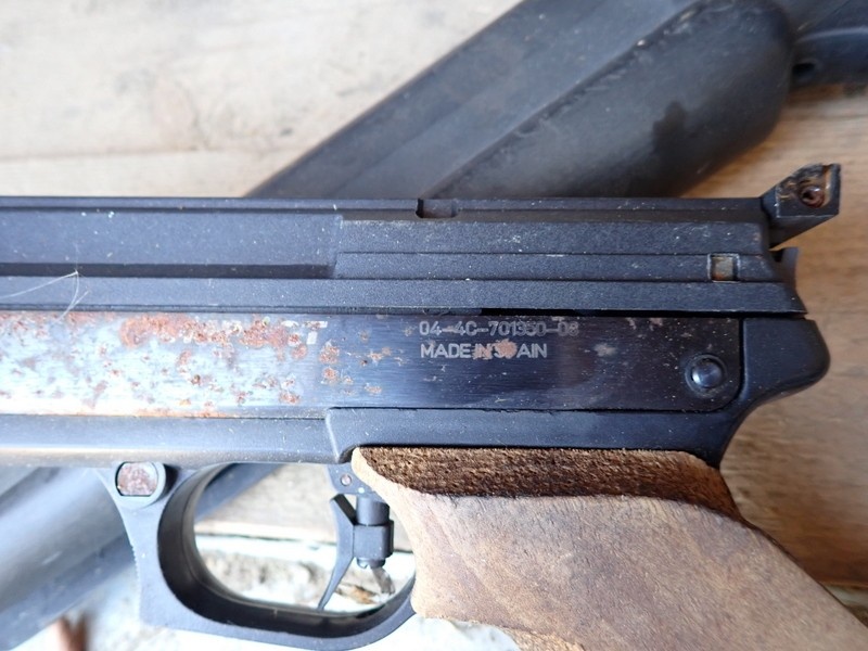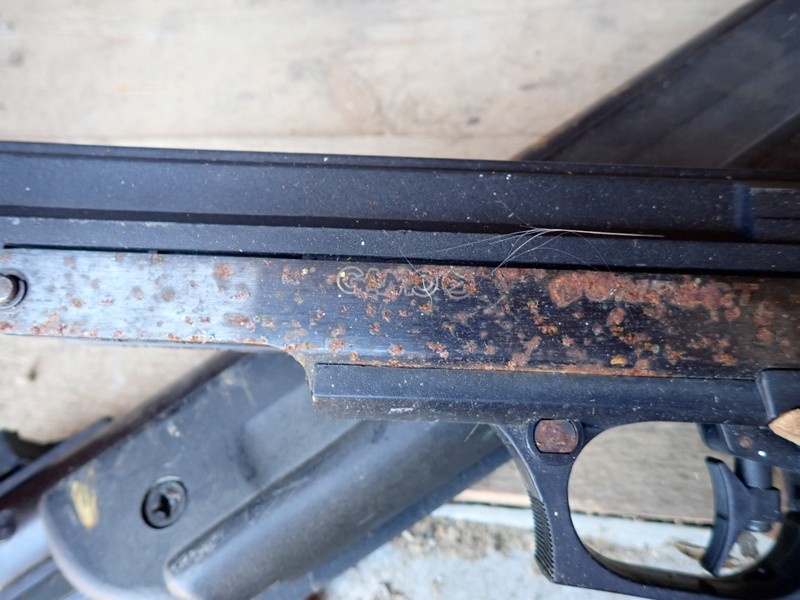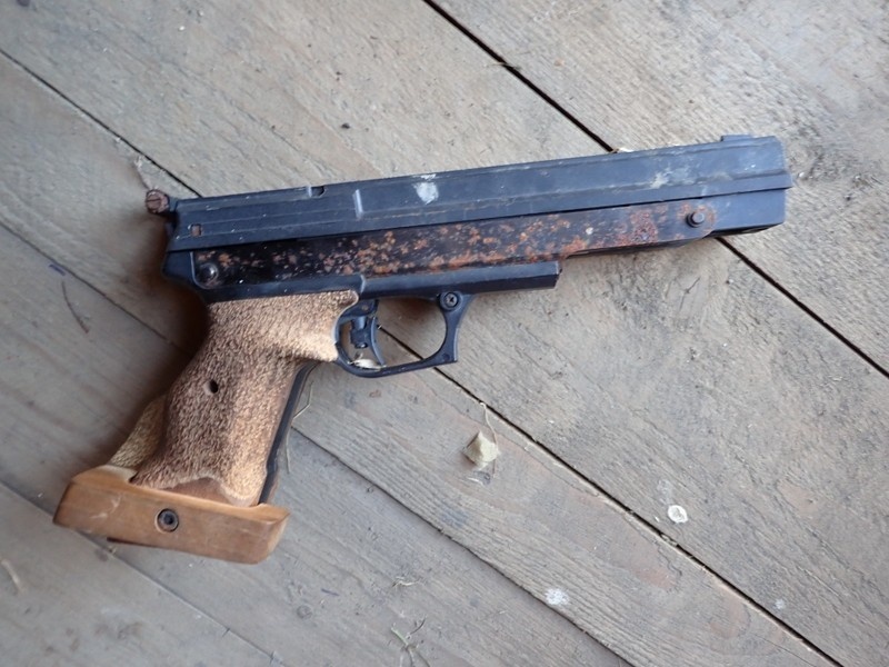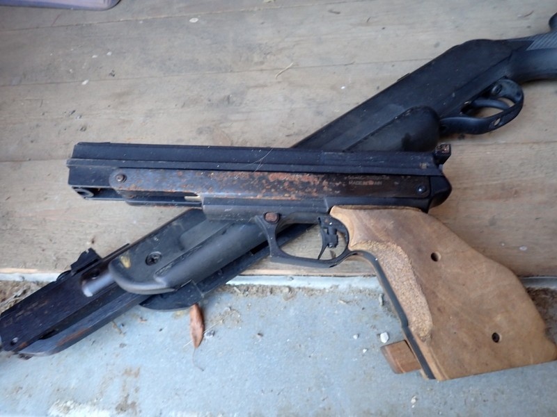 Ilmakivääri ja ilmapostooli. Molemmissa hieman pintaruostetta.