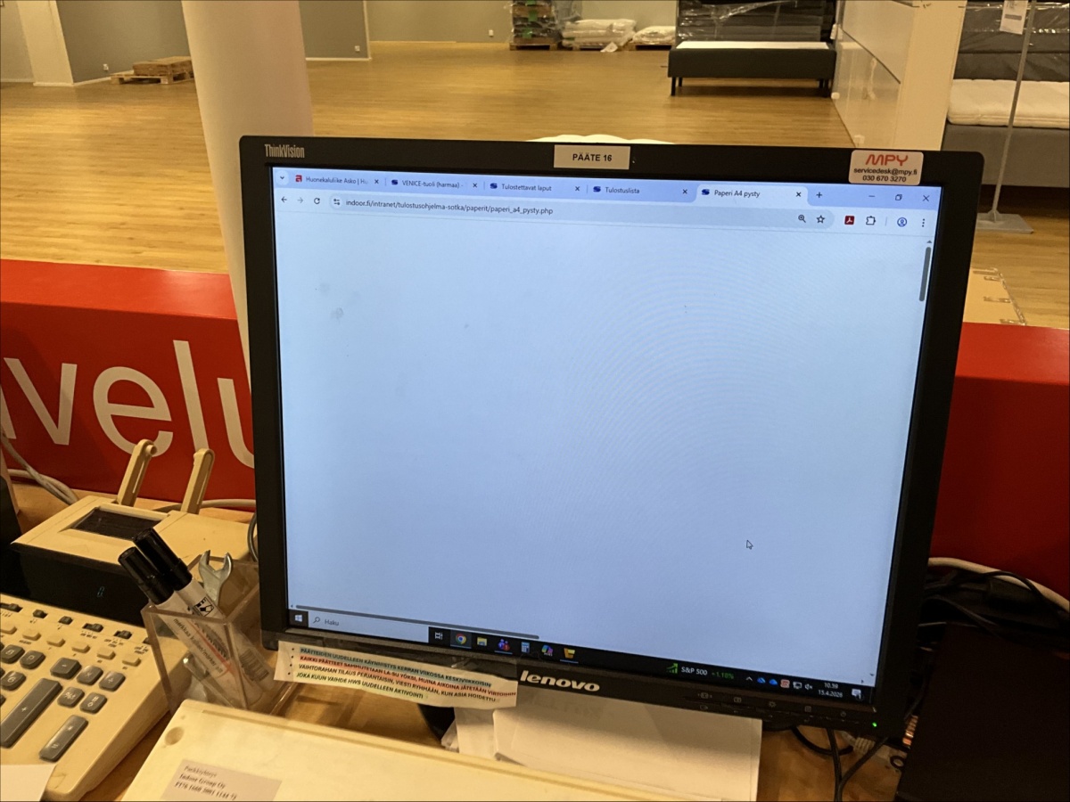 HUOM! OSTAJA VARAA TARVITTAVAN KALUSTON / AJAN NOUTOPÄIVÄNÄ. MYYTÄVÄT KOHTEET SIJAITSEVAT TOISESSA KERROKSESSA (PAITSI KOHTEET R001.-R003.) HYLLYT, MATTOPÖYDÄT YM. MYYMÄLÄKALUSTEET PURETTAVA JOTTA NE MAHTUVAT PIENEEN TAVARAHISSIIN JOSTA PÄÄSEE LASTAUSLAITURILLE. (YKSI NOSTO-OVI)