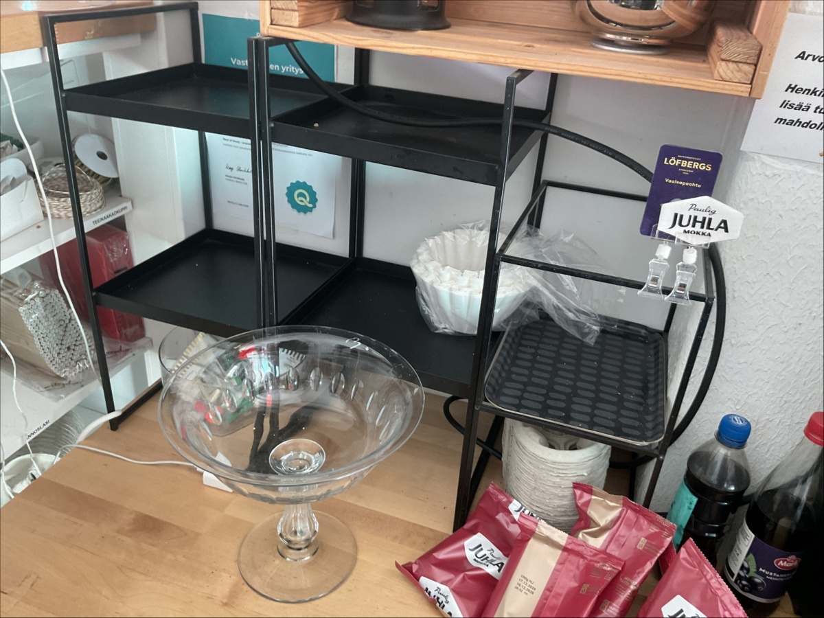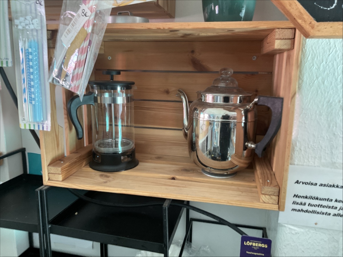 Myyntikohteet » 1. KakkuAnne Tmi:n konkurssipesä, LIETO (2405830-3), 22.04.2026 » 03. Liitutaulu, mustat säilytystelineet 2 kappaletta, kahvipannu ja kahvinkeitin