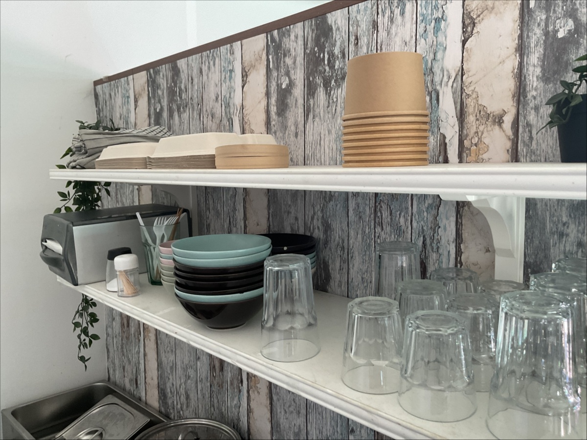Keittohaude, tarjottimet 10 kappaletta, lautaset ja aterimet, hyllyllä olevat lasit / kupit ym.
