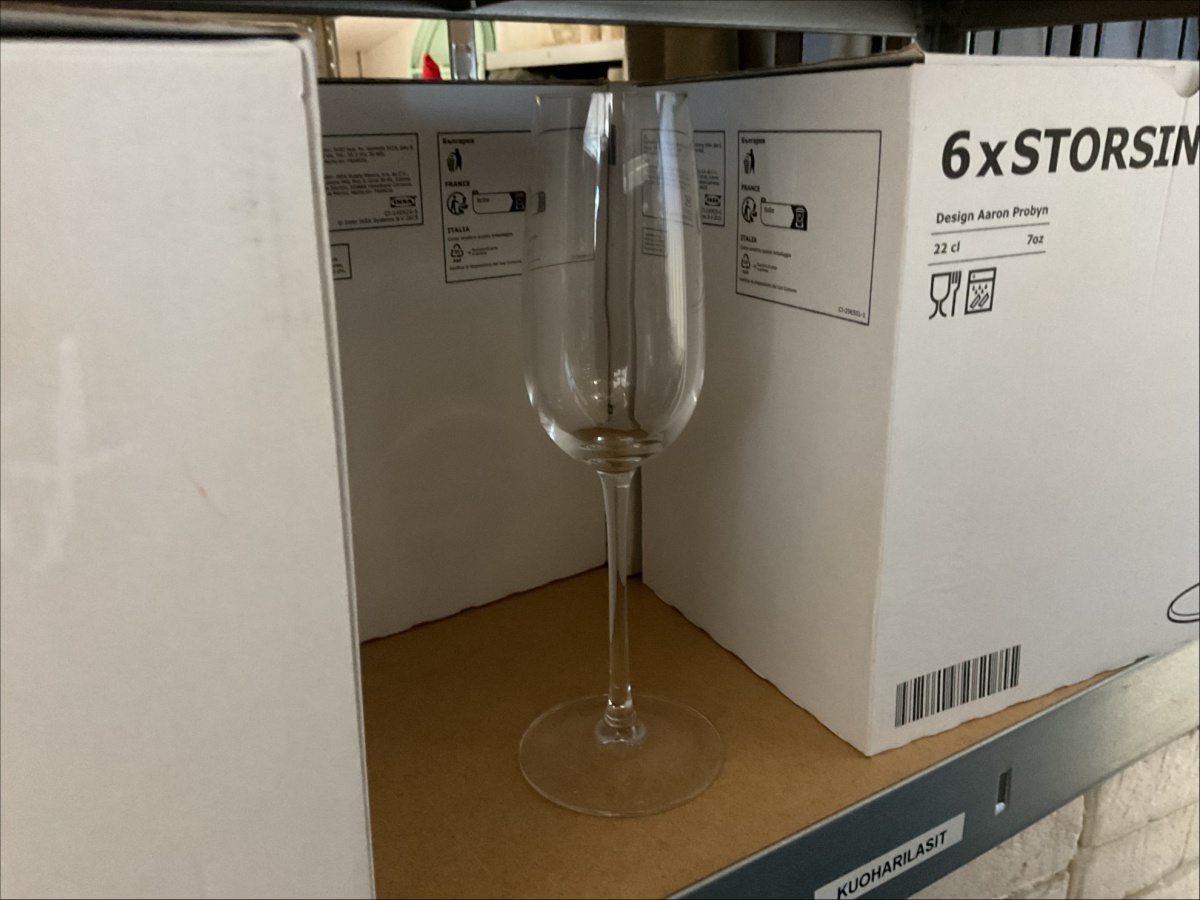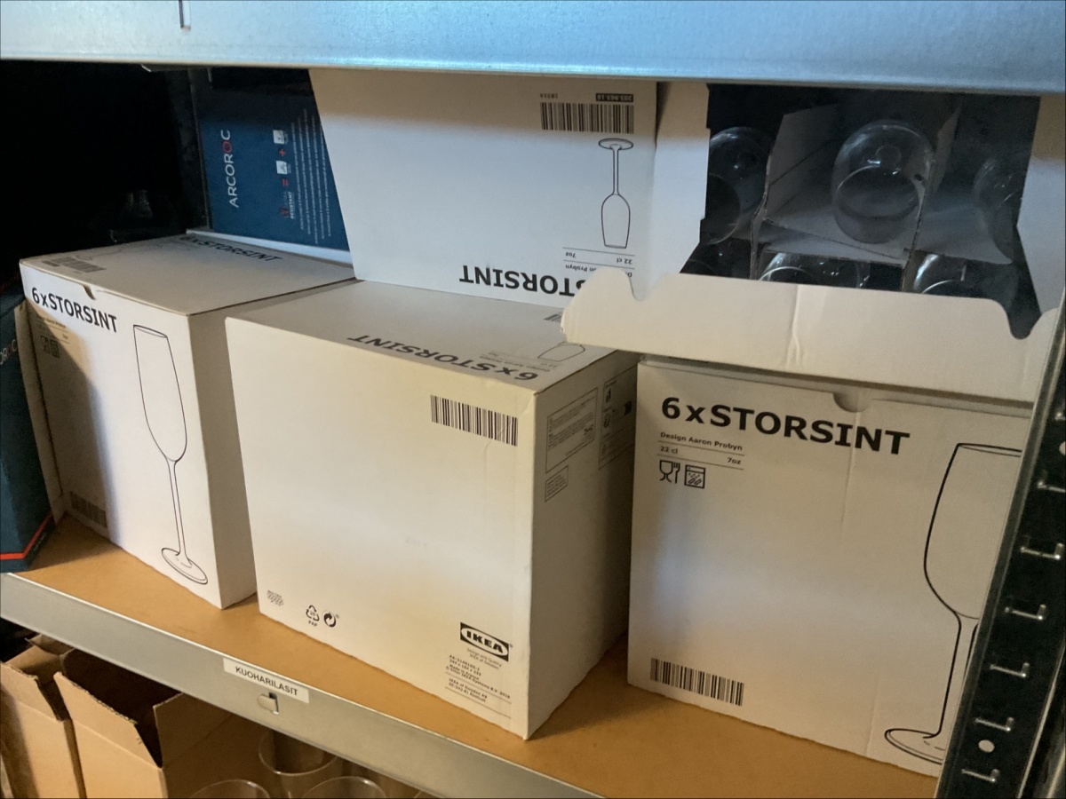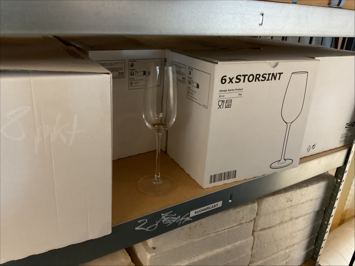 Myyntikohteet » 2. KakkuAnne Tmi:n konkurssipesä, LIETO (2405830-3), 22.04.2026 » 66. Kuudella hyllytasolla olevat samppanjalasit 20 pakettia, maljakot 24 kappaletta, samppanjalasit 30 kappaletta, sekalaiset kahvikupit ja juomalasit (pieni määrä)