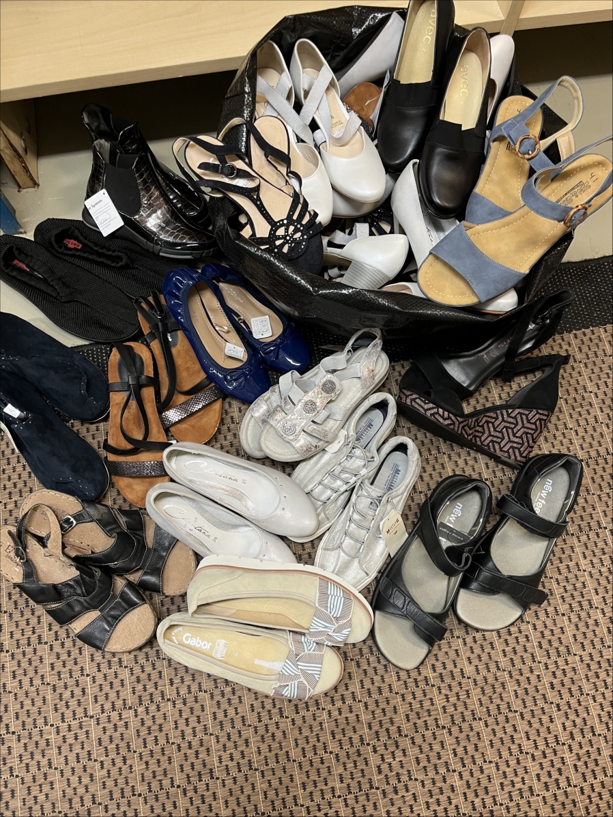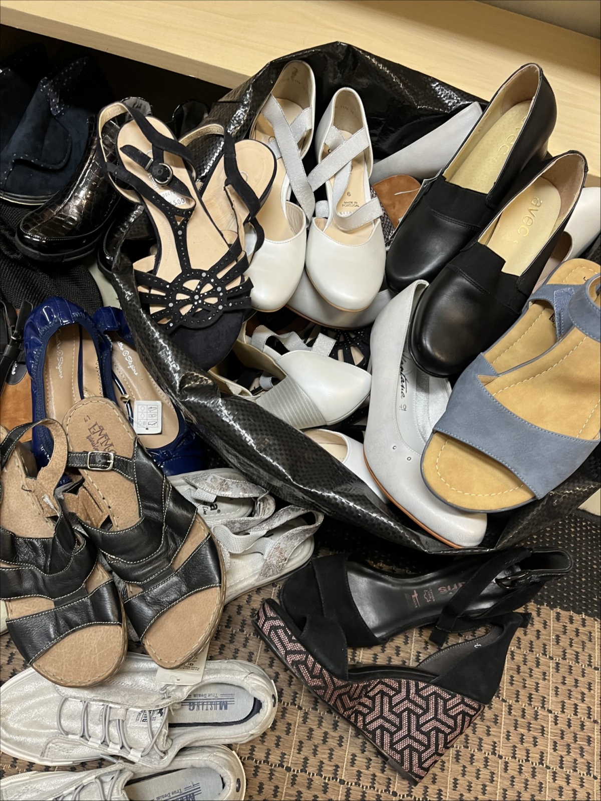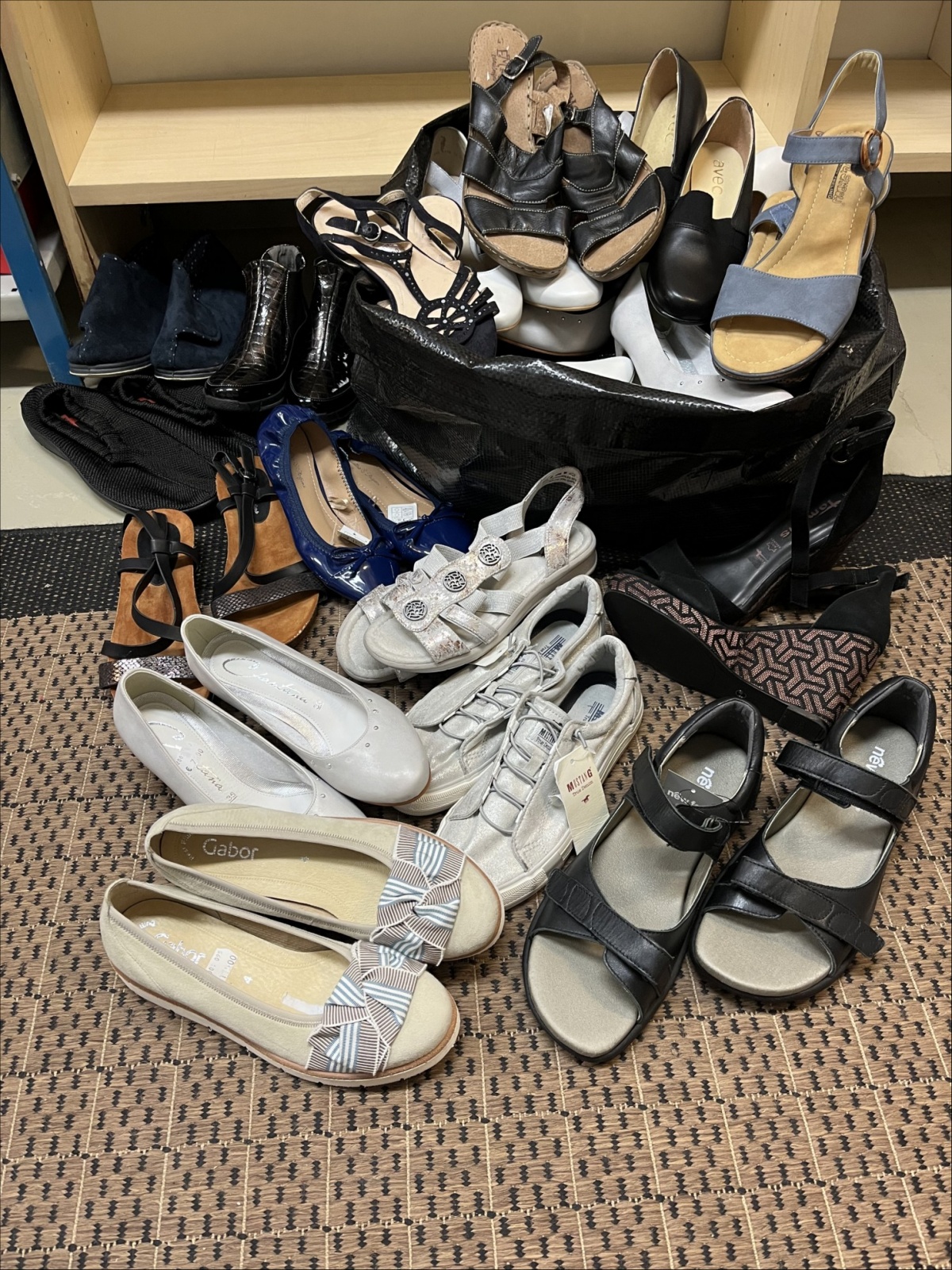 Noin 30 paria erilaisia, pääasiassa naistenkenkiä. Useita merkkejä muun muassa Sun&Shadow, Ara, New Feet, Avec, Mustang, Gabor ja Ilves. Eri kokoja, muun muassa 35, 39, 41 ja 43.